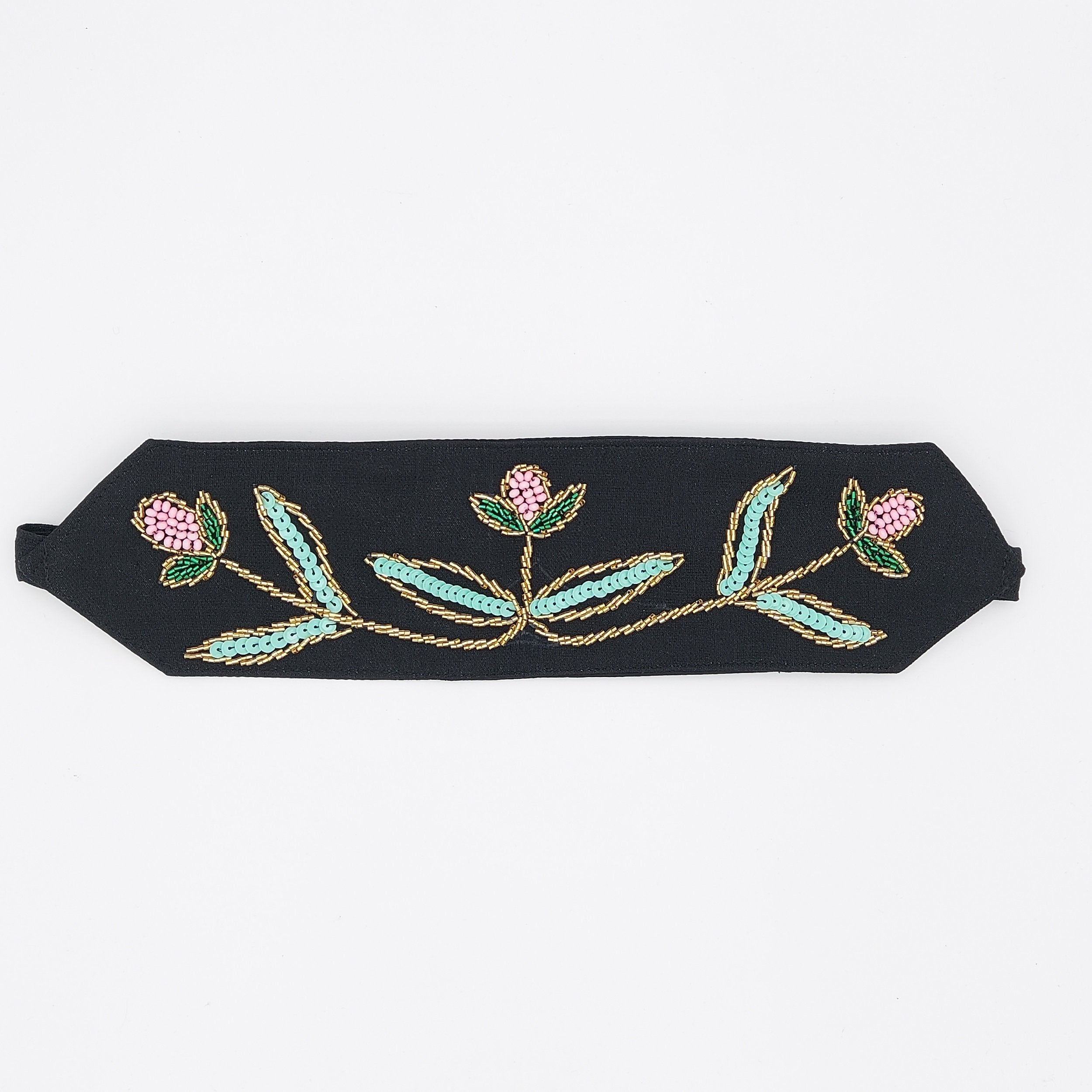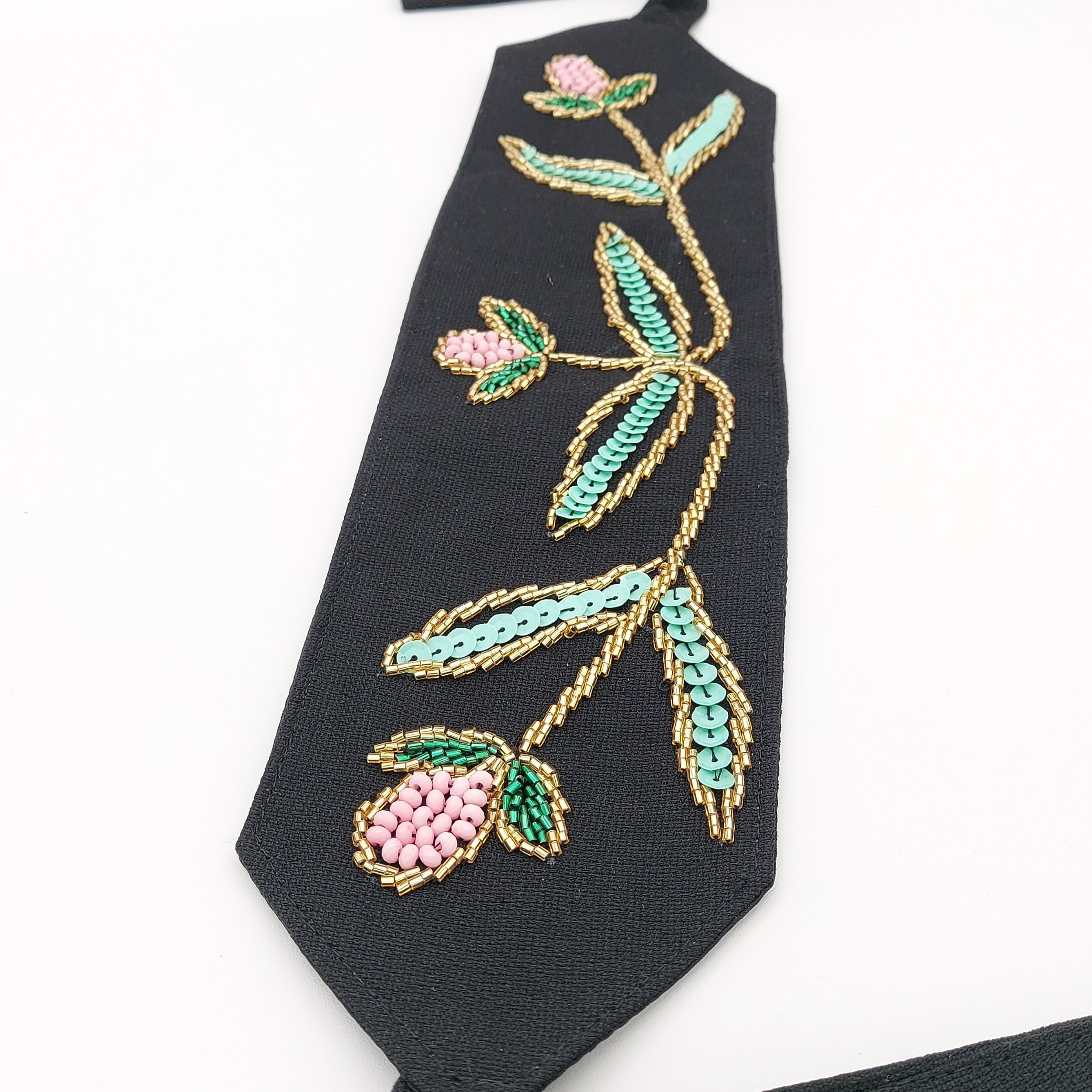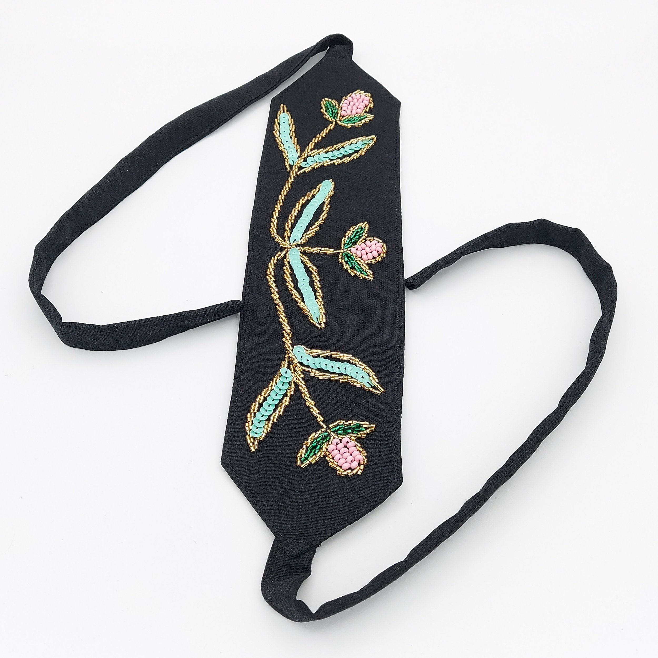 This hand-beaded belt measures 53 inches in total length and has a width of 3 3/4 inches.