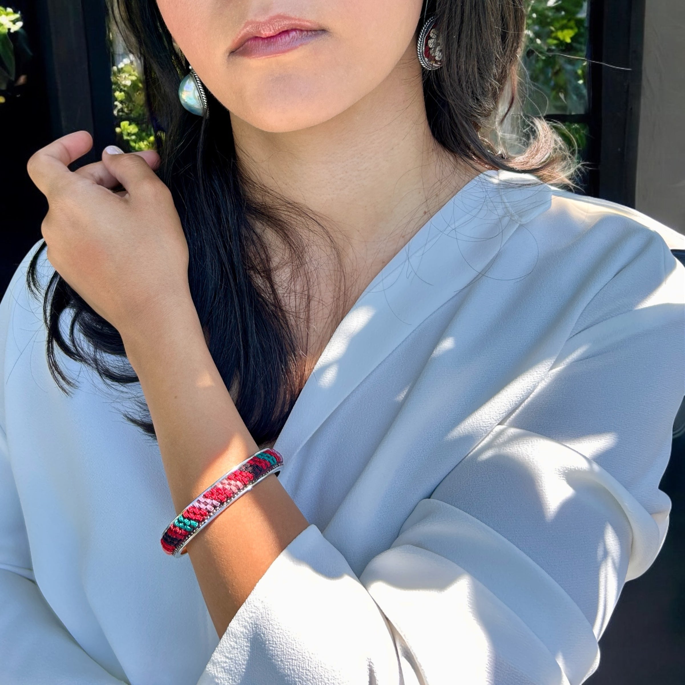 This Bangle is crafted from a high-quality, nickel-free alloy, ensuring comfort and safety for sensitive skin. Its intricate embroidery adds a touch of artisanal elegance, making it a standout accessory for any outfit. Designed with adjustability in mind, this bangle offers a customizable fit for all wrist sizes. To maintain its pristine condition, it is recommended to avoid contact with water, preserving the delicate embroidery and metal finish. Perfect for those seeking a blend of traditional craftsmanship and modern wearability, this Bangle is a versatile addition to your jewelry collection.
