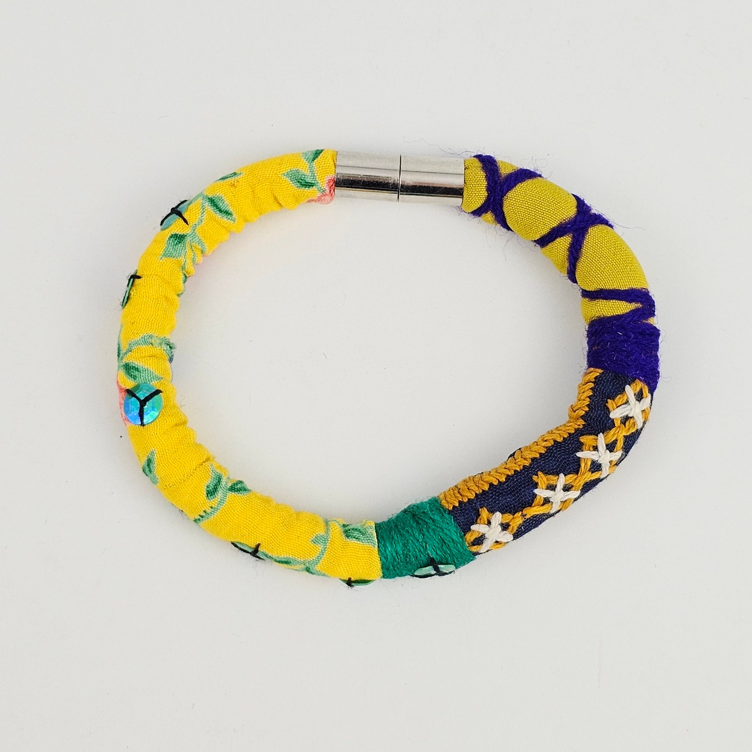 This Kowli Bracelet, crafted from fabric and measuring 9 inches in length, features magnetic clasps for easy wear. It makes an ideal gift for her on nearly any occasion. To maintain its quality, avoid exposure to water, harsh chemicals like perfume and lotions, and store it in a plastic bag when not in use. Clean gently without abrasive materials to preserve its appearance.