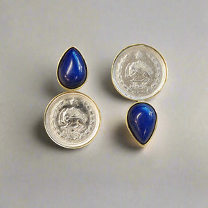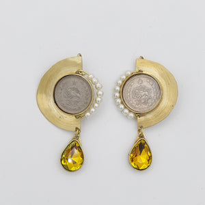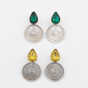 Pahlavi Coin Earrings with Round Gems and Crystals