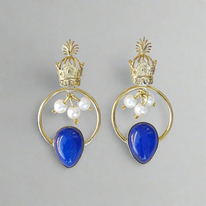 Blue Crown Brass Earrings with Pearl