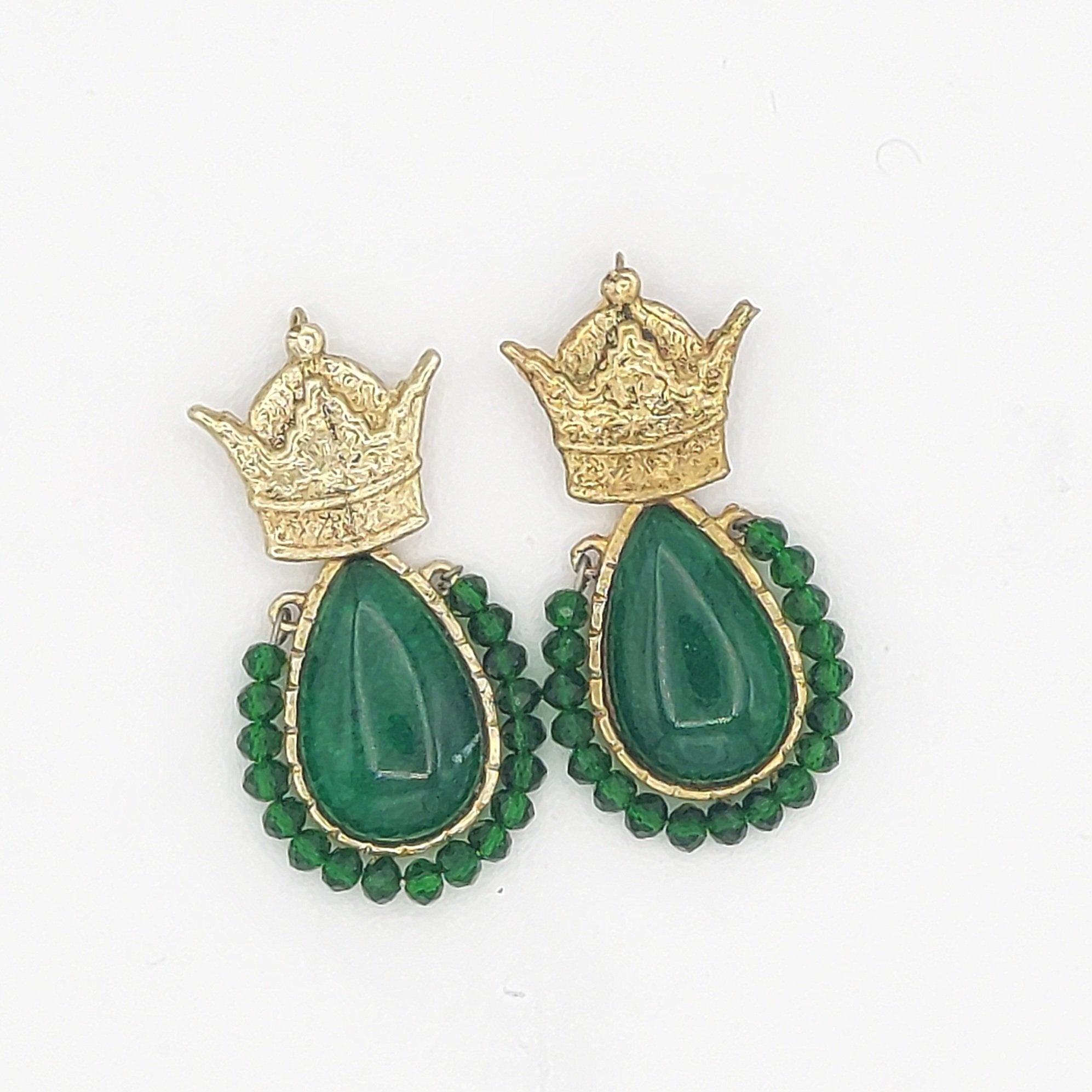 These Crown Brass Jade Stone Earrings are handmade with high-quality brass, measuring 2 inches long and 1 inch wide. Designed for the earlobe with a push-back closure, they combine durability and style. To maintain their finish, avoid water, chemicals, and abrasive cleaners, and store them in a sealed bag when not worn.