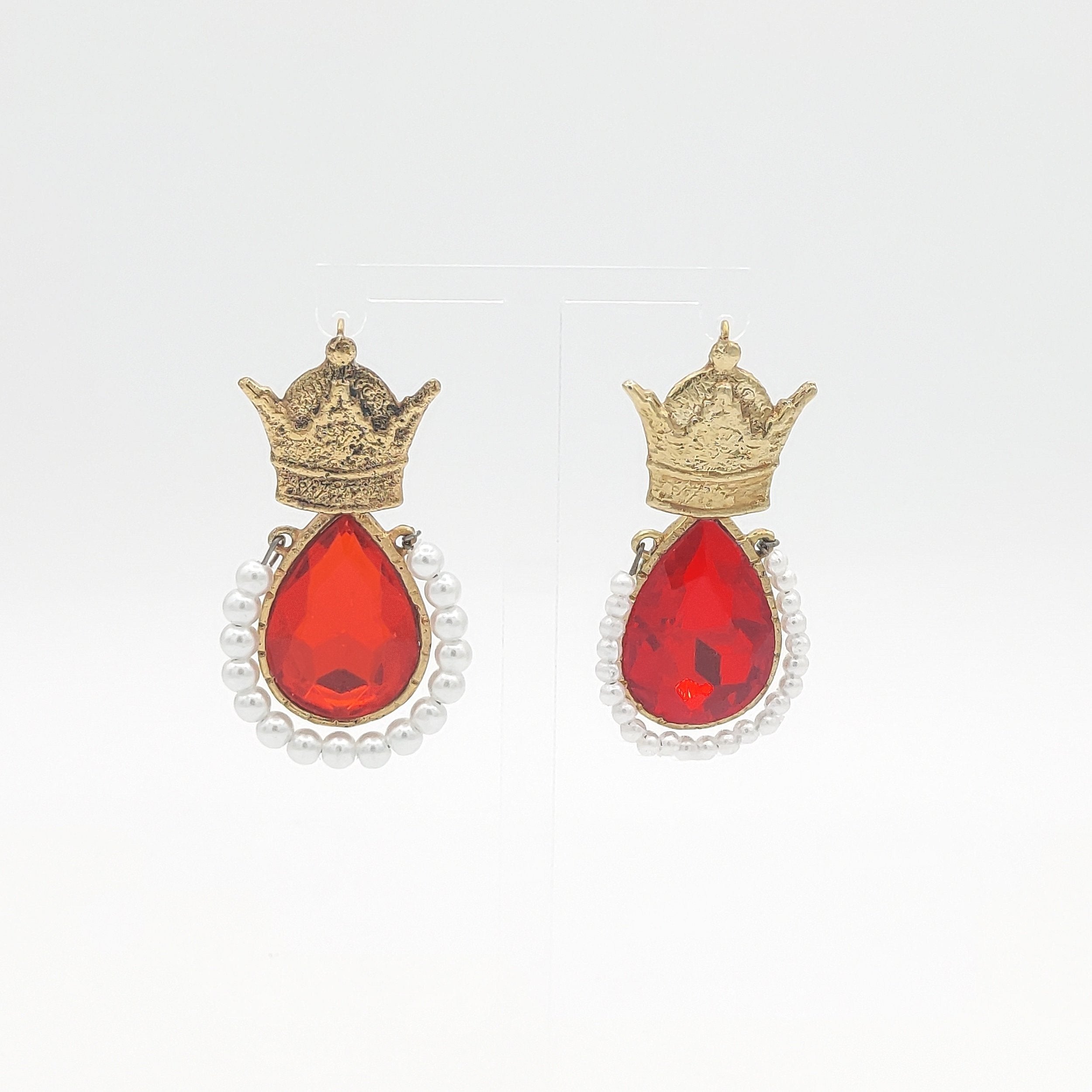 These Crown Brass Red Stone Earrings are handmade from high-quality brass, measuring 2 inches long and 1 inch wide. Designed for the earlobe with a push-back closure, they combine durability with elegant style. To maintain their finish, avoid water, harsh chemicals, and abrasive cleaners, and store them in a plastic bag when not in use.