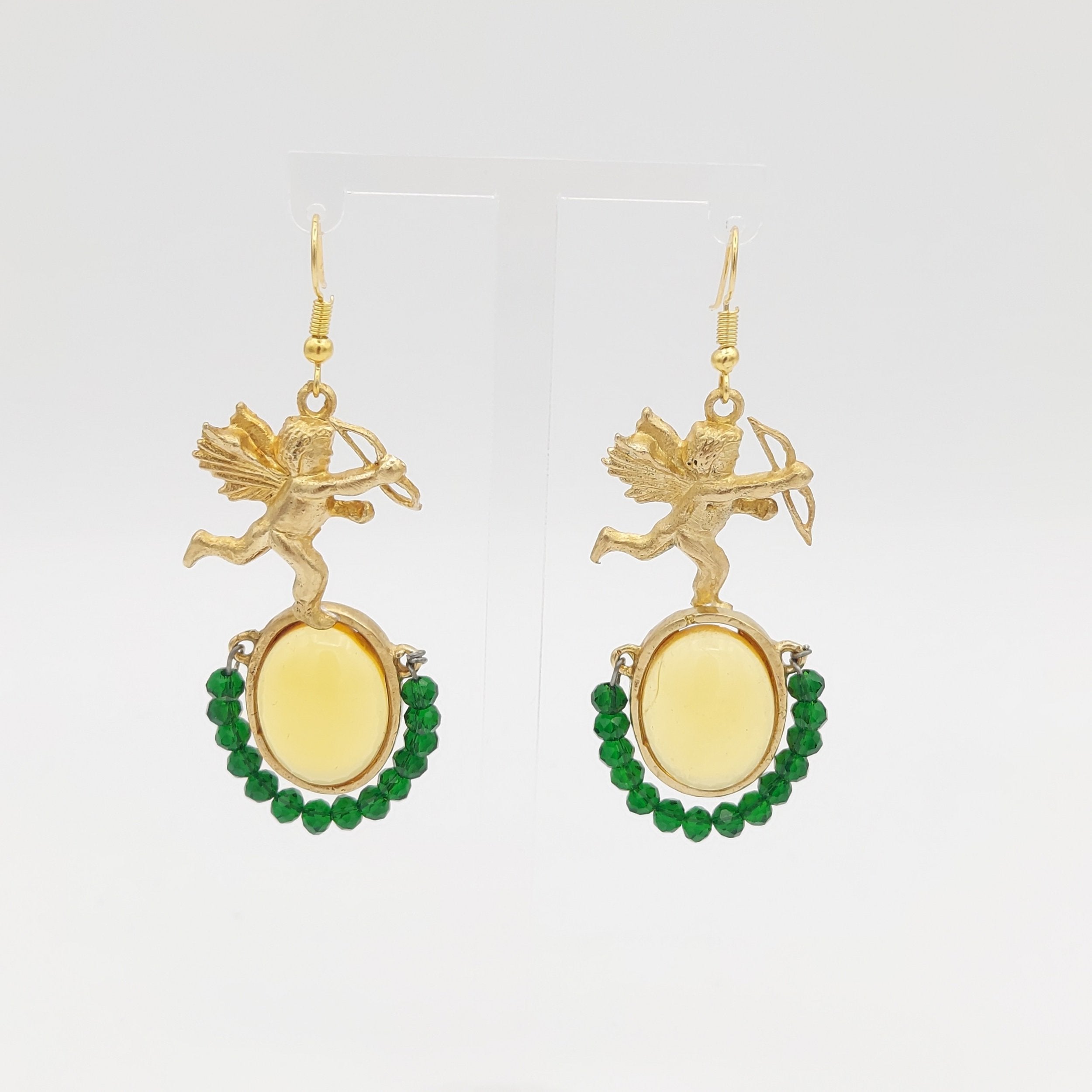 Crafted from brass, these Golden Angel earrings feature a fish hook closure designed for comfort on the earlobe. Measuring 2 1/2 inches in length and 1 inch in width, each piece is handmade with meticulous attention to quality and detail. To preserve their finish, avoid exposure to water, harsh chemicals, and abrasive cleaners. Store them in a sealed plastic bag when not in use to minimize air contact and maintain their pristine condition.