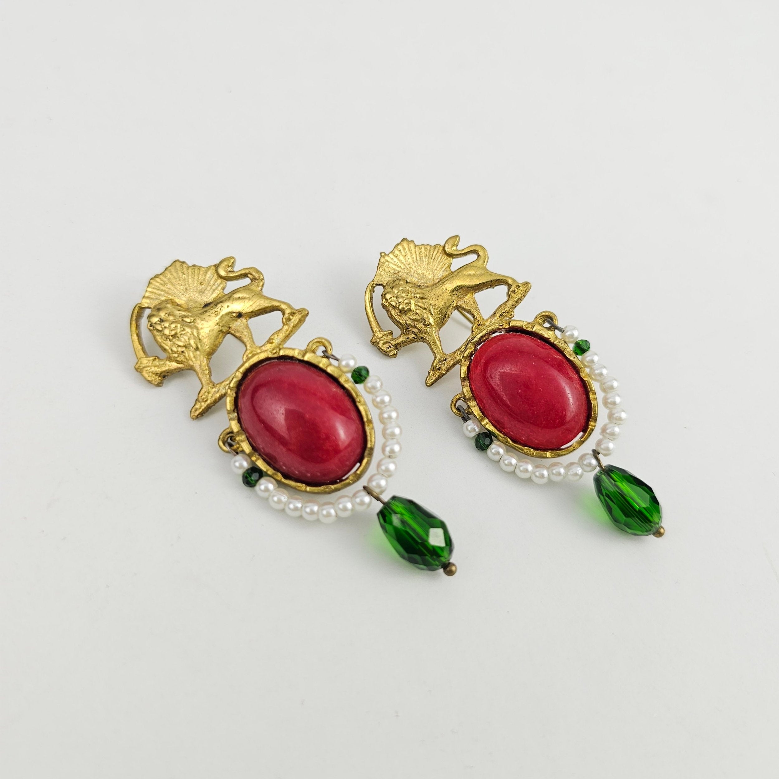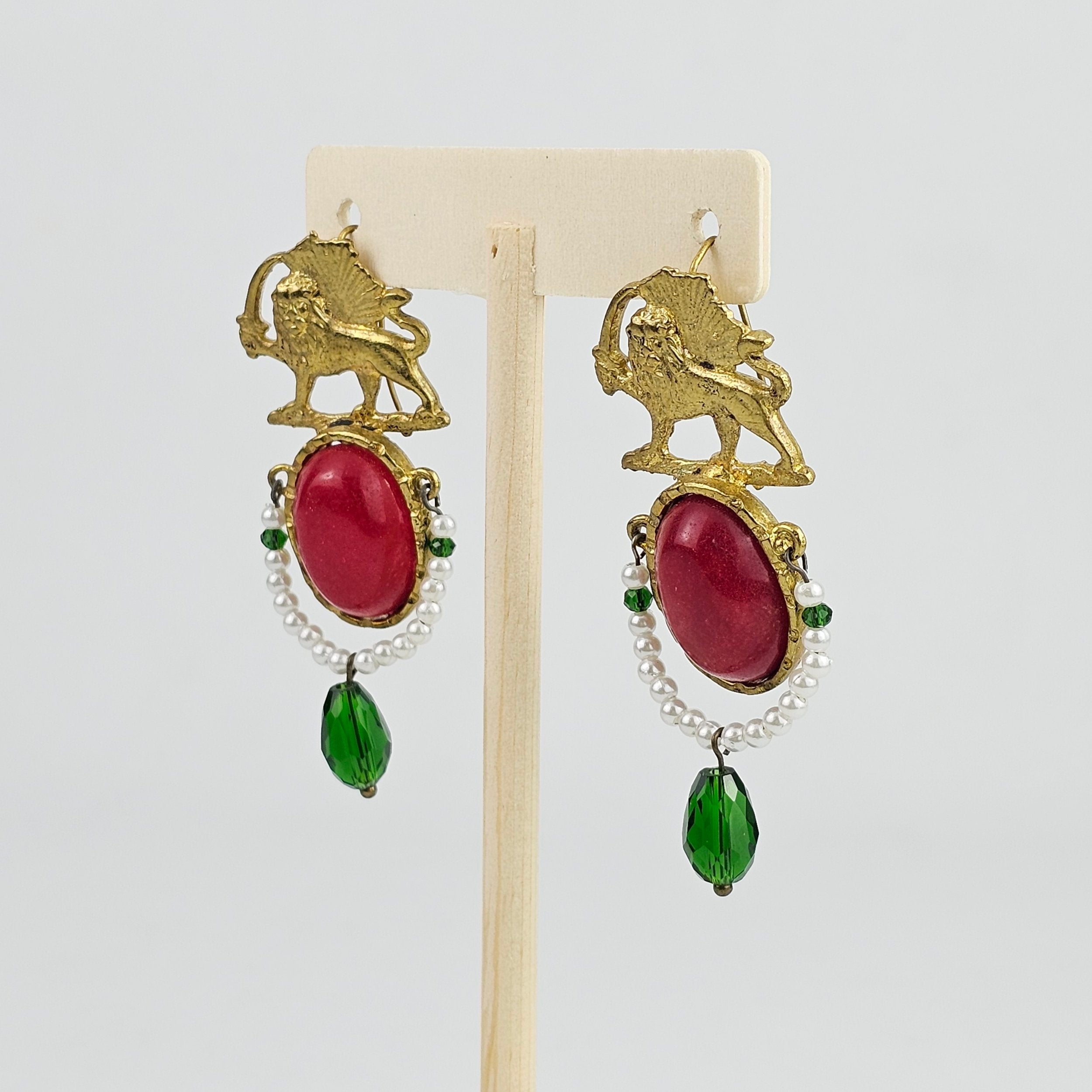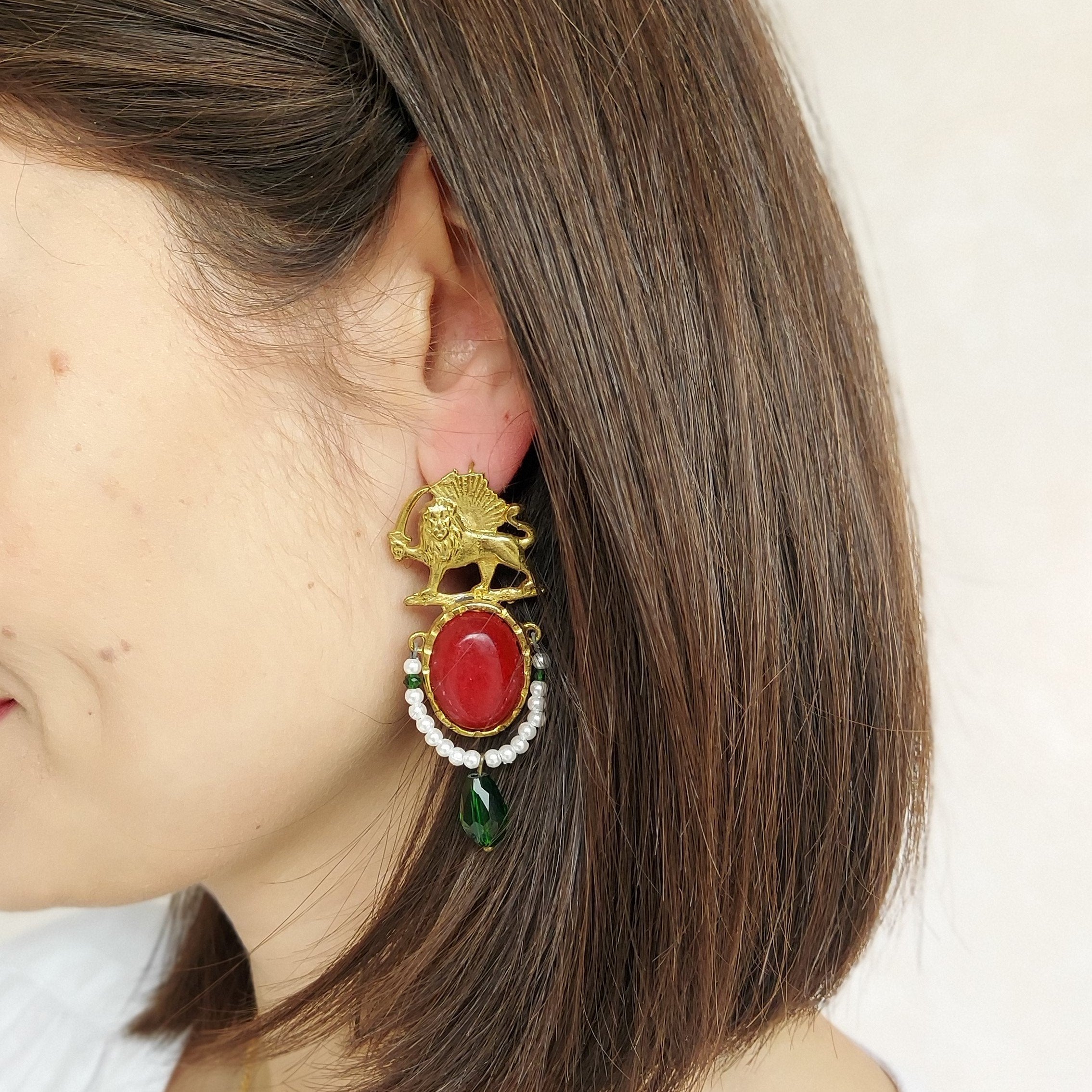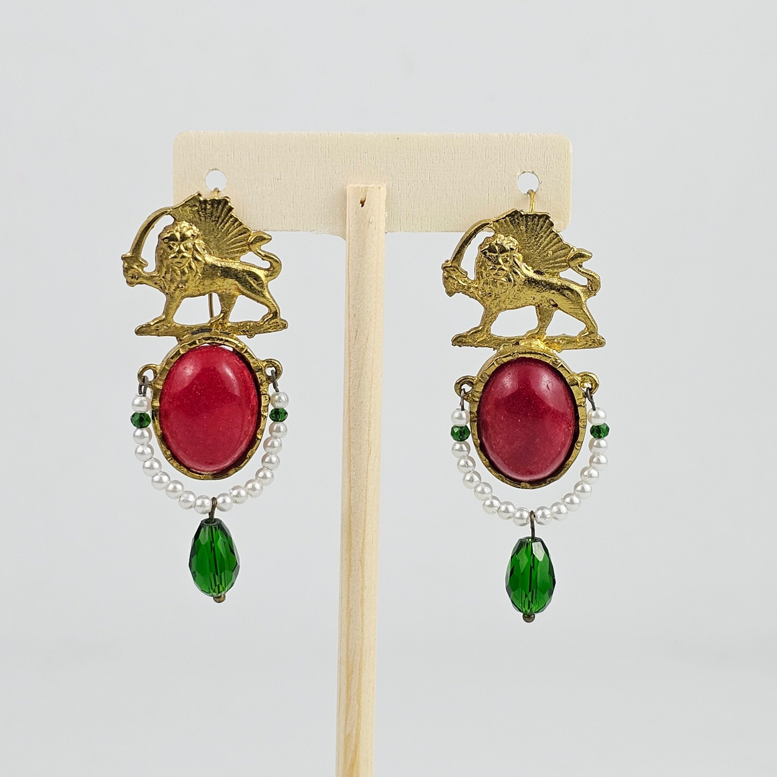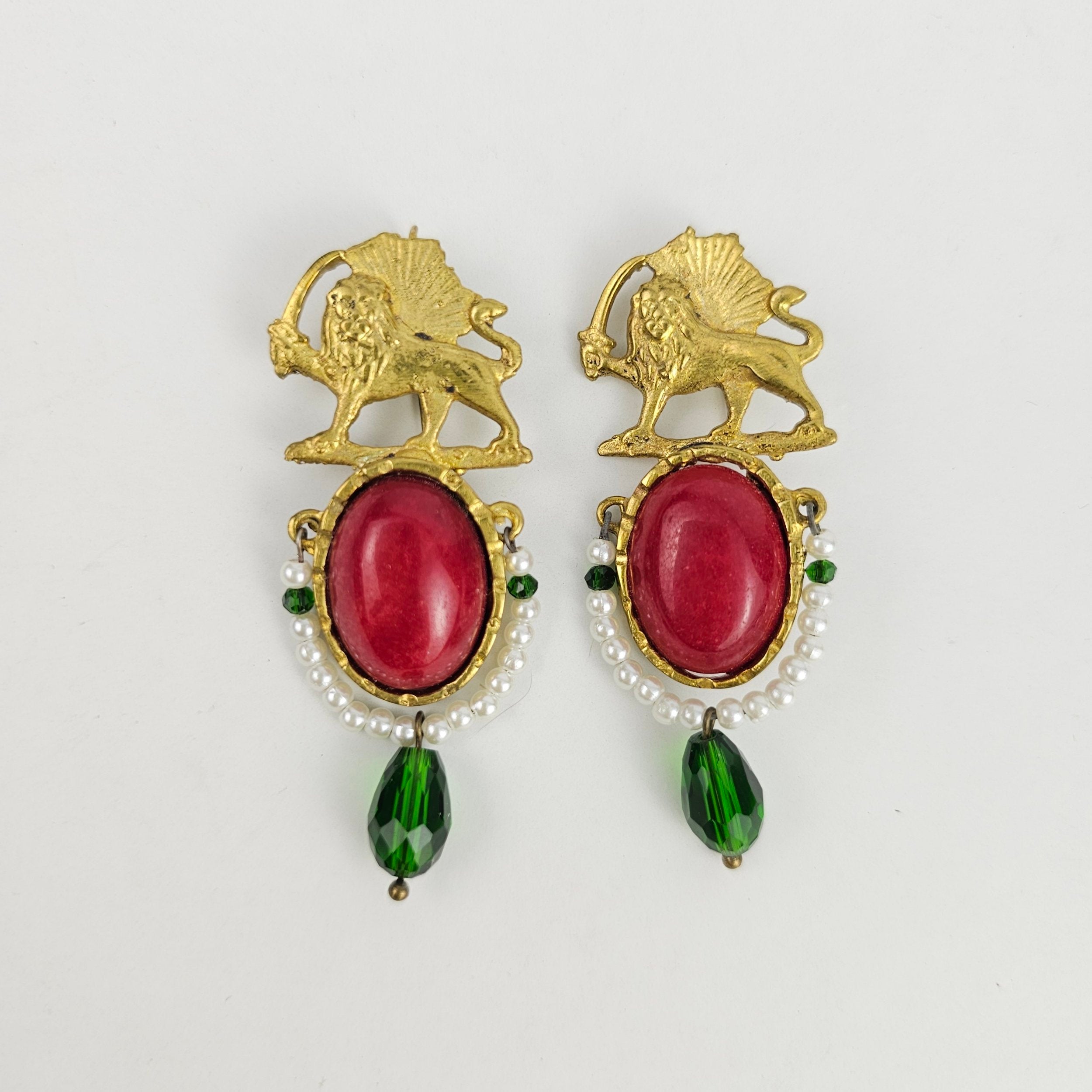 Crafted from brass, these Golden Shir o Khorshid earrings feature a 2.5-inch length and 1-inch width, designed to hang elegantly from the earlobe with a hook closure. Each piece is handmade with meticulous attention to quality and detail. To preserve their finish, avoid exposure to water, harsh chemicals like perfumes and lotions, and store them in a sealed plastic bag when not worn. Clean gently without abrasive materials to maintain their lasting beauty.