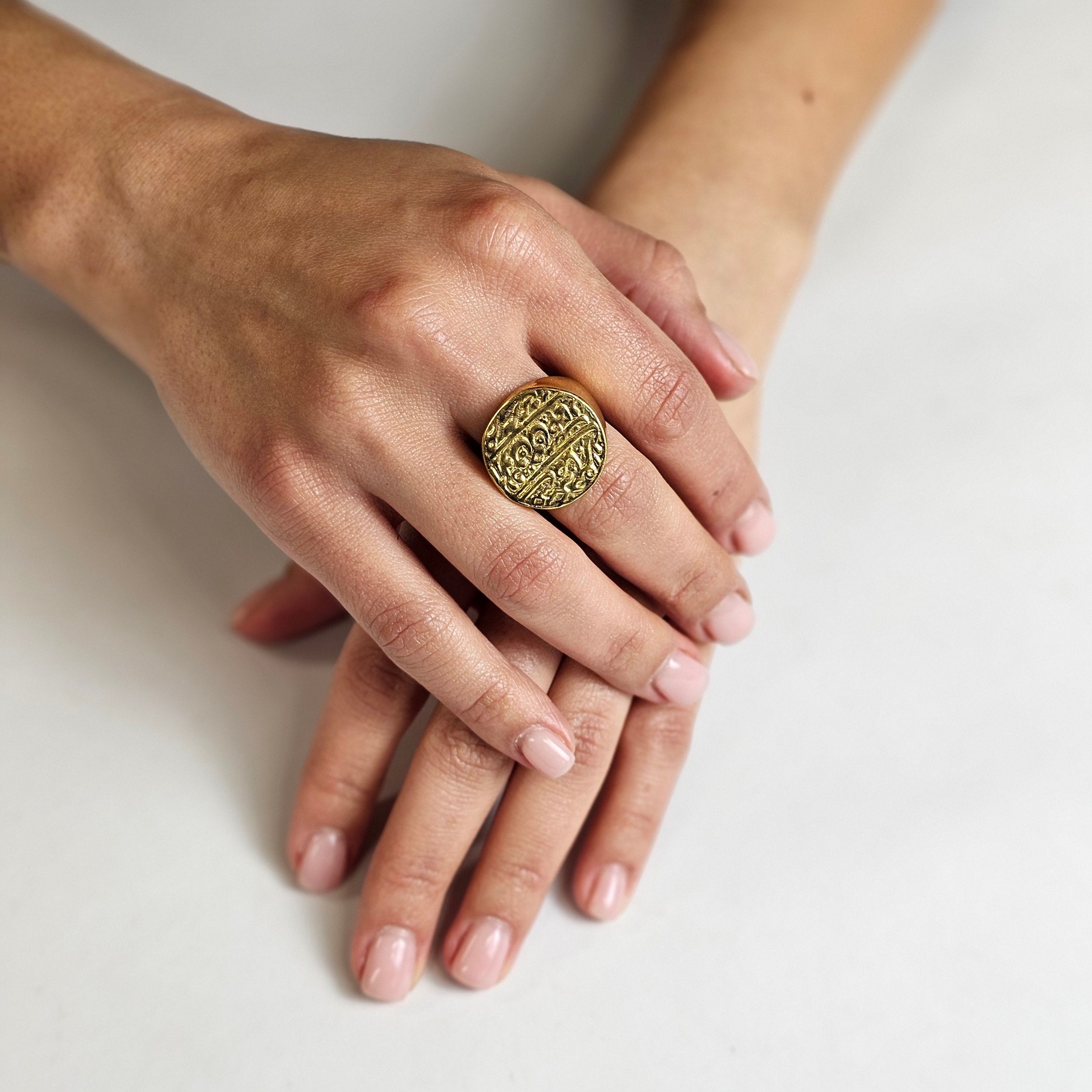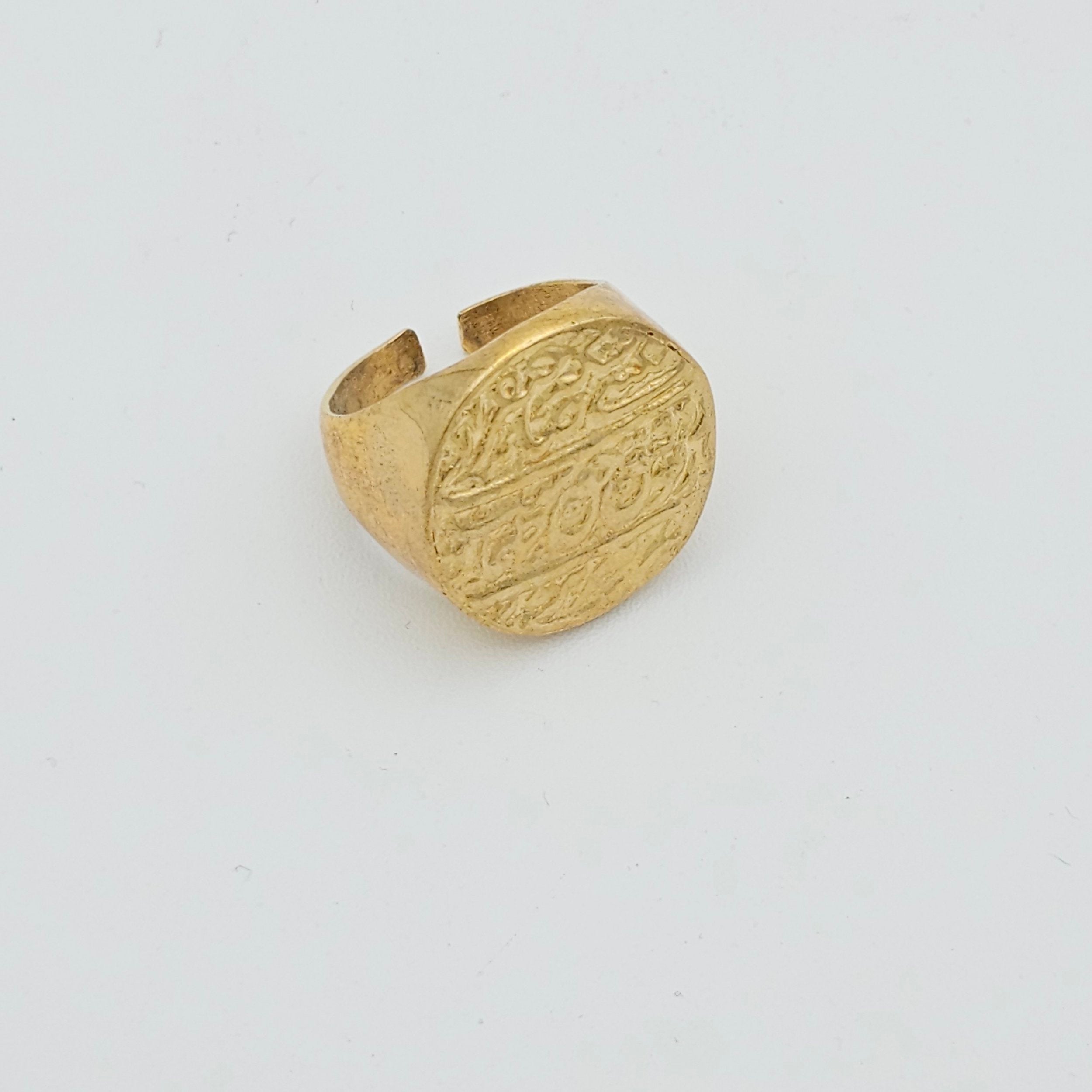 Crafted from durable stainless steel, the Golden Sahebgharan Ring features an adjustable, free-size design for a perfect fit. Handmade with meticulous attention to detail, this piece combines quality materials with expert craftsmanship. To maintain its finish, avoid exposure to water, harsh chemicals, and abrasive cleaners. Store the ring in a sealed plastic bag when not in use to prevent oxidation and preserve its appearance.
