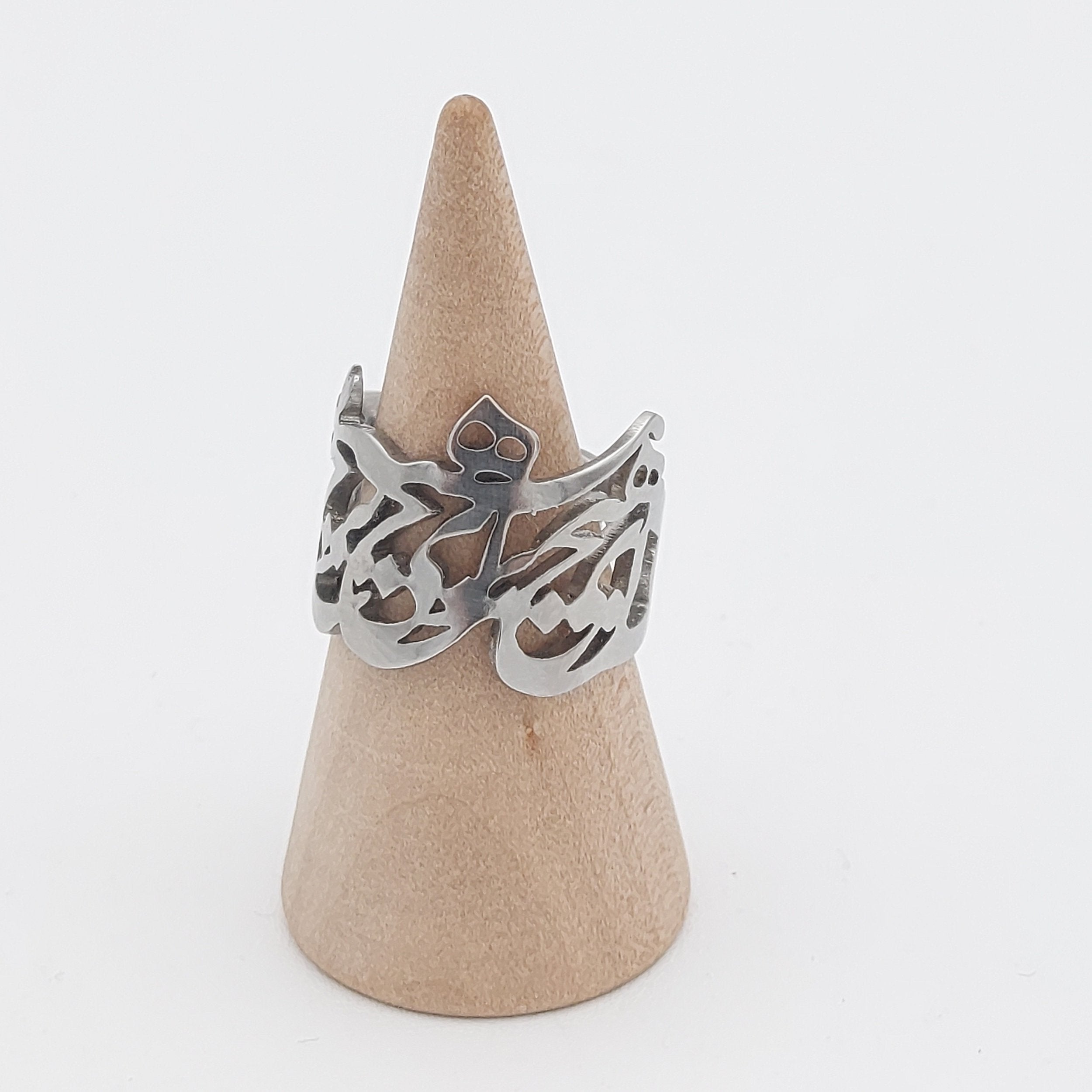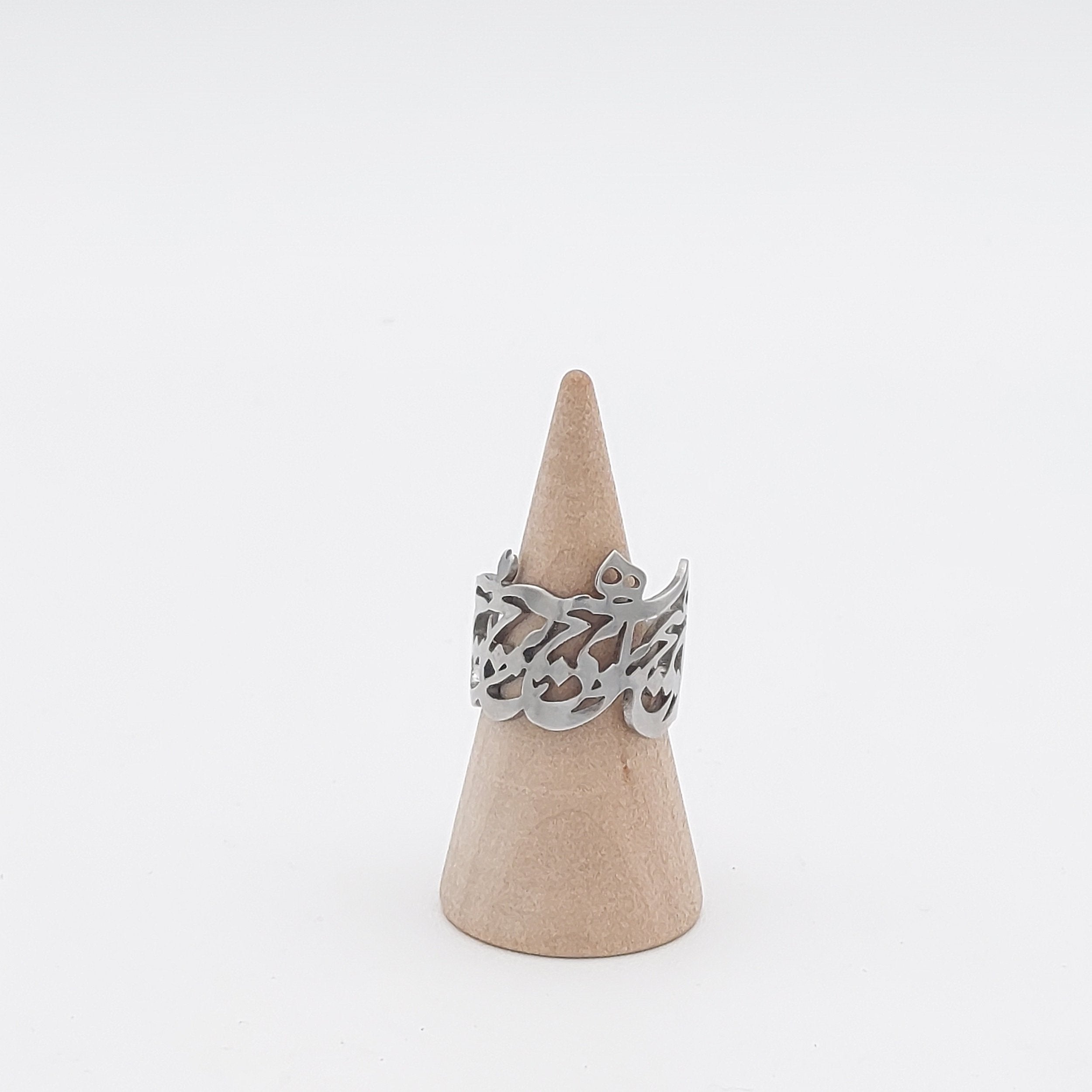 This handcrafted brass ring features a recycled calligraphy design with a height of 1/2”. Made from high-quality brass, it offers an adjustable, free-size fit. Crafted with meticulous attention to detail, this piece requires careful care: avoid exposure to water, harsh chemicals, and abrasive cleaners. Store it in a plastic bag when not worn to preserve its finish.