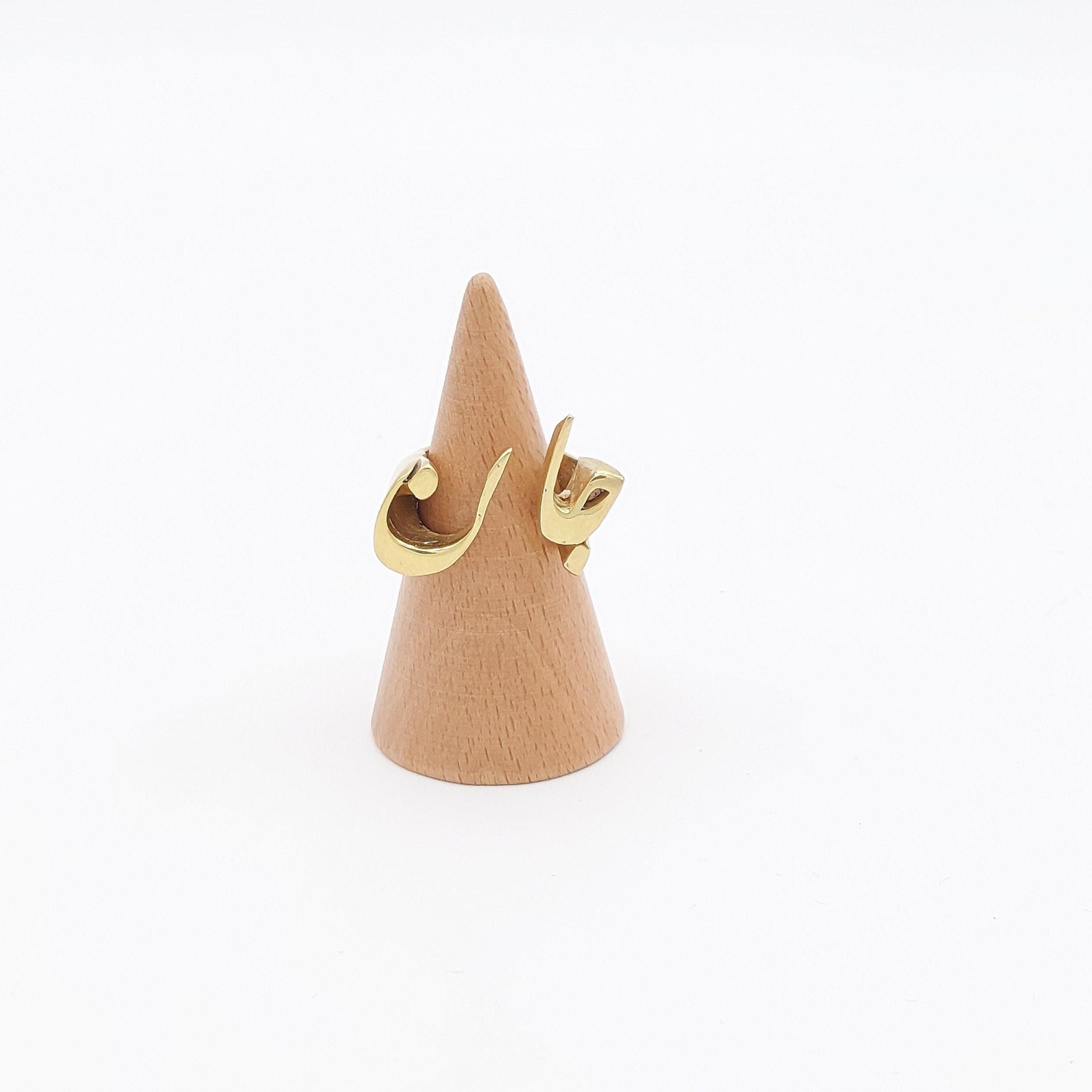 This handcrafted adjustable ring features elegant calligraphy and is available in two distinct colors. Made from brass, it measures approximately 1 inch by 0.5 inch, combining artisanal craftsmanship with a refined design.