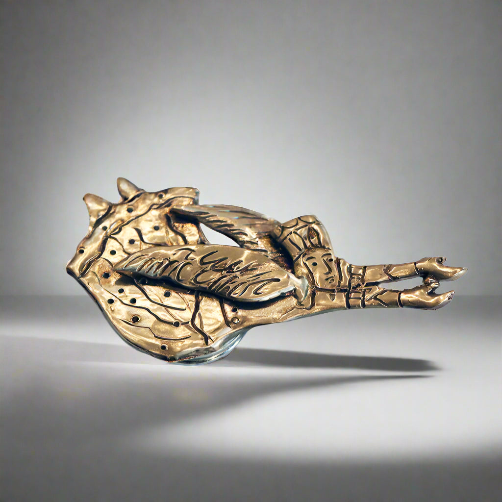 This bronze brooch, meticulously handcrafted, takes its design cues from Persian paintings and miniatures. With dimensions of 2 inches long and 1 inch wide, it elegantly merges cultural artistry with practical wearability. To preserve its condition, keep it away from water and harsh chemicals such as perfumes and hairsprays, and store it in a sealed plastic bag when not worn. Clean carefully using non-abrasive methods to maintain its surface. The brooch features a magnetic closure for secure and easy fastening.
