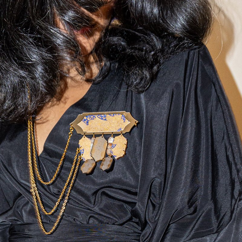 The brooch attaches with a magnet and includes a portable ear cuff for the earring.