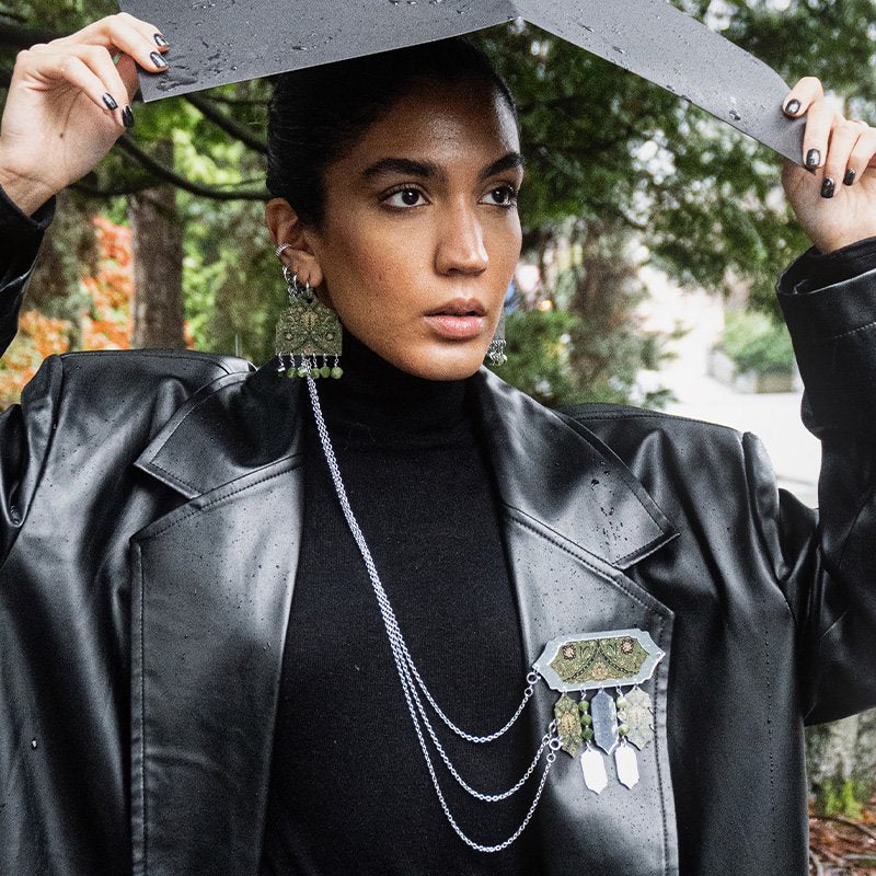The brooch attaches with a magnet and includes a portable ear cuff for the earring.