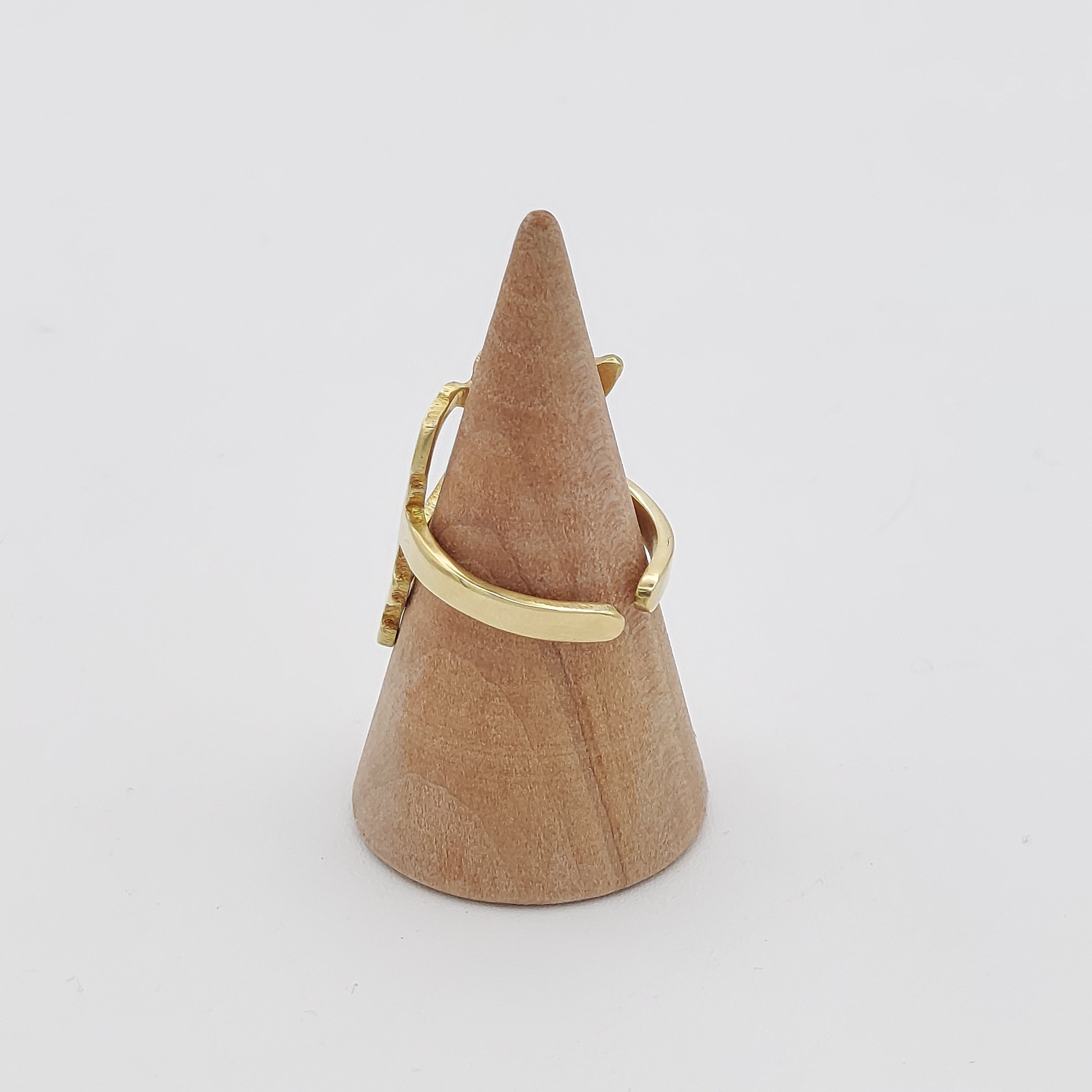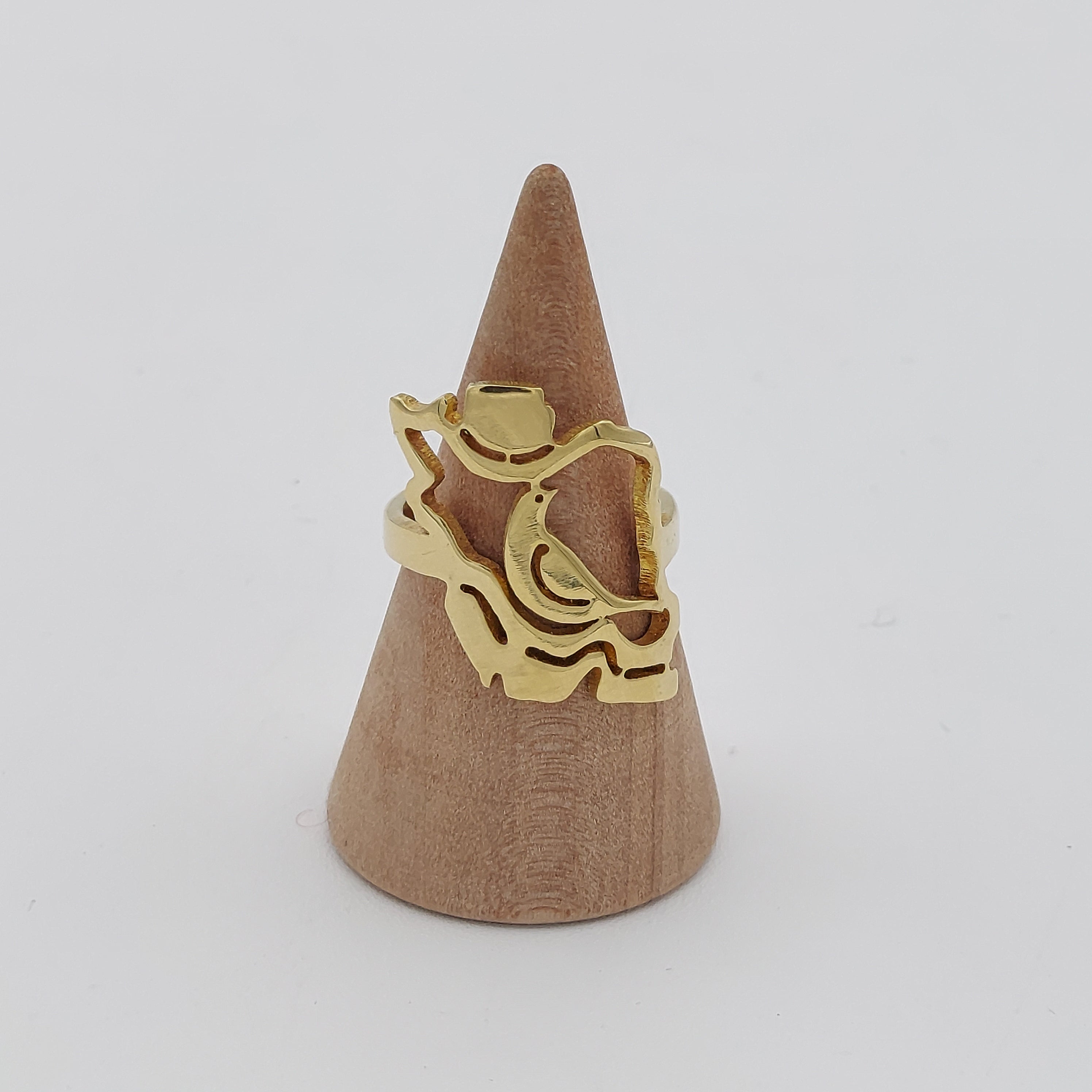 This handcrafted ring is made from recycled brass and features intricate calligraphy, standing approximately 2.5 cm tall and 2.5 cm wide. Designed with adjustable sizing for a comfortable fit, it combines artisanal craftsmanship with premium materials.