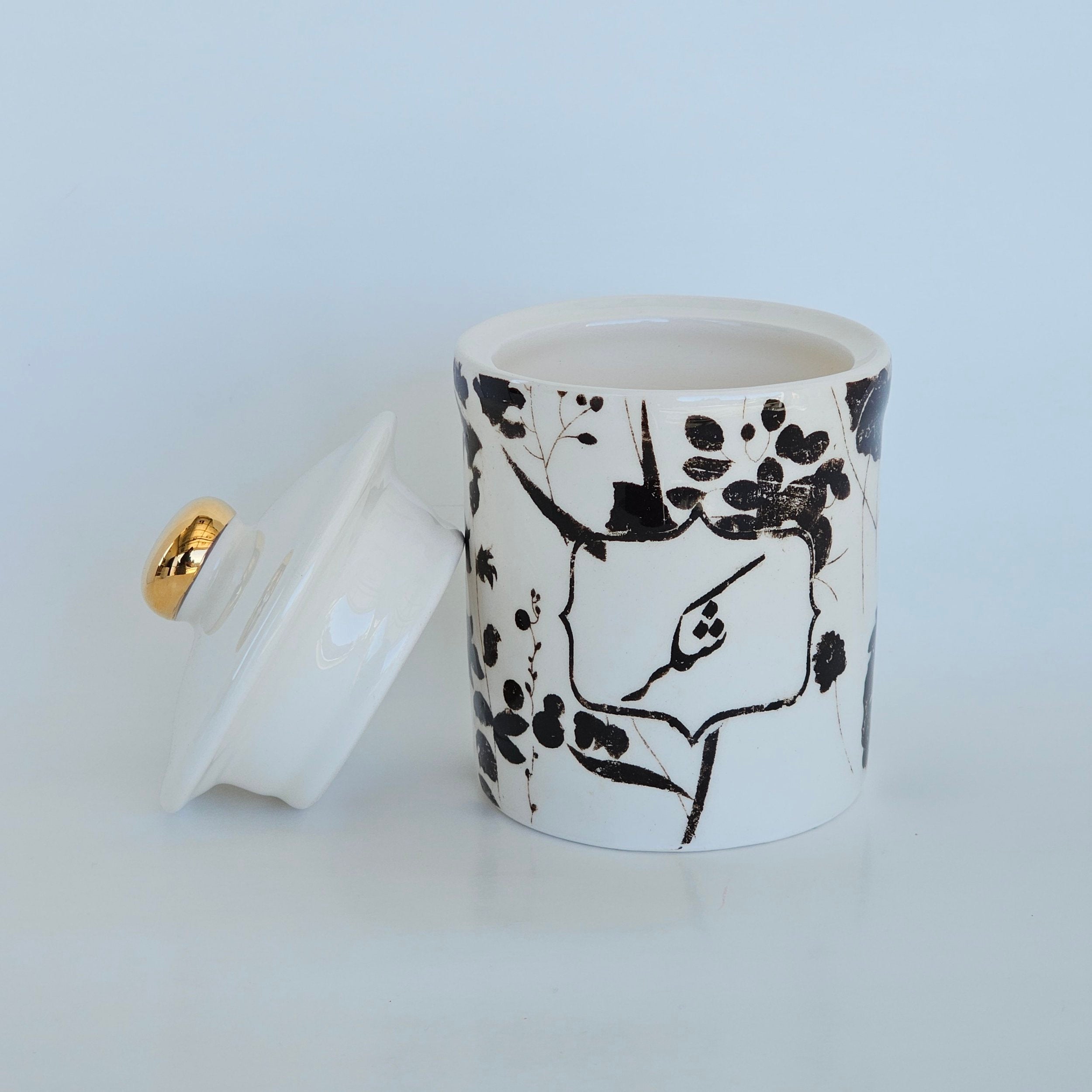 Dimension: 5.5”height with lid x4” (14.5 h x10 cm)