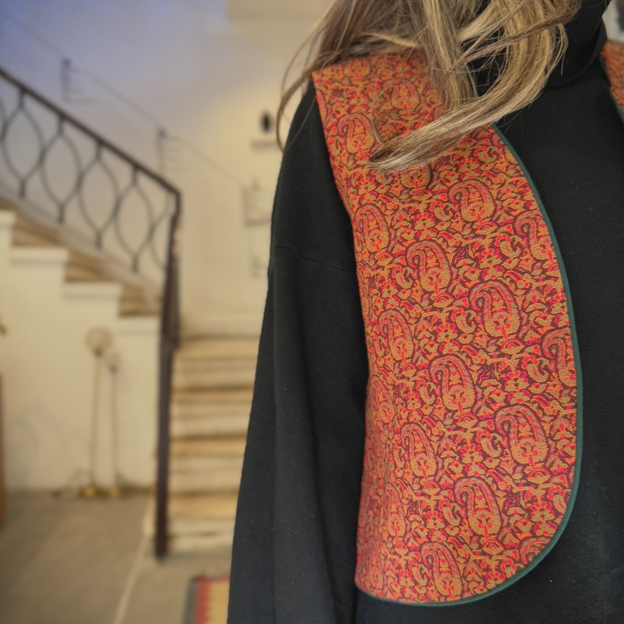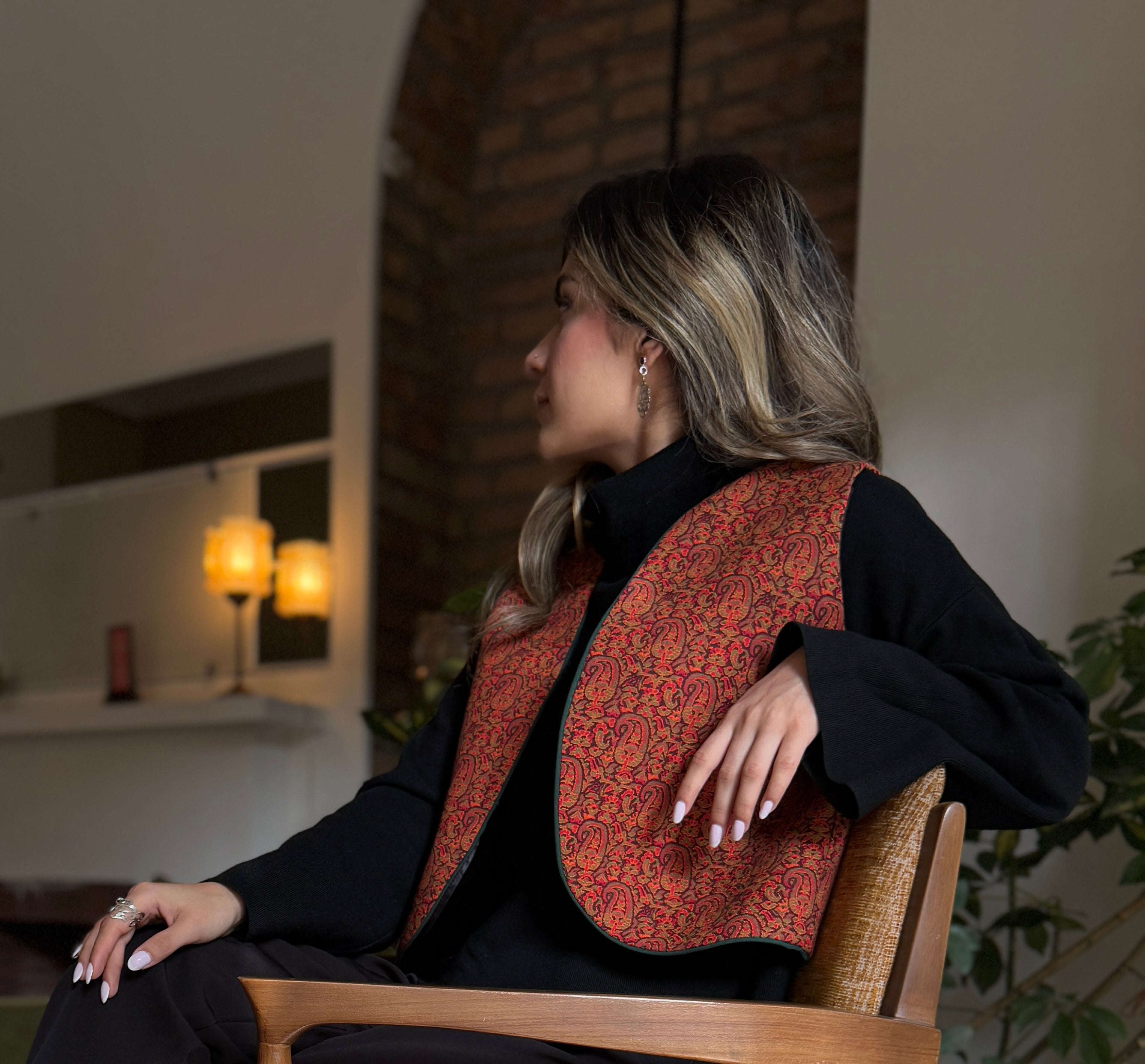 Embrace timeless elegance with the Sormeh Vest, crafted from Termeh fabric in rich Amber and Red, adorned with intricate Persian motifs. This sophisticated blend of traditional craftsmanship and modern design makes the vest a standout piece for any wardrobe. Perfect for layering or wearing as a statement piece, the Keynaz Vest effortlessly combines style and comfort. Celebrate Persian heritage with this unique and versatile design, exclusively available at Diyar Concept Store.