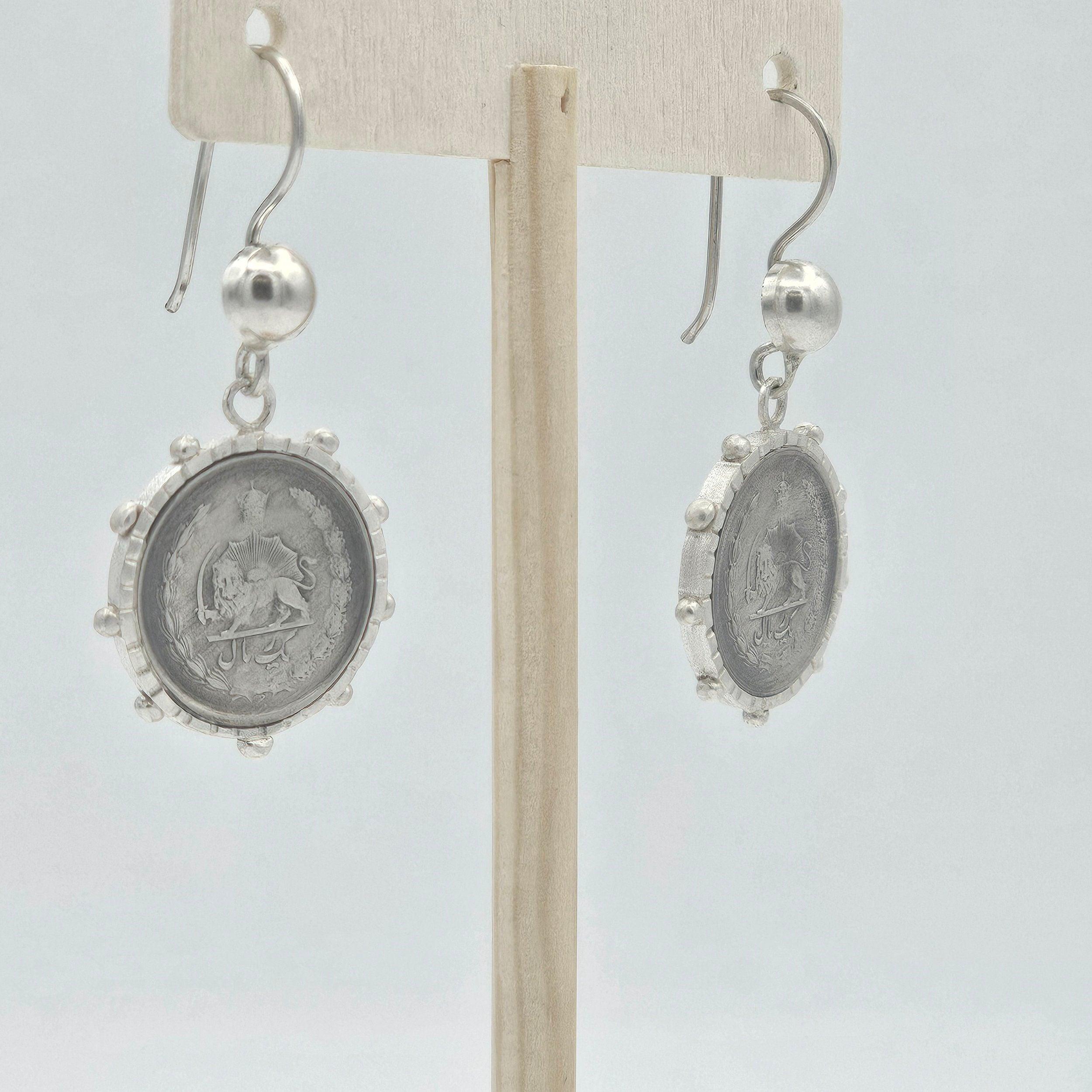 Crafted from silver, these Pahlavi Coin earrings feature a hook closure designed for the earlobe. Measuring 1 1/2 inches in drop length and 3/4 inches in width, each piece is meticulously handmade. To preserve their quality, avoid exposure to water, harsh chemicals like perfume and lotions, and store them in a sealed plastic bag when not worn. Clean gently without abrasive materials to maintain their finish.
