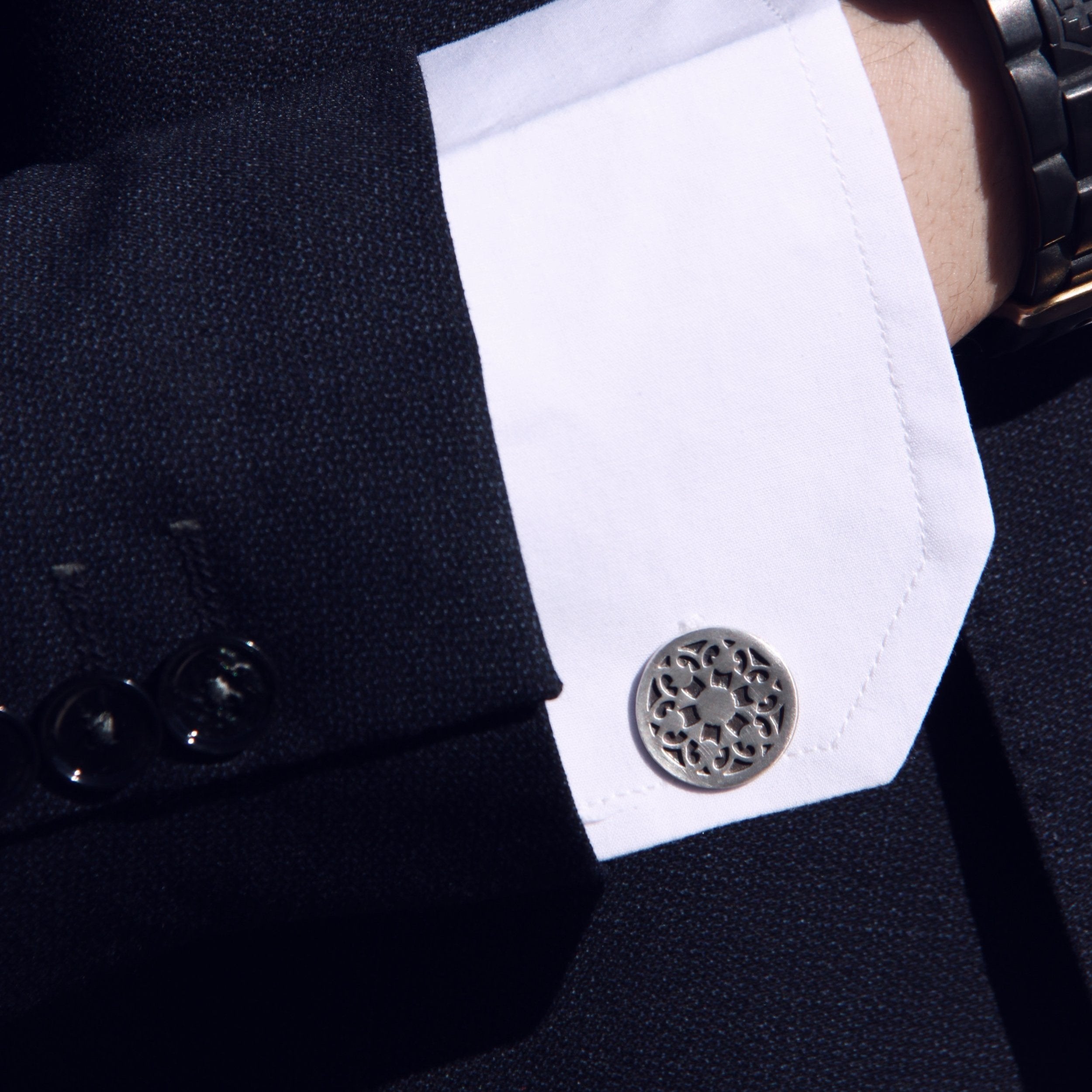 These handcrafted cufflinks feature a minimalist Persian pattern in oxidized 925 sterling silver, measuring 2 cm in diameter. Made with high-quality materials, they require careful care: avoid water, harsh chemicals, and abrasive cleaners, and store them in a sealed bag when not in use to maintain their finish.