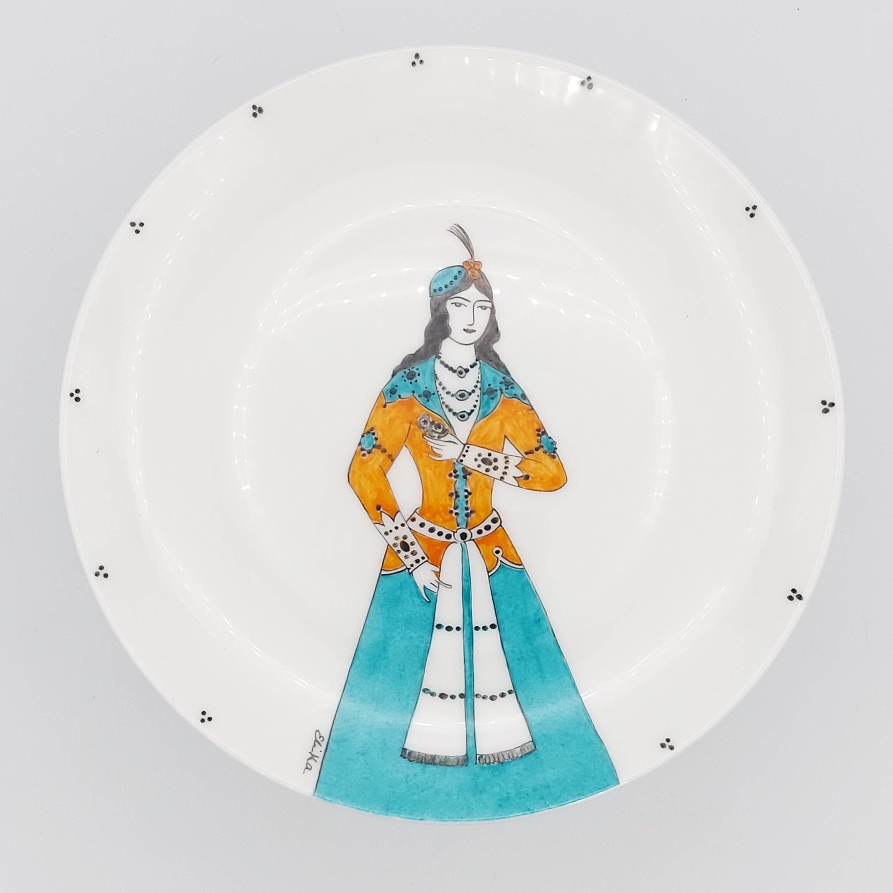 Hand Painted Turquoise Qajar Lady Plate with Glass Stand