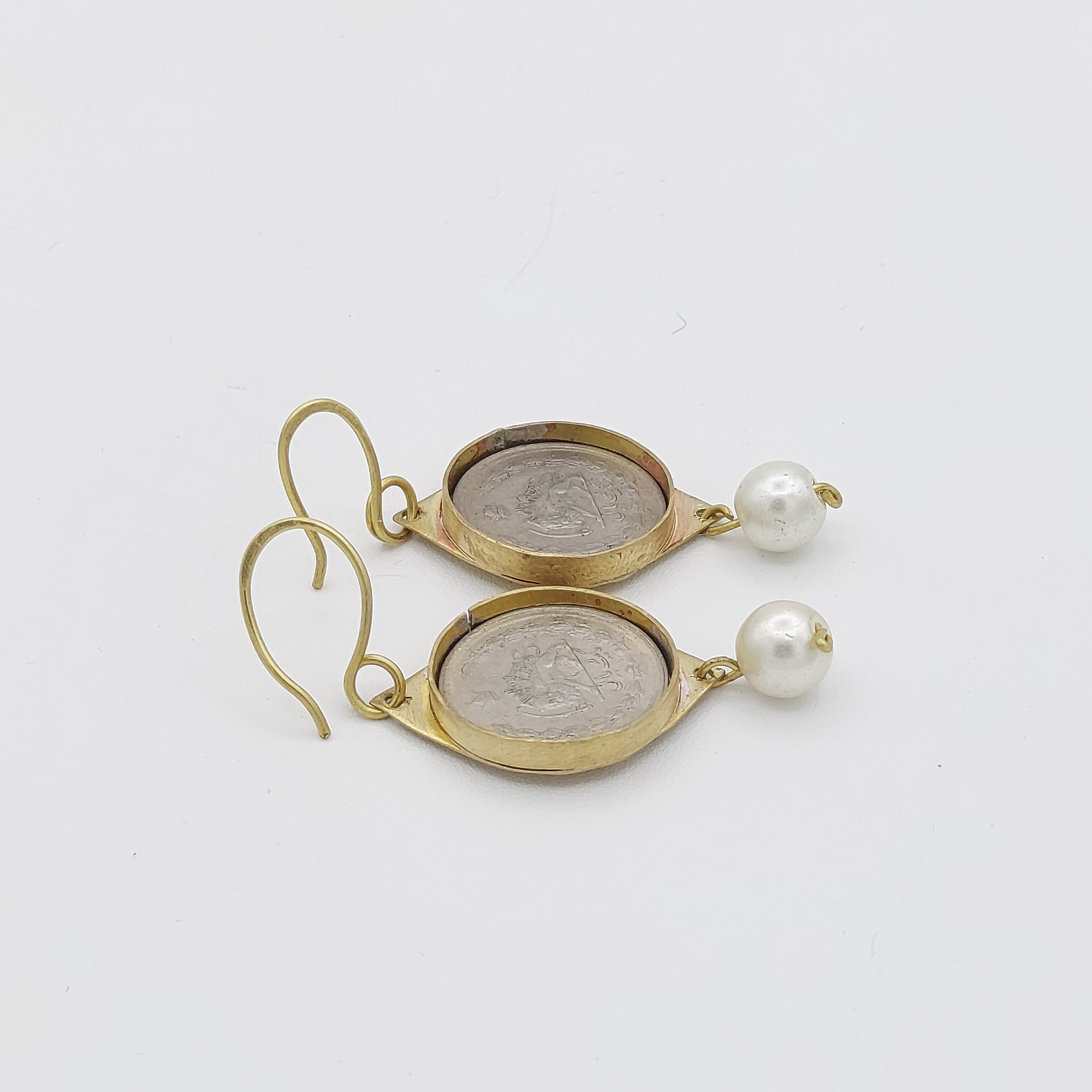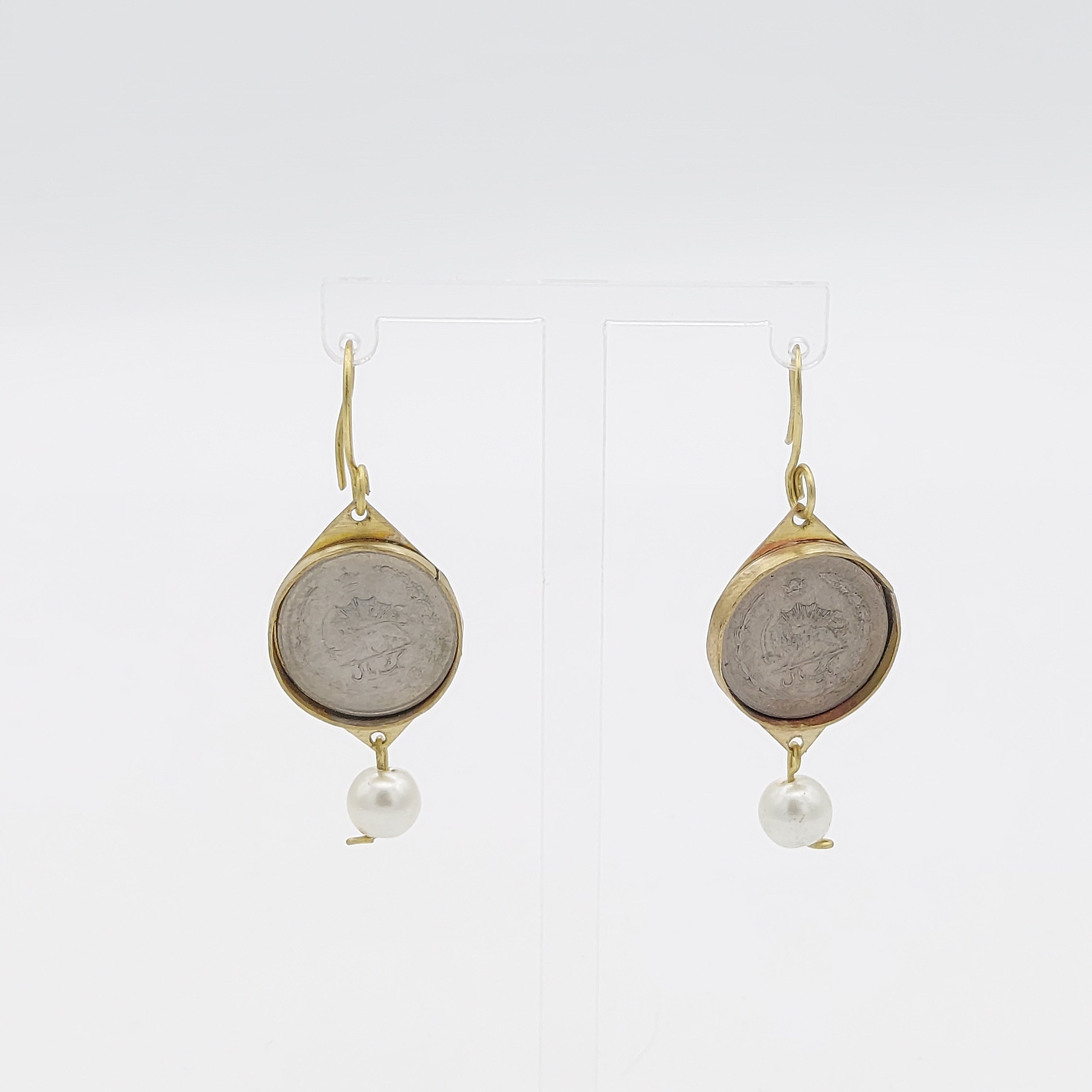 Crafted from brass, these handmade Single Pearl Pahlavi Coin Earrings measure 5 cm in length and 2 cm in width, and are designed to comfortably adorn the earlobe with a secure hook closure. Meticulous attention to detail ensures high-quality craftsmanship.