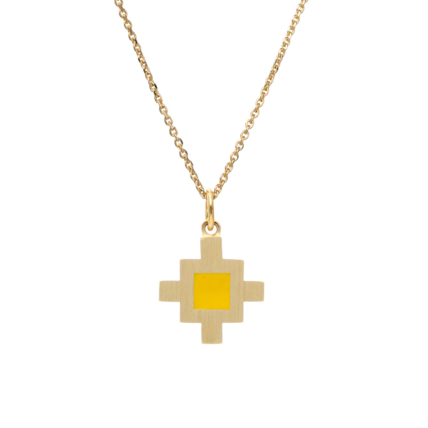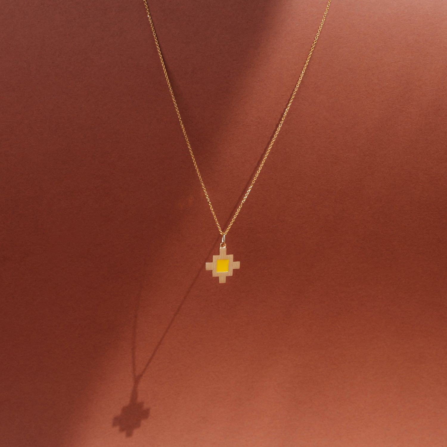 This Bahar Pendant features 18k yellow gold with yellow enamel, measuring 14 x 14mm. It comes with a 17-inch chain and an extra jump ring at 15 inches for adjustable length.