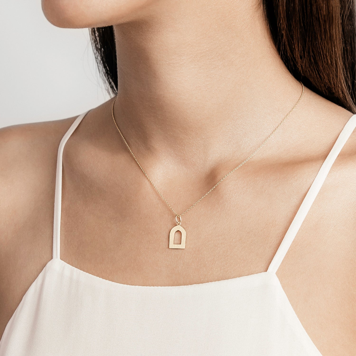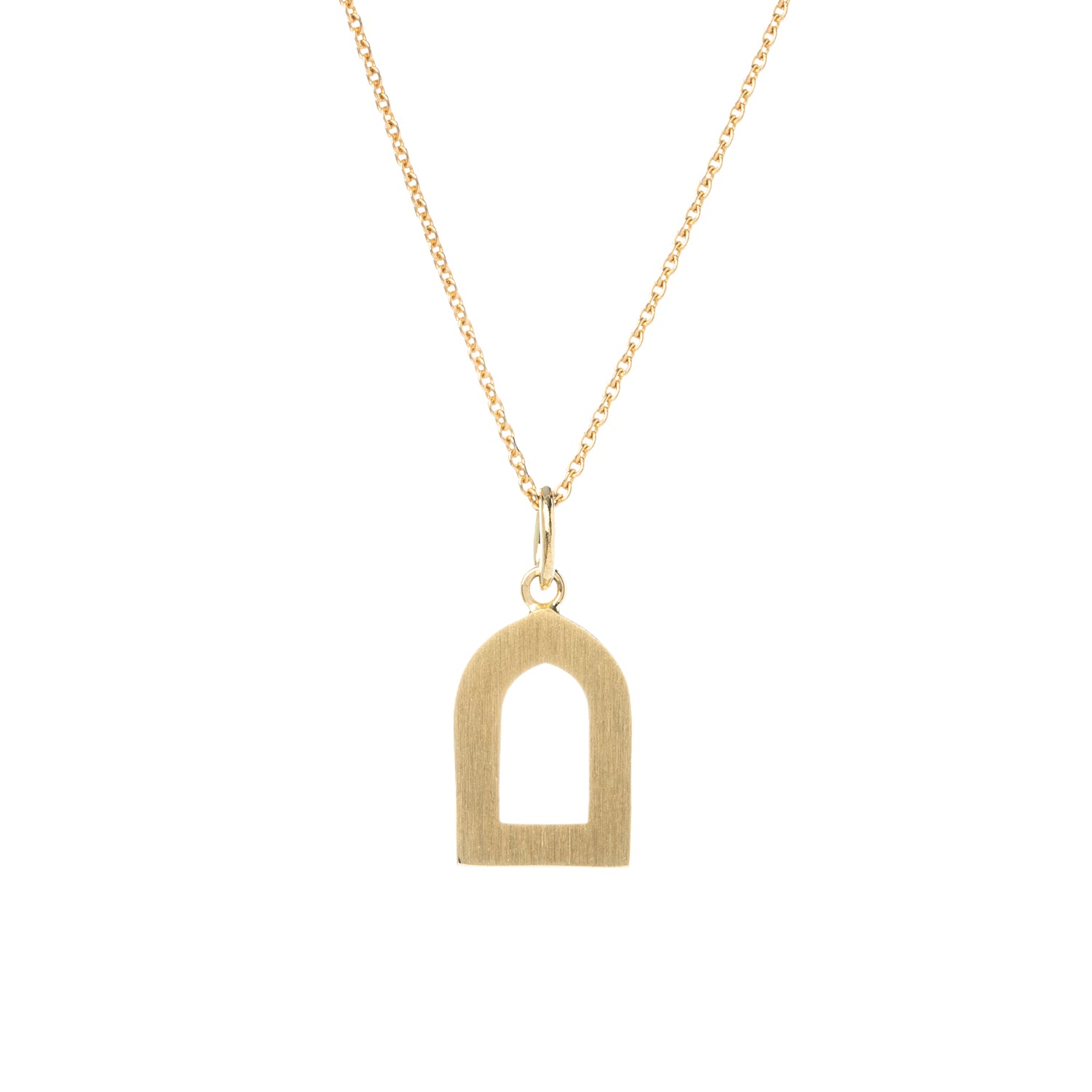 This pendant charm is crafted from 18k yellow gold, measuring 10 x 14mm, and comes with a 16-inch chain.