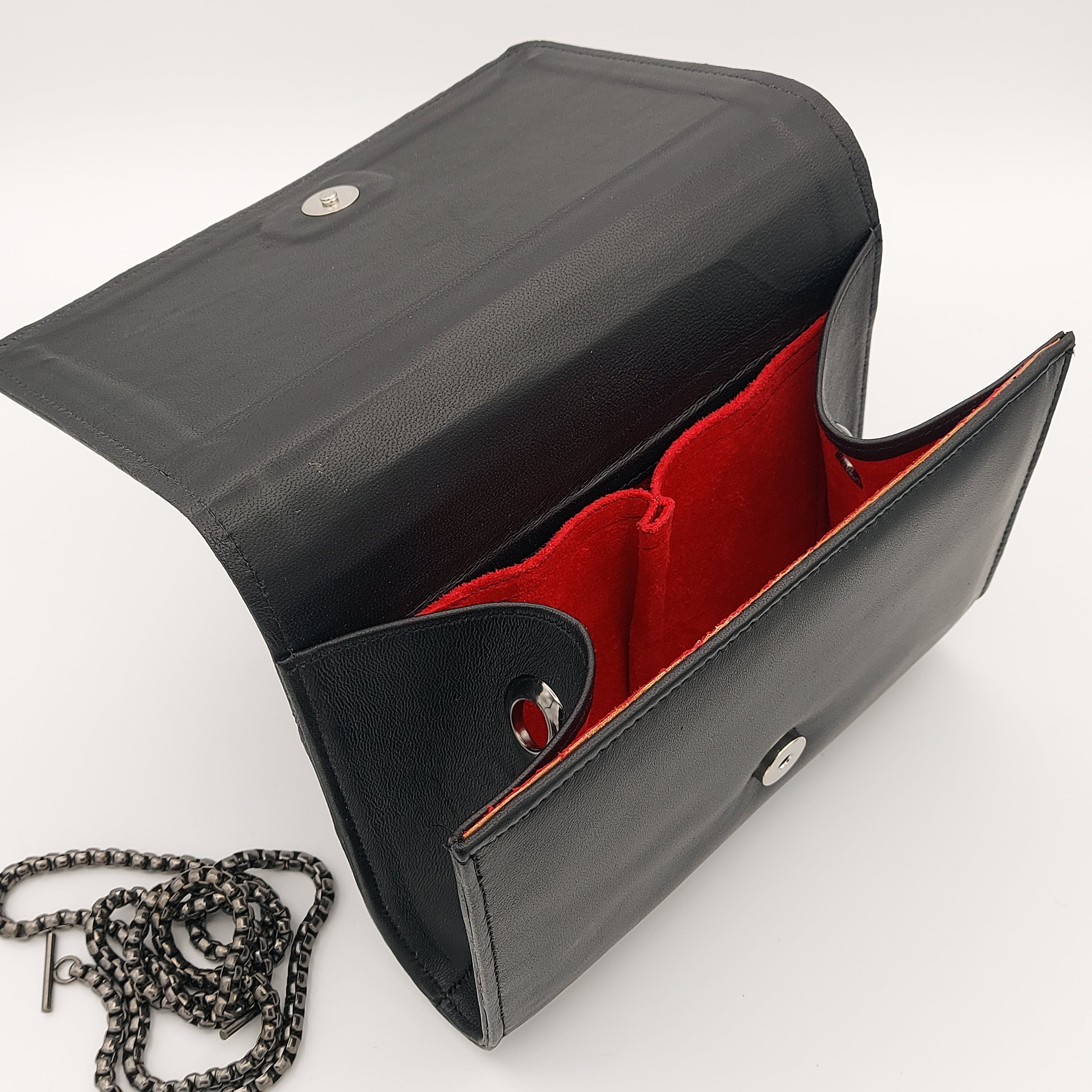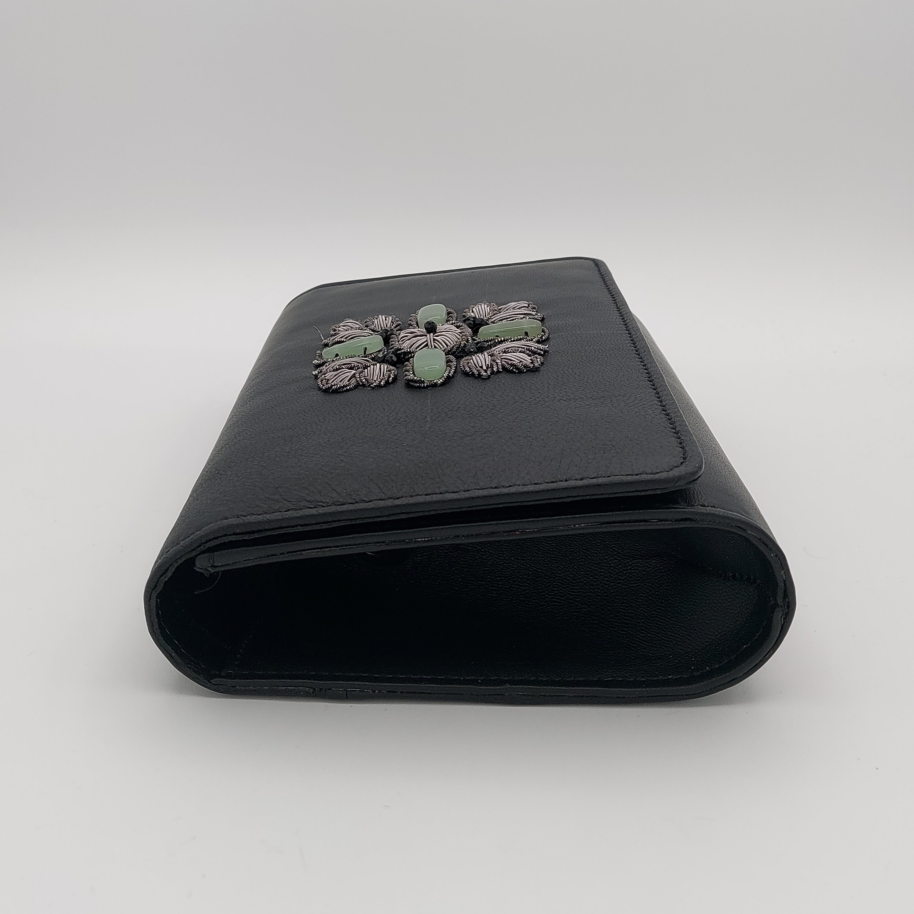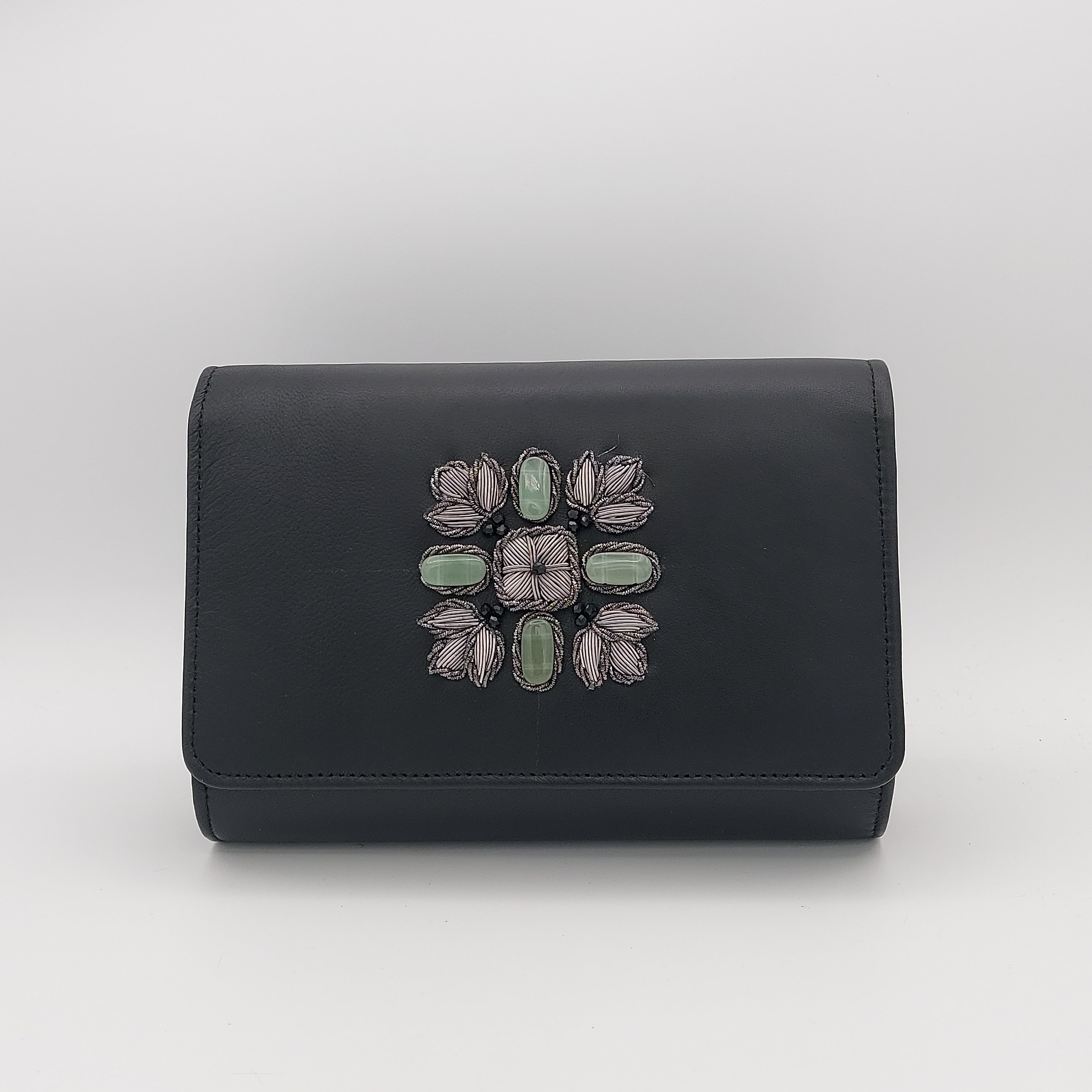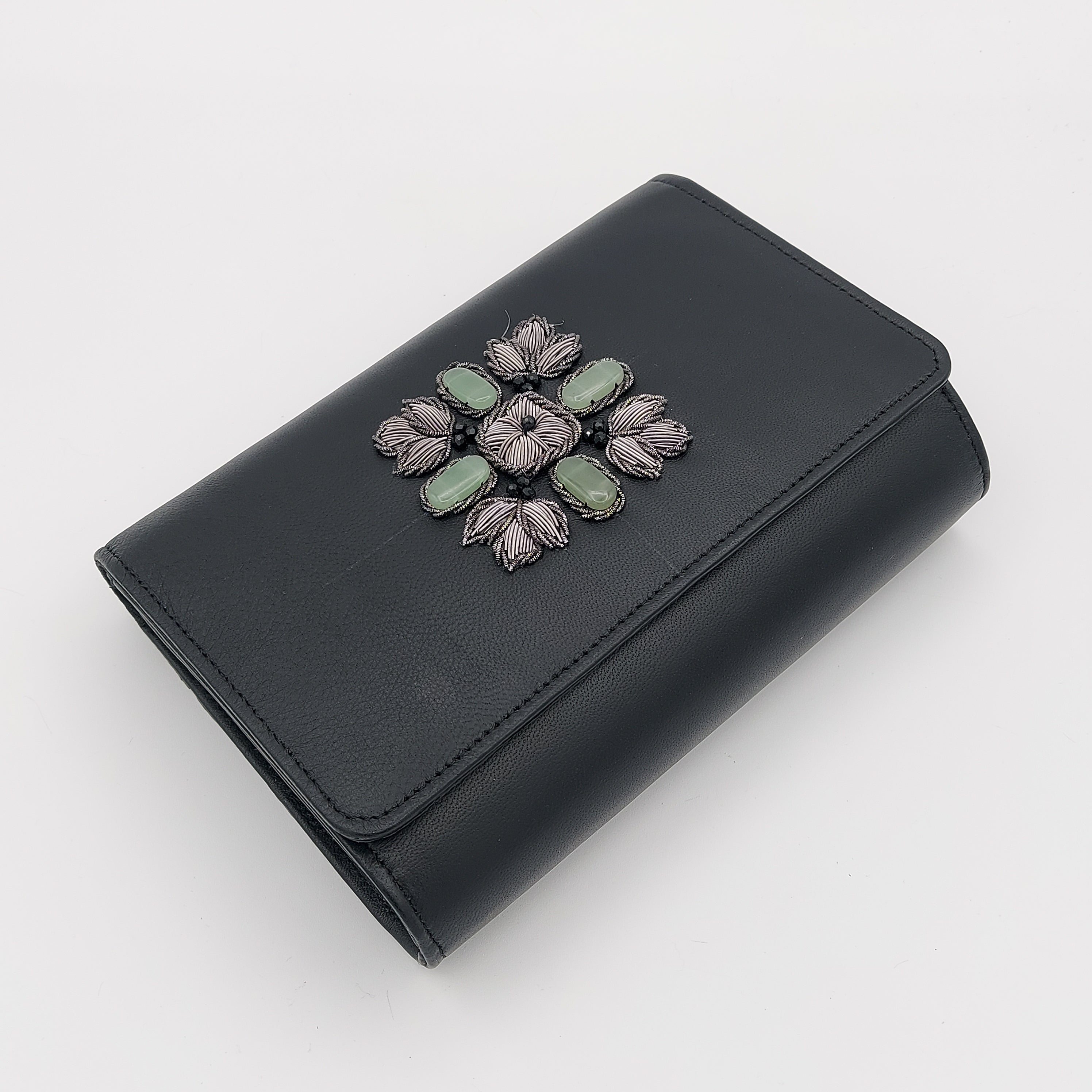 The exquisite Classic Clutch, a masterpiece by Noorarash Designs, is a handmade black leather clutch, adorned with intricate Sermeh embroidery and Aquamarine. This clutch showcases traditional craftsmanship merged with contemporary elegance. The easy-grip handle ensures comfort, while the detachable chain strap offers versatile styling options.