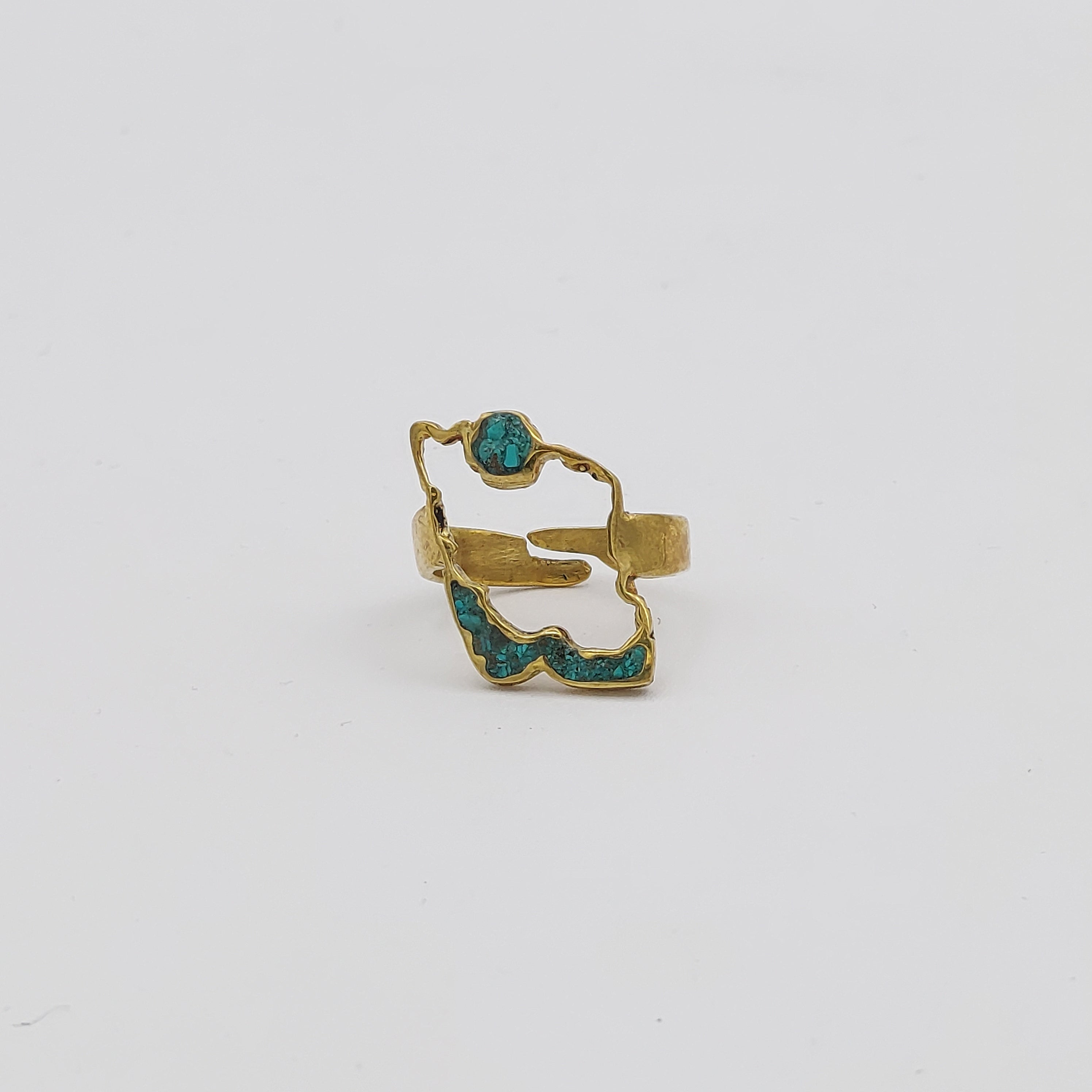 This handcrafted ring is made from recycled brass and features crushed Turquoise stones, standing approximately 2 cm tall and 1.5 cm wide. Designed with adjustable sizing for a comfortable fit, it combines artisanal craftsmanship with premium materials.