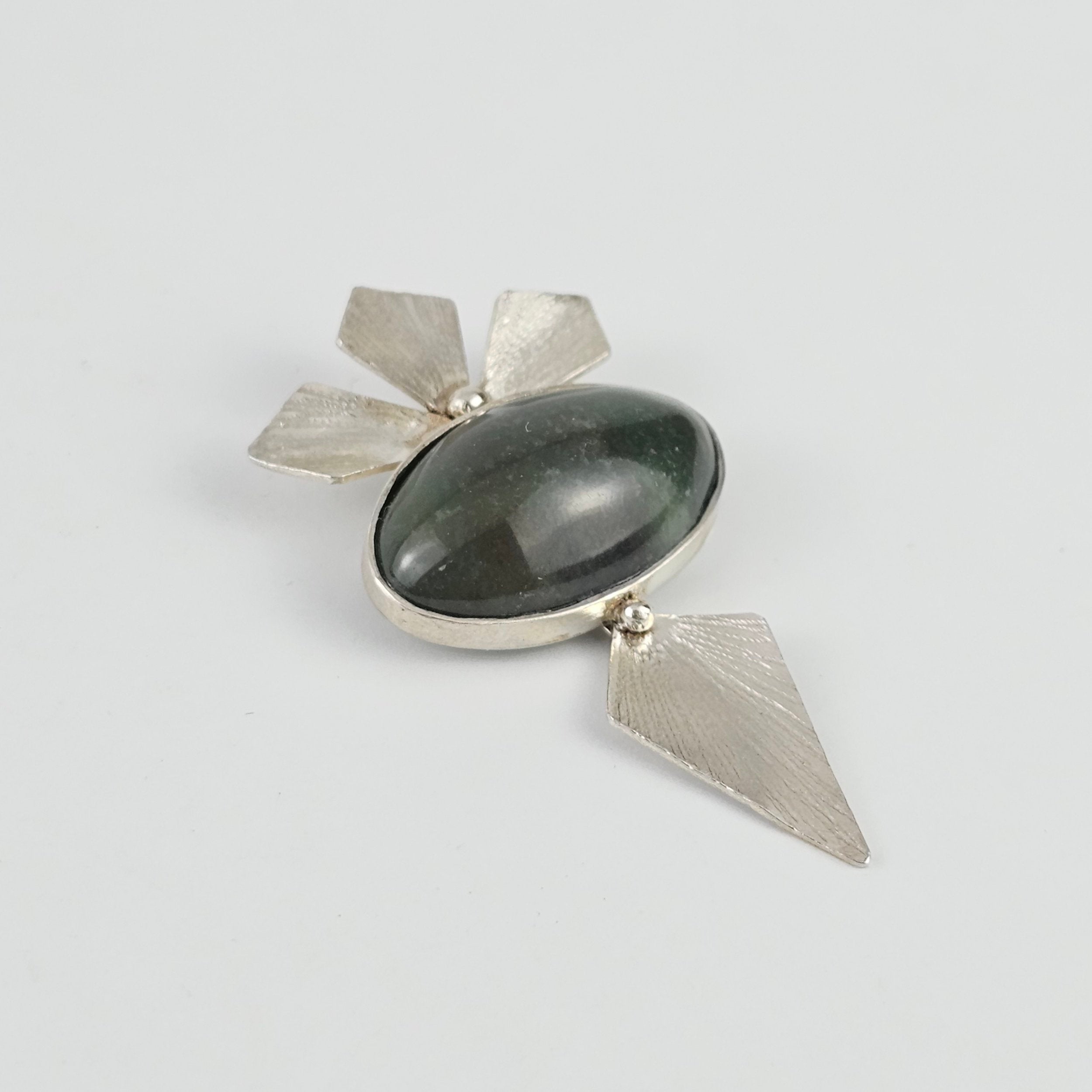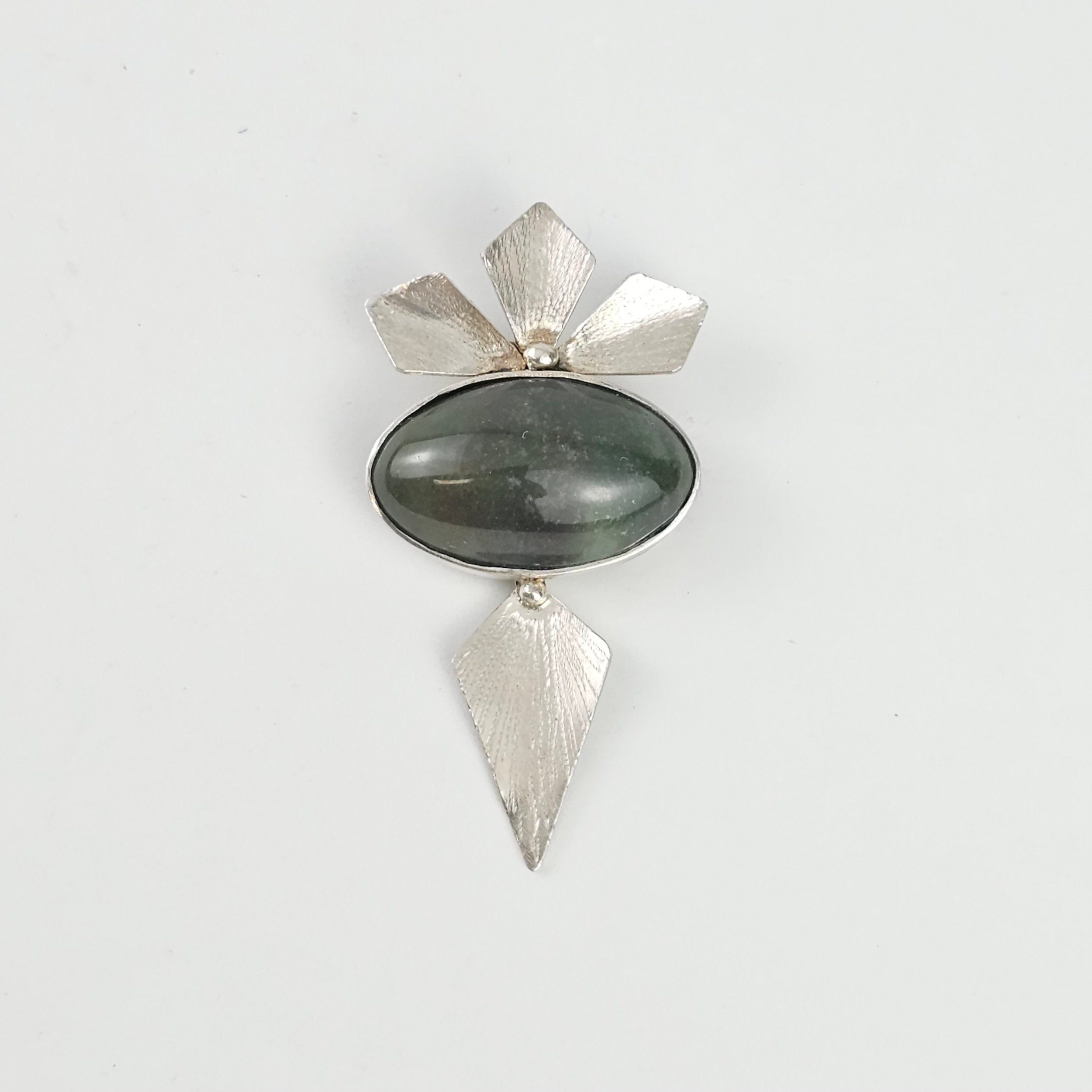 Crafted from high-quality silver, this handmade brooch measures 2 inches in length and 1 inch in width. Its elegant silver band showcases meticulous attention to detail. To preserve its finish, avoid exposure to water, harsh chemicals like perfumes and lotions, and store it in a sealed plastic bag when not worn. Clean gently without abrasive materials to maintain its pristine condition.