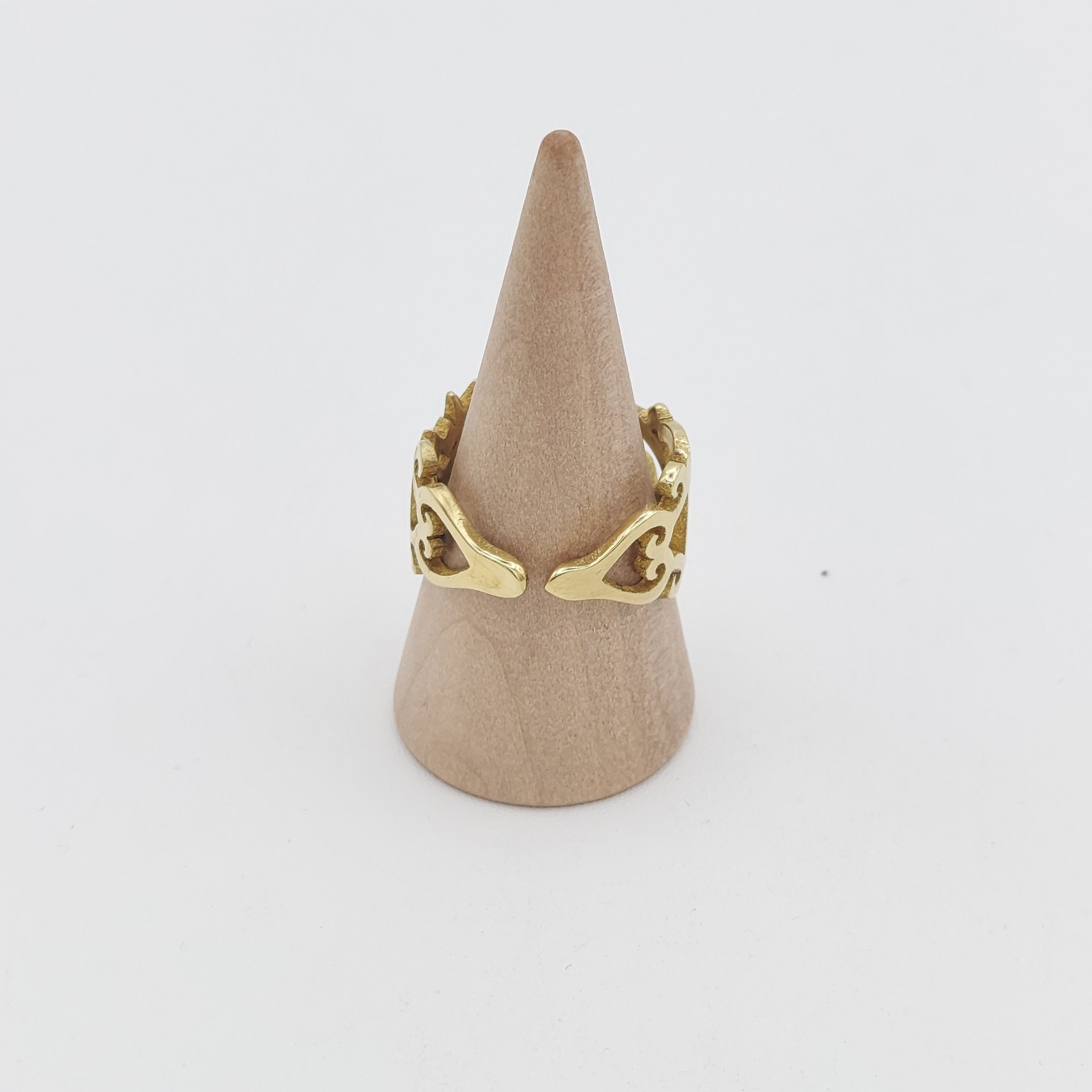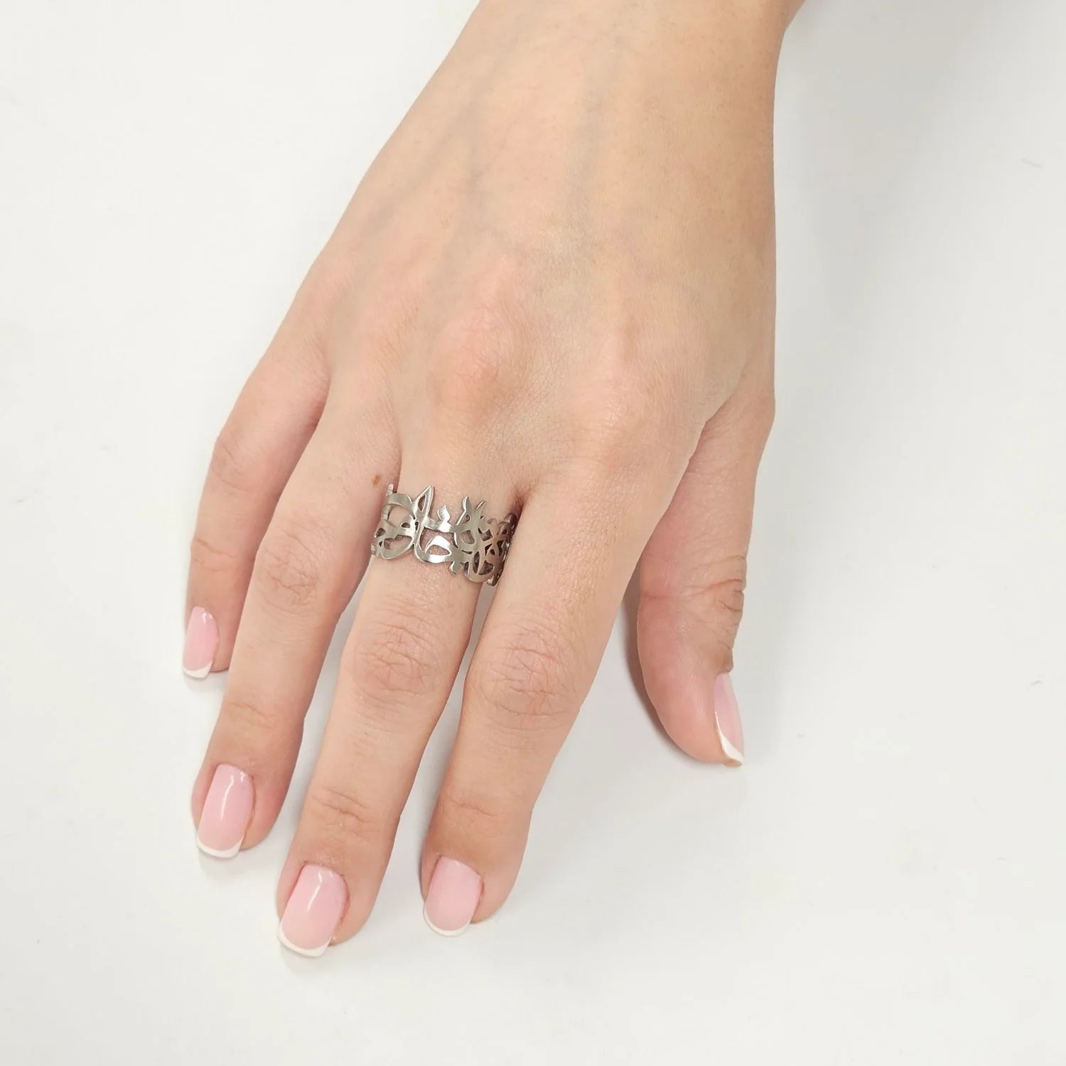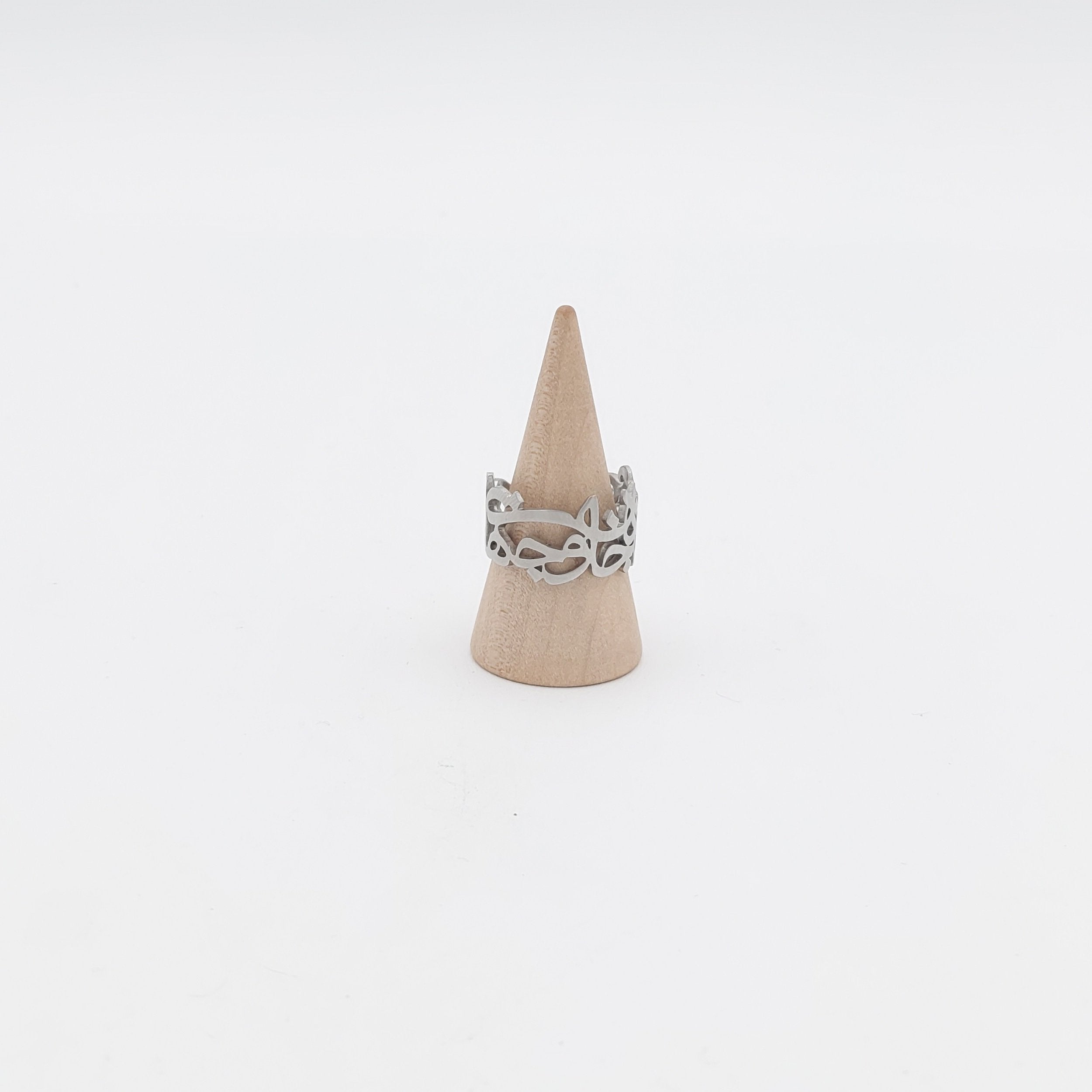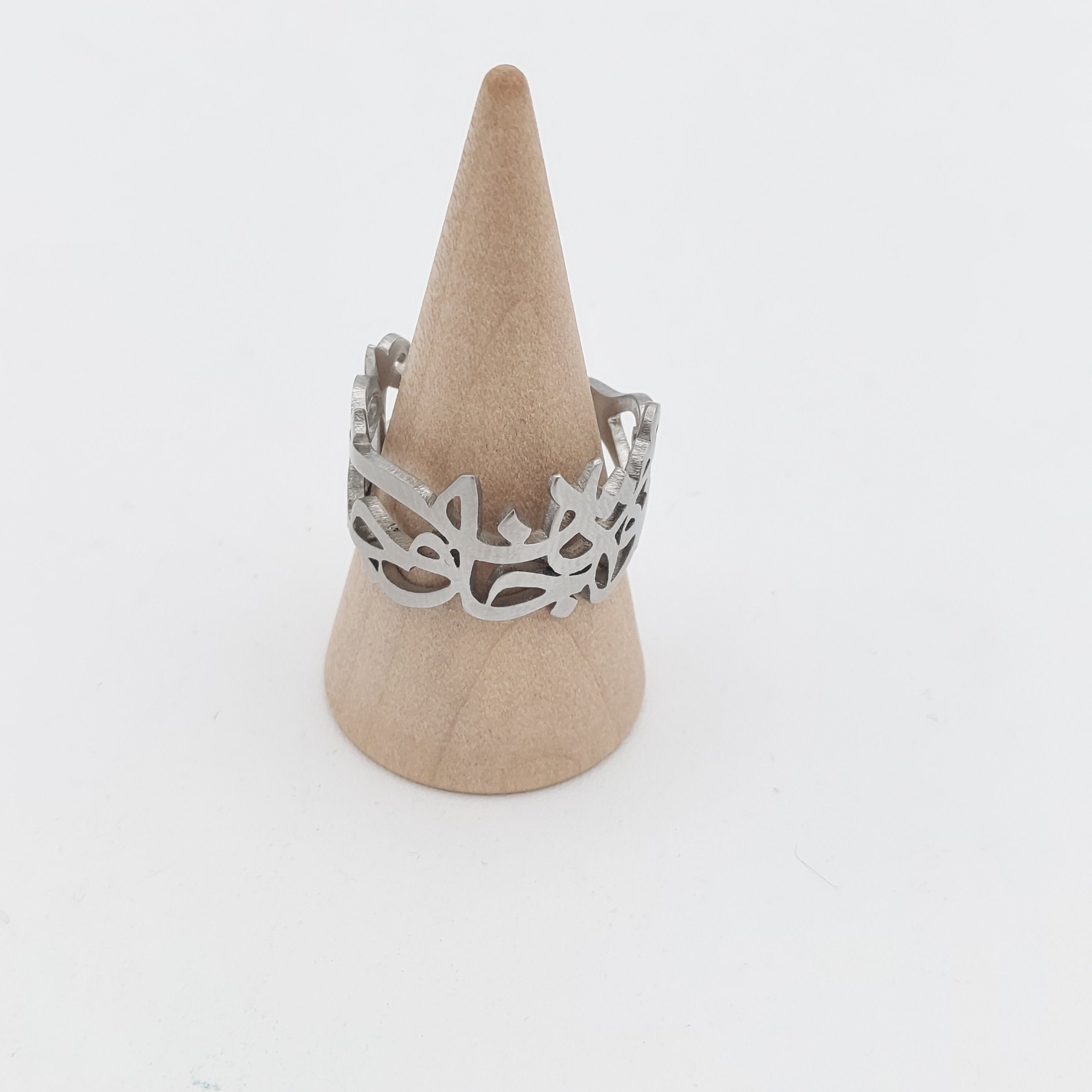 This handcrafted brass ring features exquisite calligraphy inspired by a verse from Rumi: "تو مرا جان و جهانی، چه کنم جان و جهان را," expressing profound mystical love and devotion. Made from recycled brass, the adjustable design ensures a perfect fit. Meticulous craftsmanship and premium materials highlight its quality. To preserve its beauty, avoid water, harsh chemicals, and abrasive cleaners; store in a sealed bag when not worn. This piece combines meaningful artistry with durable elegance for a timeless accessory.