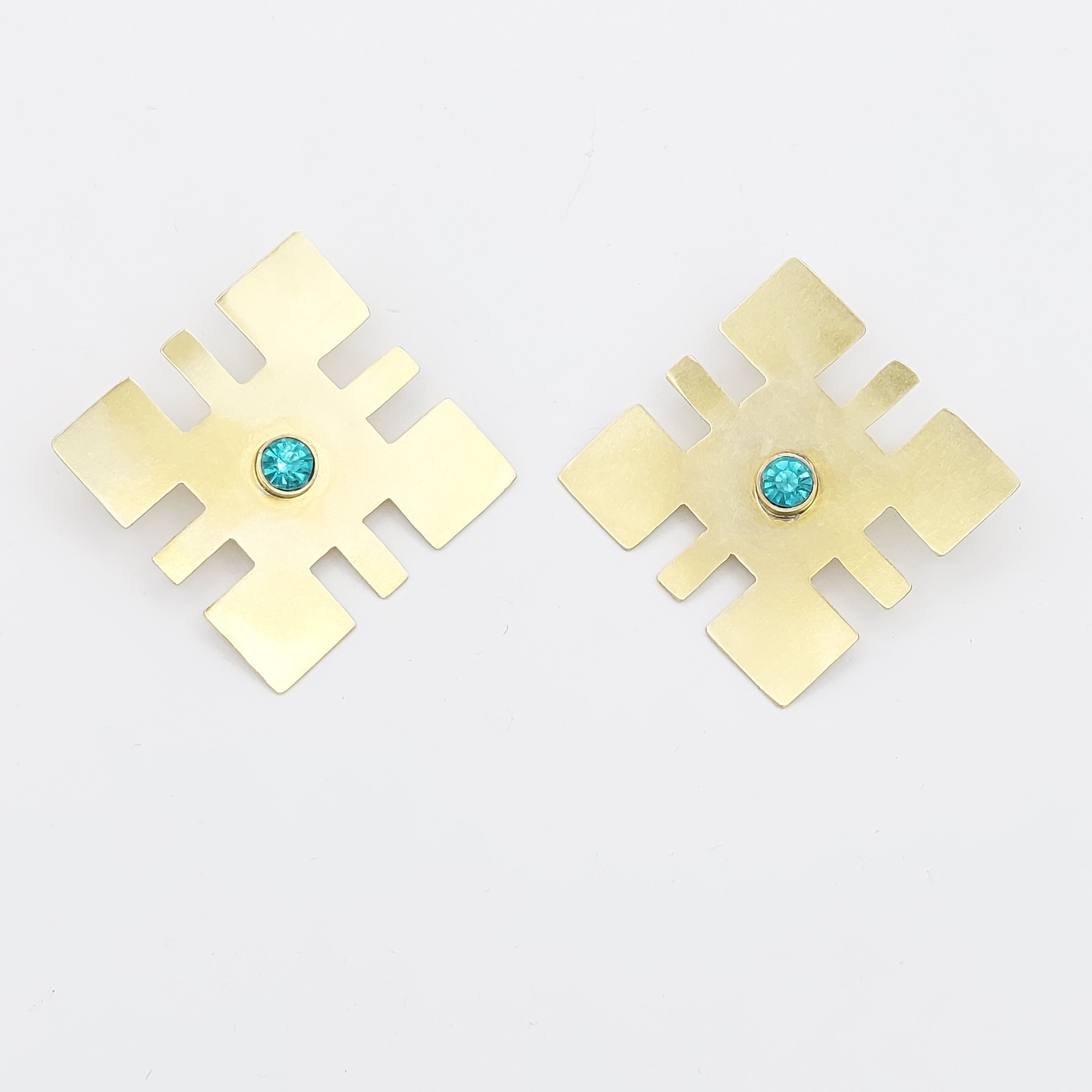 Crafted from brass, these handmade Kilim Earrings feature a striking blue gem in the center. They measure 5 x 5 cm, and are designed to comfortably adorn the earlobe with a secure push-back closure. Meticulous attention to detail ensures high-quality craftsmanship.
