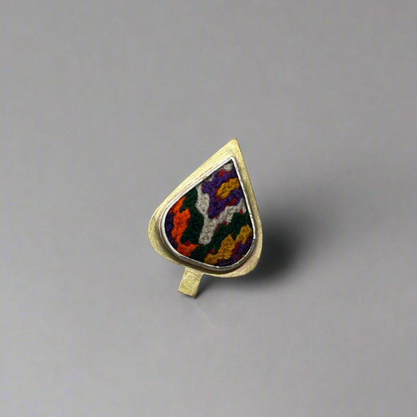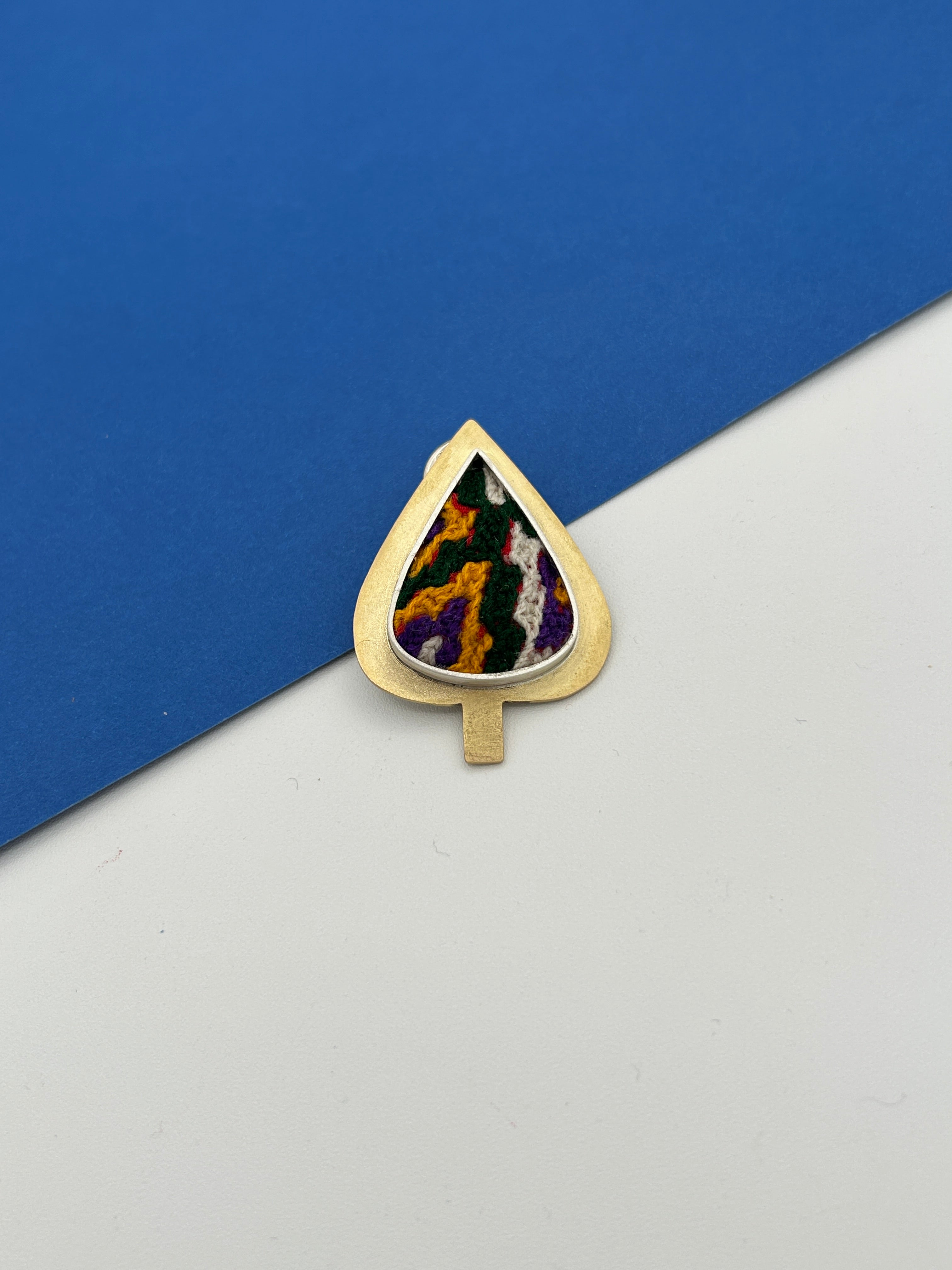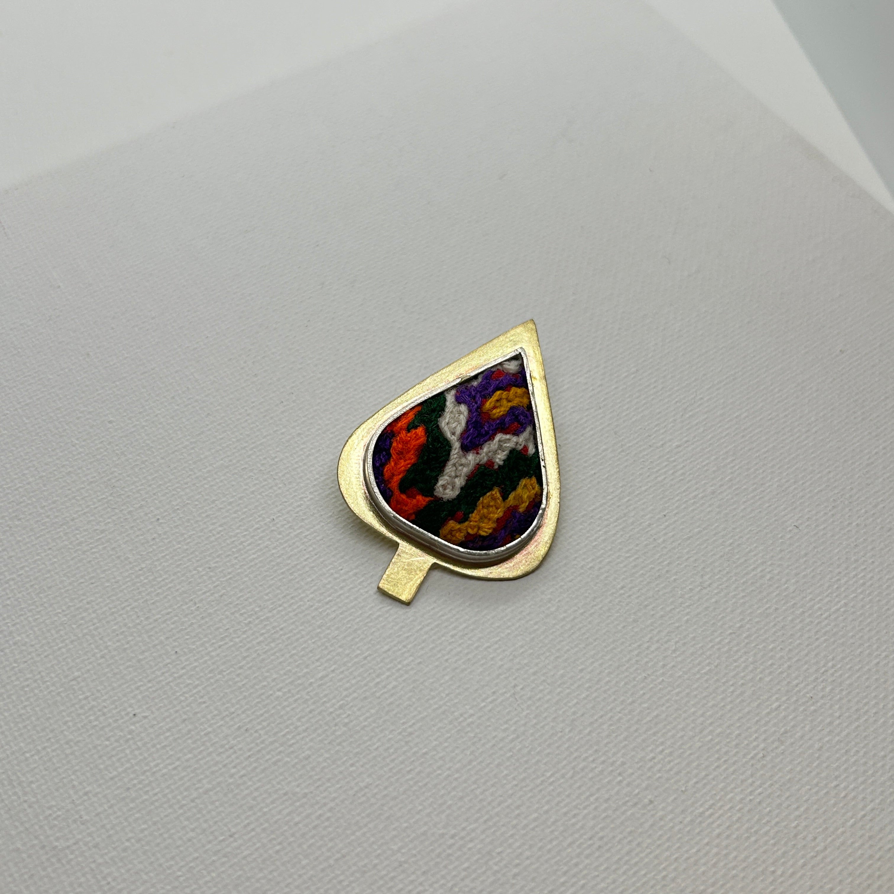 Crafted from brass, silver, and textile, this handmade brooch measures 1 3/4 inches in length and 1 1/4 inches in width. Its superior craftsmanship and quality materials ensure lasting elegance. To preserve its finish, avoid exposure to water, harsh chemicals like perfume and lotions, and store it in a sealed plastic bag when not worn. Clean gently without abrasive products to maintain its pristine condition.