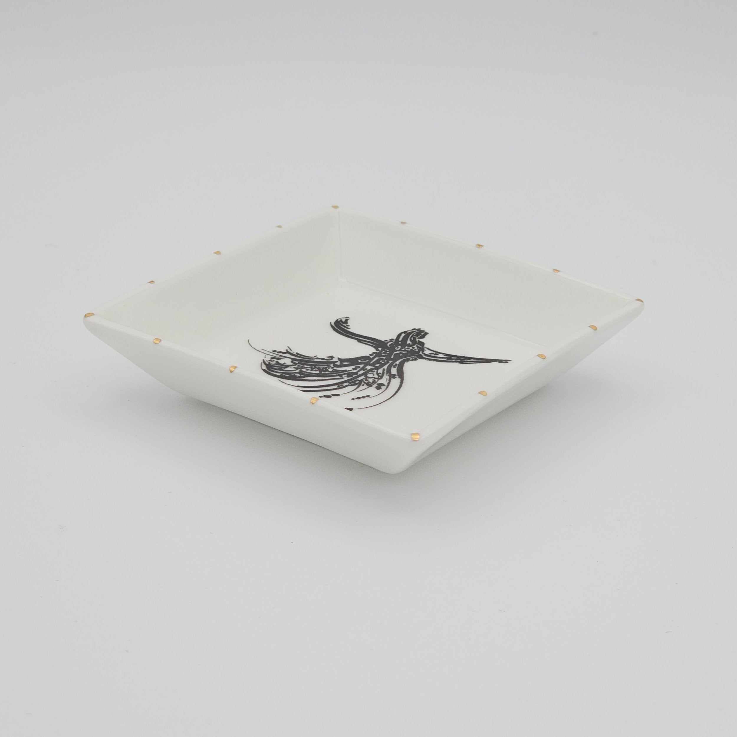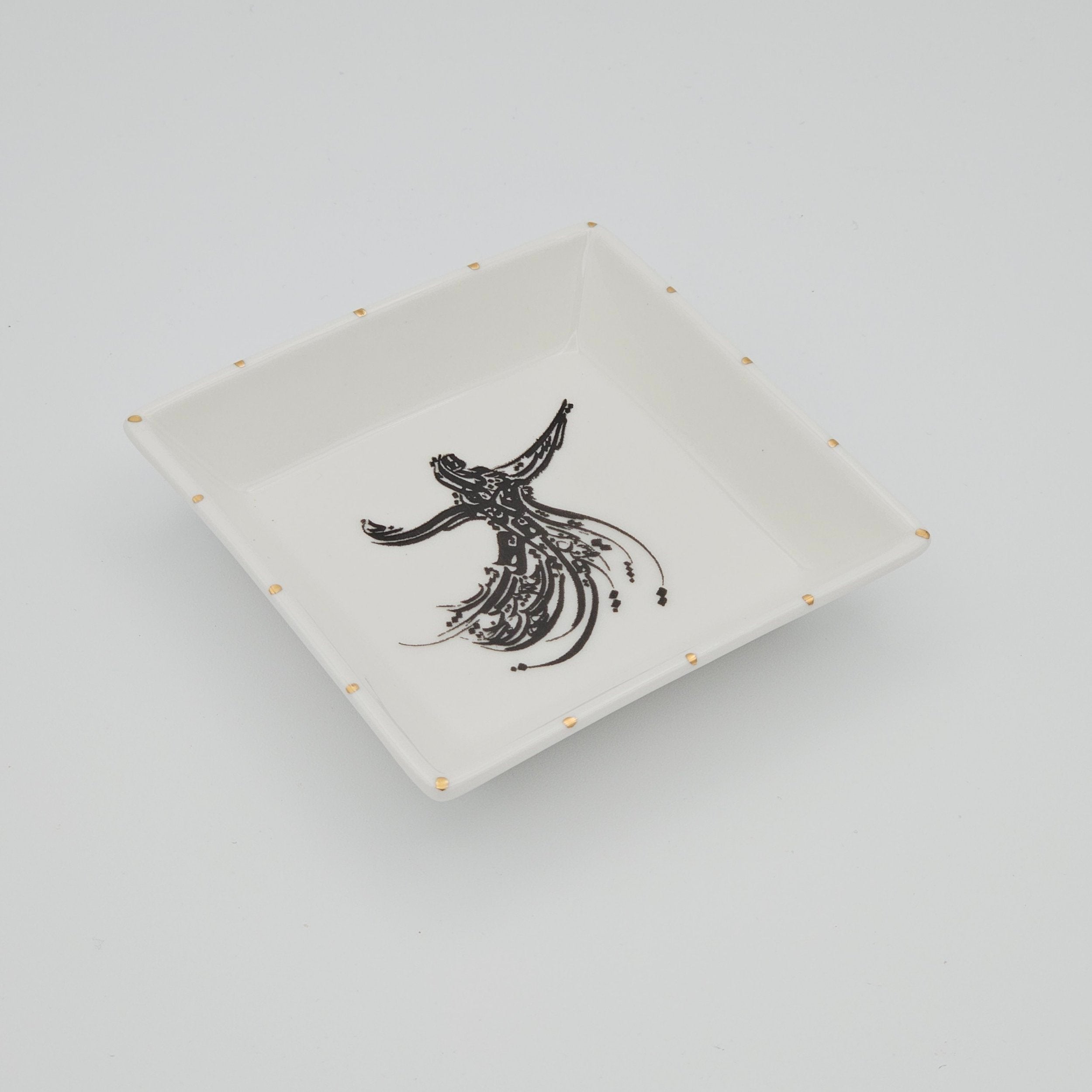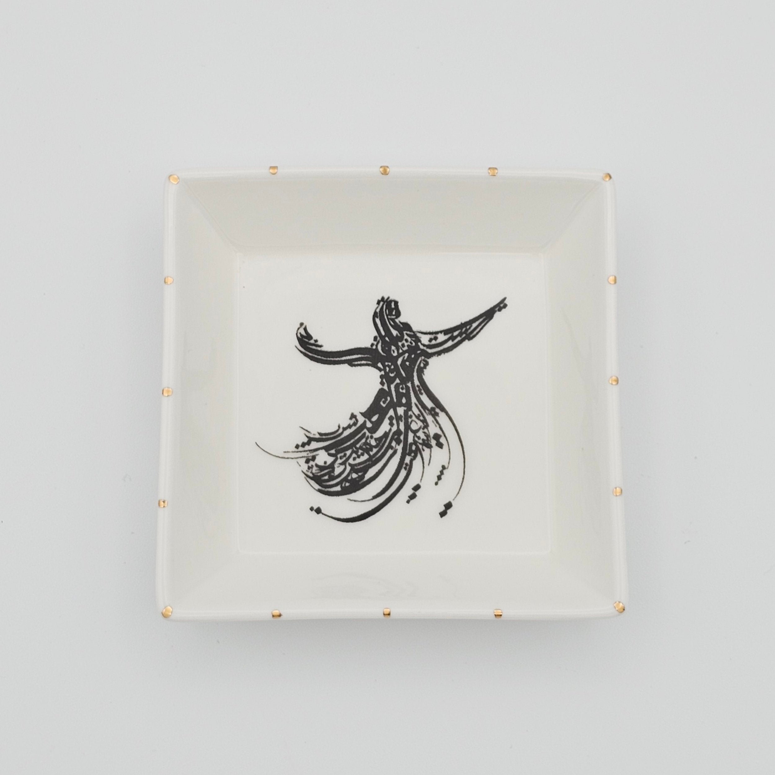 small square jewelry dish with gold touches on the edge and whirling dervish in center