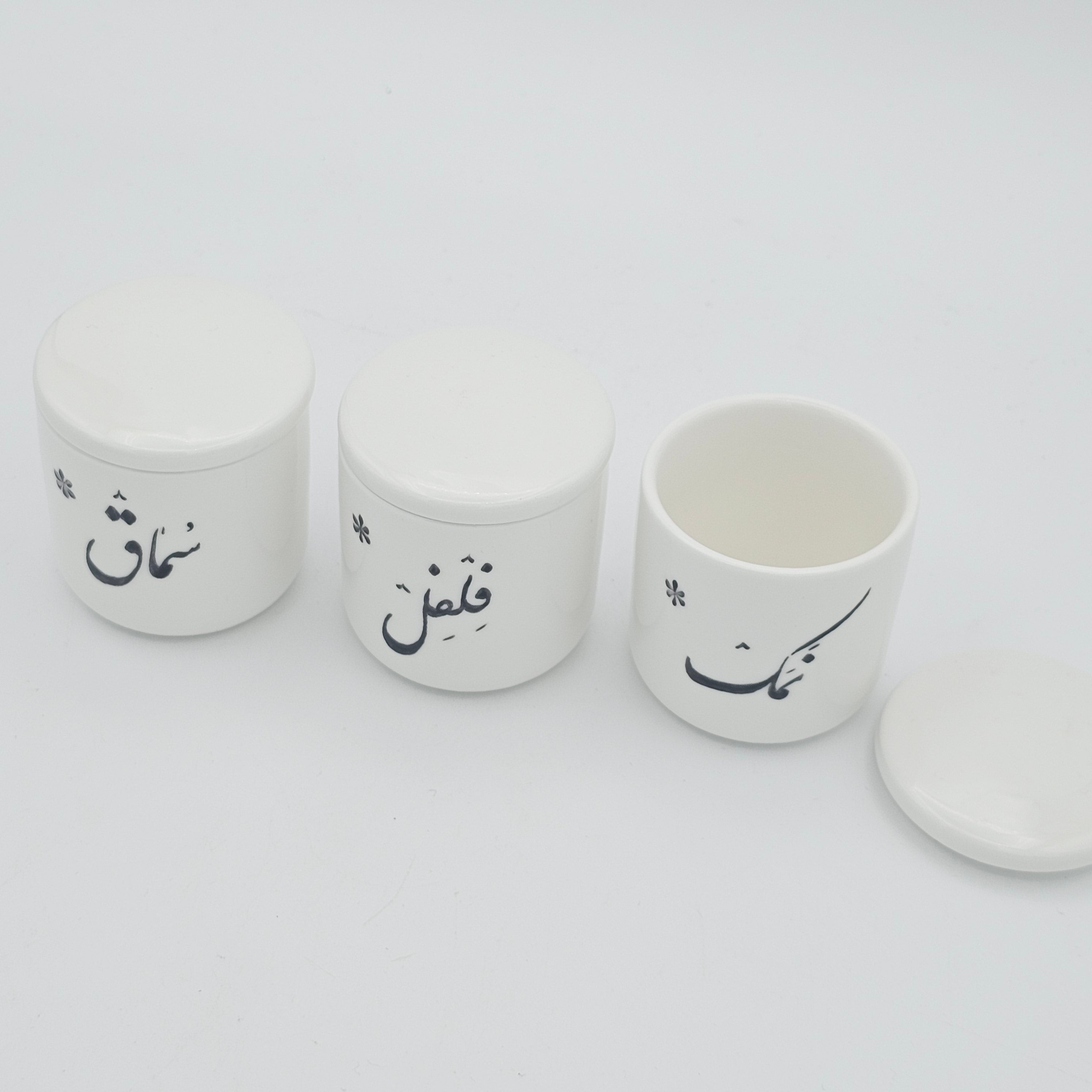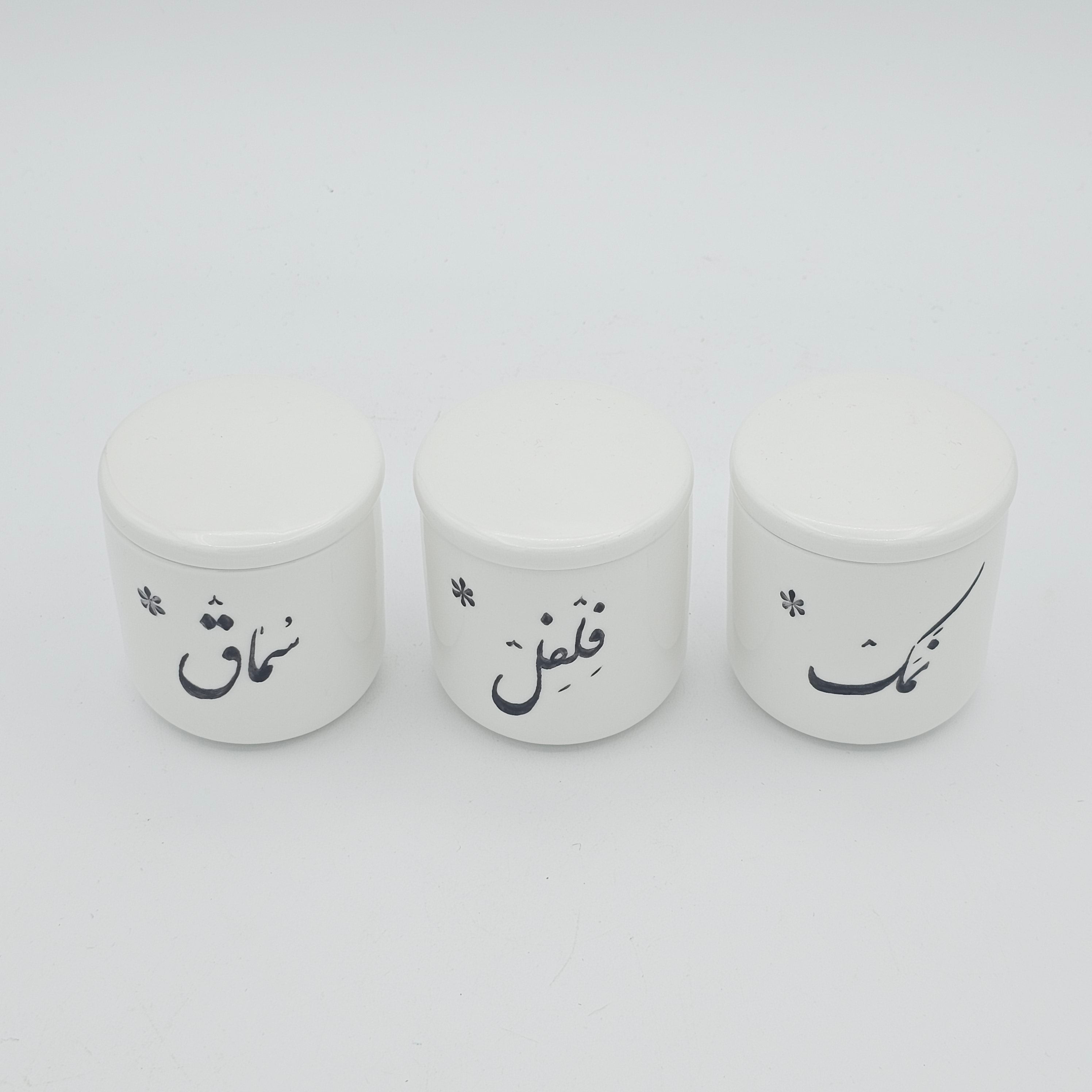 Hand painted with care, these porcelain spice jars feature salt, pepper, and sumac labels in Farsi, adding a unique cultural touch to your kitchen. Their compact size makes them ideal for keeping on your countertop or near the stove, ensuring your favorite spices are always within reach while cooking. Beyond their practical use, these jars bring an artistic charm to your kitchen décor. You can also personalize your set by custom ordering with any name or word you prefer. To request a custom design, simply email shopatdiyar@gmail.com and our team will gladly assist you.