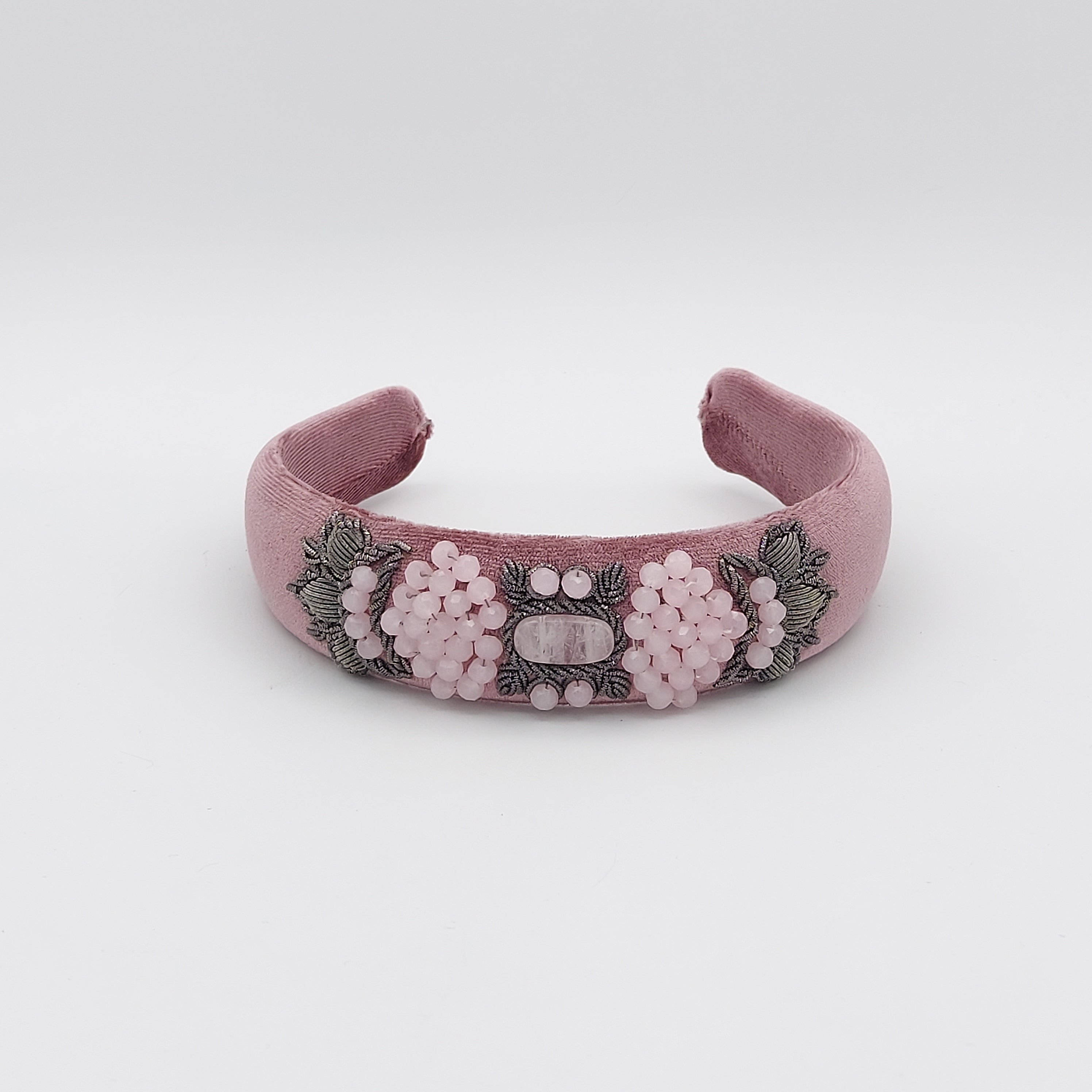 The exquisite Naazbanoo Hairband, a masterpiece by Noorarash Designs, is a handmade pink velvet hairband, adorned with intricate Sermeh embroidery, and semi-precious stones. This hairband showcases traditional craftsmanship merged with contemporary elegance. Comfortable and with a soft texture and hold, it ensures a perfect fit for any occasion.