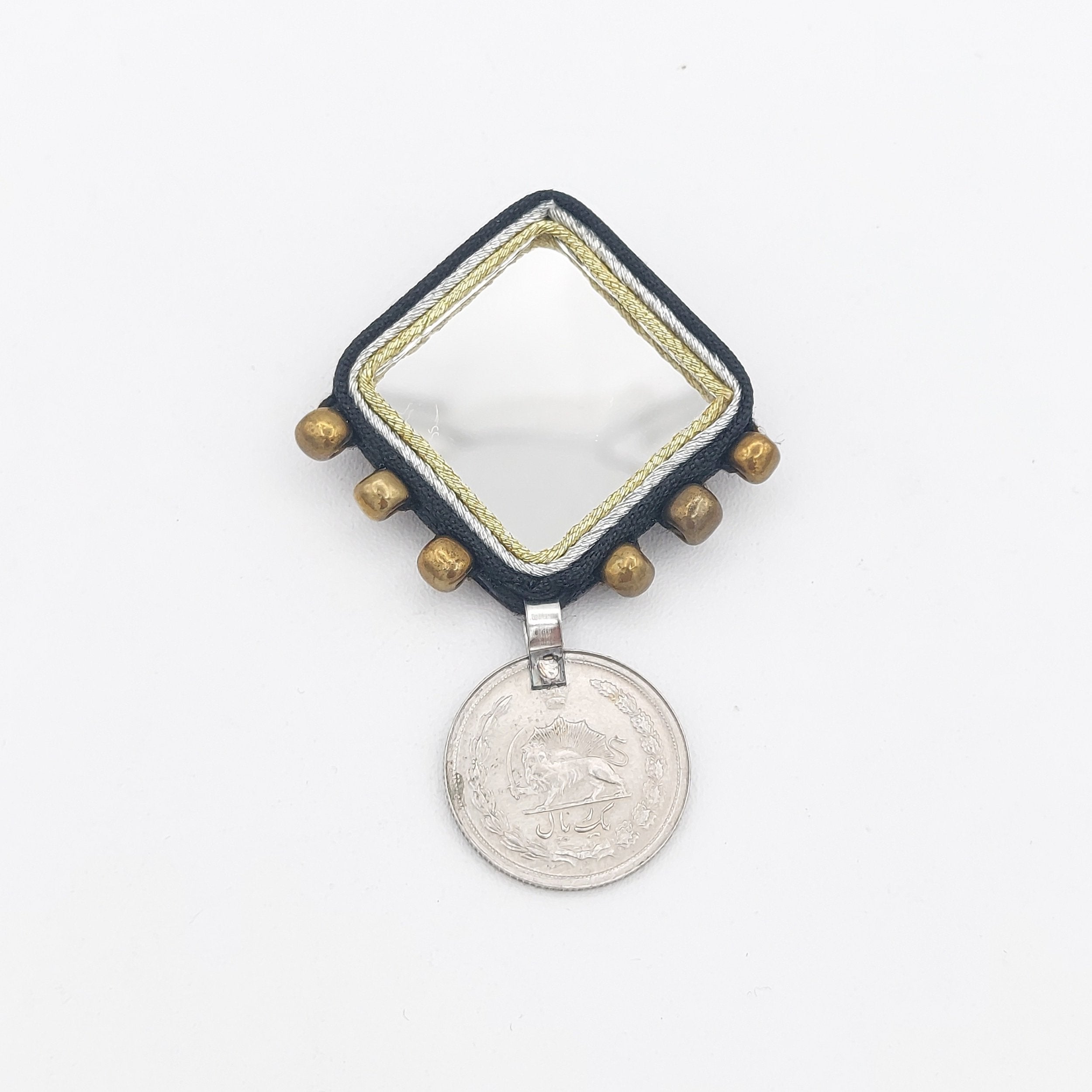 Crafted with fabric and mirror recycled materials, this handmade diamond brooch featuring a Pahlavi coin measures 2 inches in length and 1 1/4 inches in width. Designed with meticulous attention to detail, it combines quality and artistry. To preserve its condition, avoid exposure to water, harsh chemicals like perfume and lotions, and store it in a plastic bag when not in use. Clean gently without abrasive products to maintain its elegance.