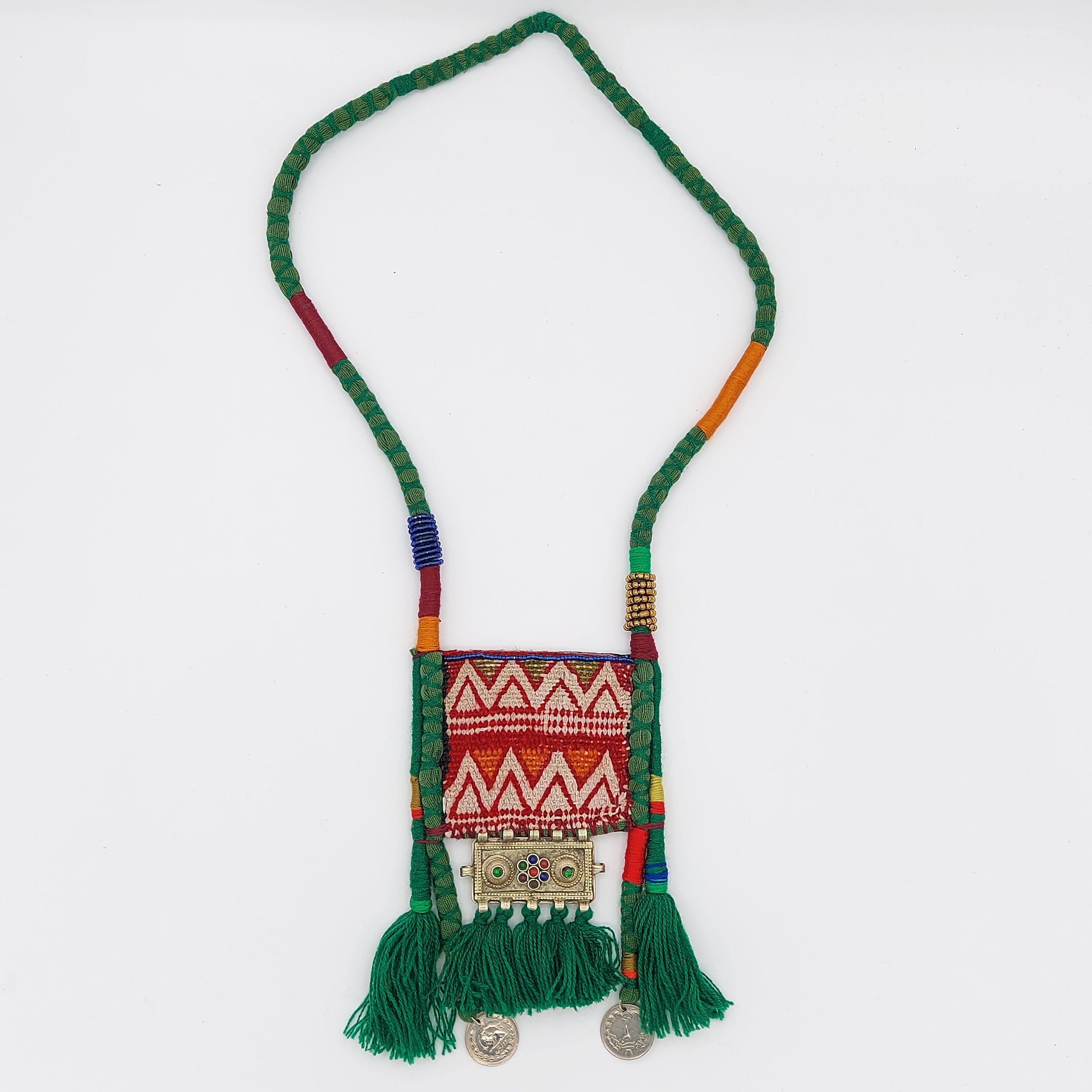 Sarvenaz Handmade Vintage Woven Necklace captures the timeless elegance of Persian textile artistry. This piece weaves together traditional patterns inspired by Persian rugs and ethnic designs, adorned with stones, Pahlavi coins, and delicate beads. This necklace is meticulously handcrafted, and its intricate detailing makes it a statement accessory for those who appreciate fine craftsmanship.