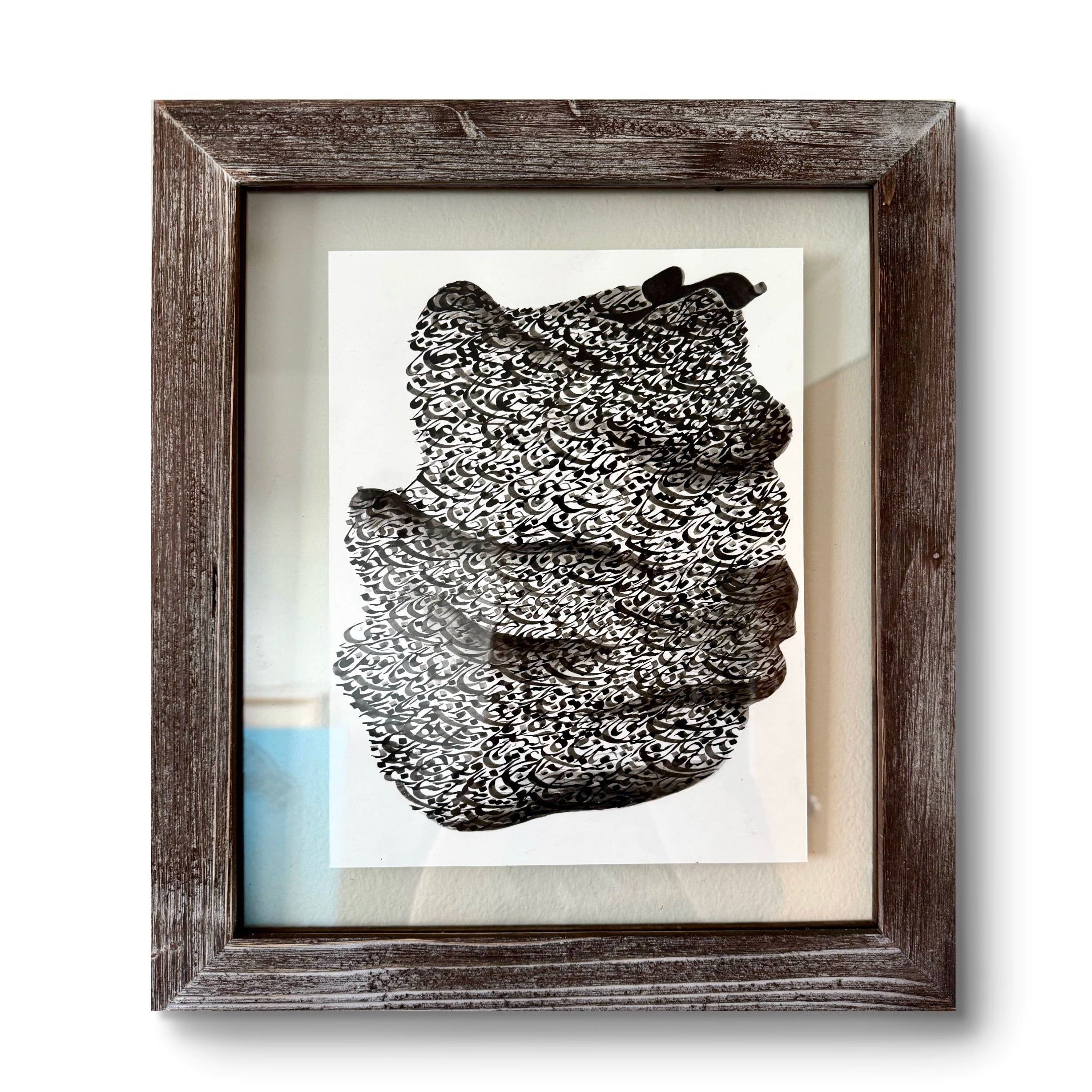This artwork features the Rubaiyat of Khayyam, meticulously calligraphed in ink on cardboard by artist Targol Hajjarian. It is presented within a wooden frame measuring 17 1/4” by 15 1/4”, with the calligraphy itself sized at 11 1/2” by 9”. To preserve its quality, gently clean with a dry or slightly damp cloth and avoid exposure to water, which can harm the materials.