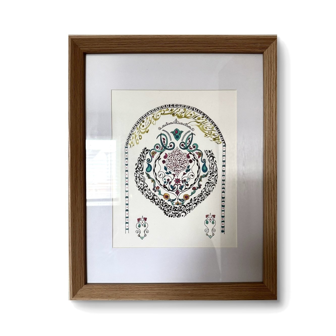 This artwork, titled "The Gate of The Garden of Paradise," features ink and acrylic on cardboard, inspired by the poems of Hafez. Created by artist Targol Hajjarian, it is presented within a wooden frame measuring 15” by 12”, with the calligraphy itself sized at 10” by 7.5”. To preserve its quality, gently clean with a dry or slightly damp cloth and avoid exposure to water, which can harm the materials.