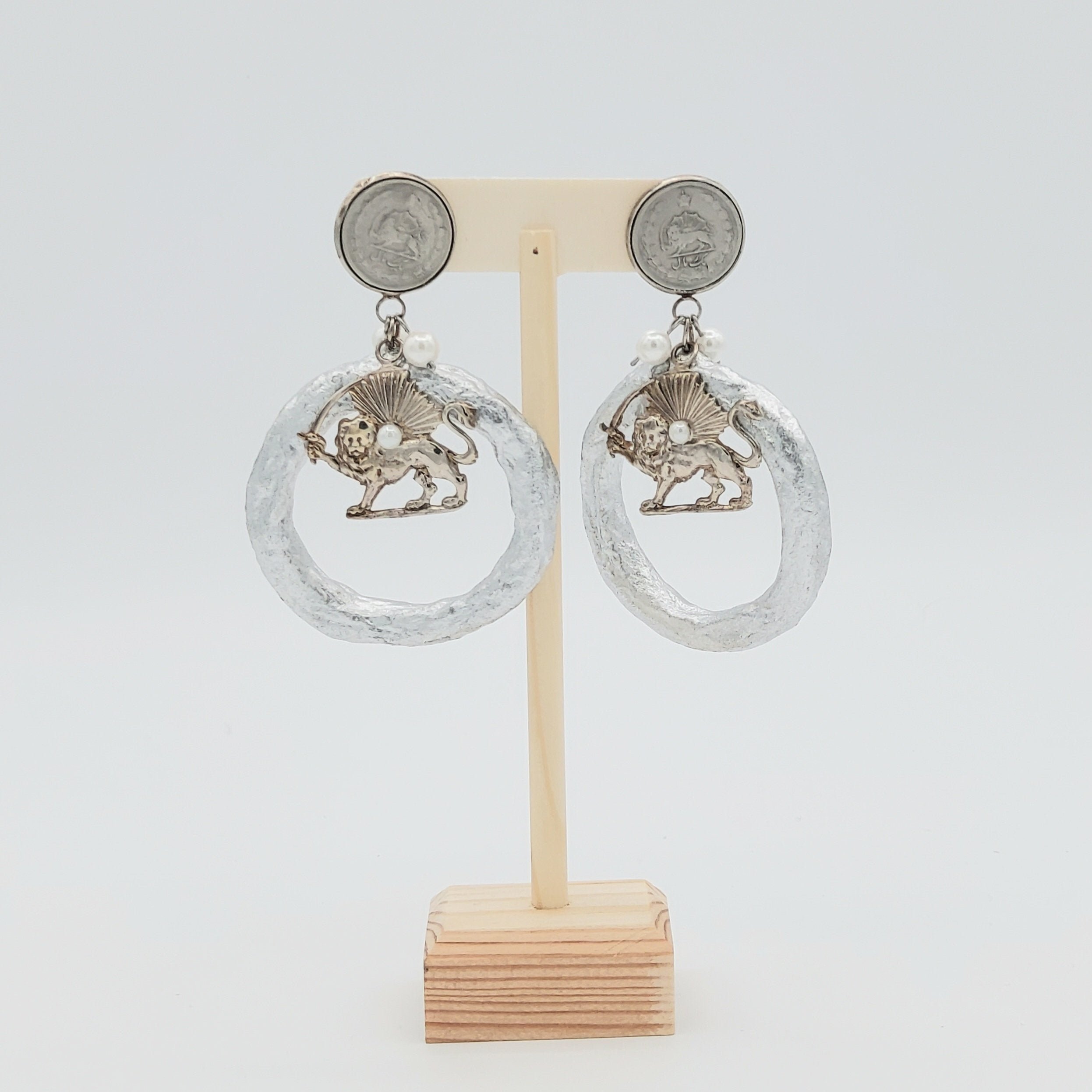 Crafted from paper mâché, these and Silver Shirokhorshid earrings feature an authentic Pahlavi coin, designed to adorn the earlobe with a secure push-back closure. Measuring 3 inches in length and 2 inches in width, they are handmade and ideal for daily wear or as a thoughtful gift. To maintain their quality, avoid exposure to water, harsh chemicals, and abrasive cleaners. Store them in a plastic bag when not in use to prevent air contact and preserve their condition.