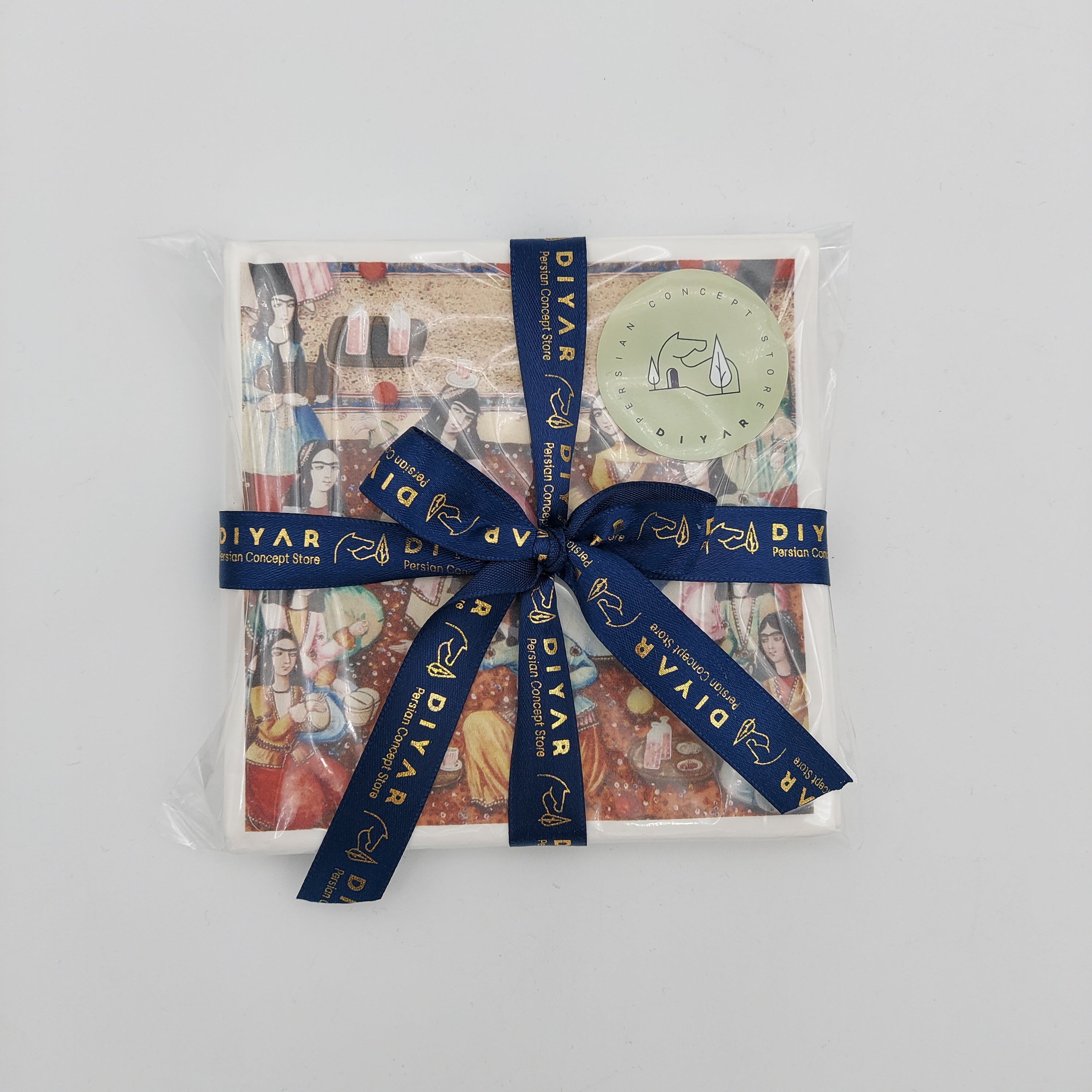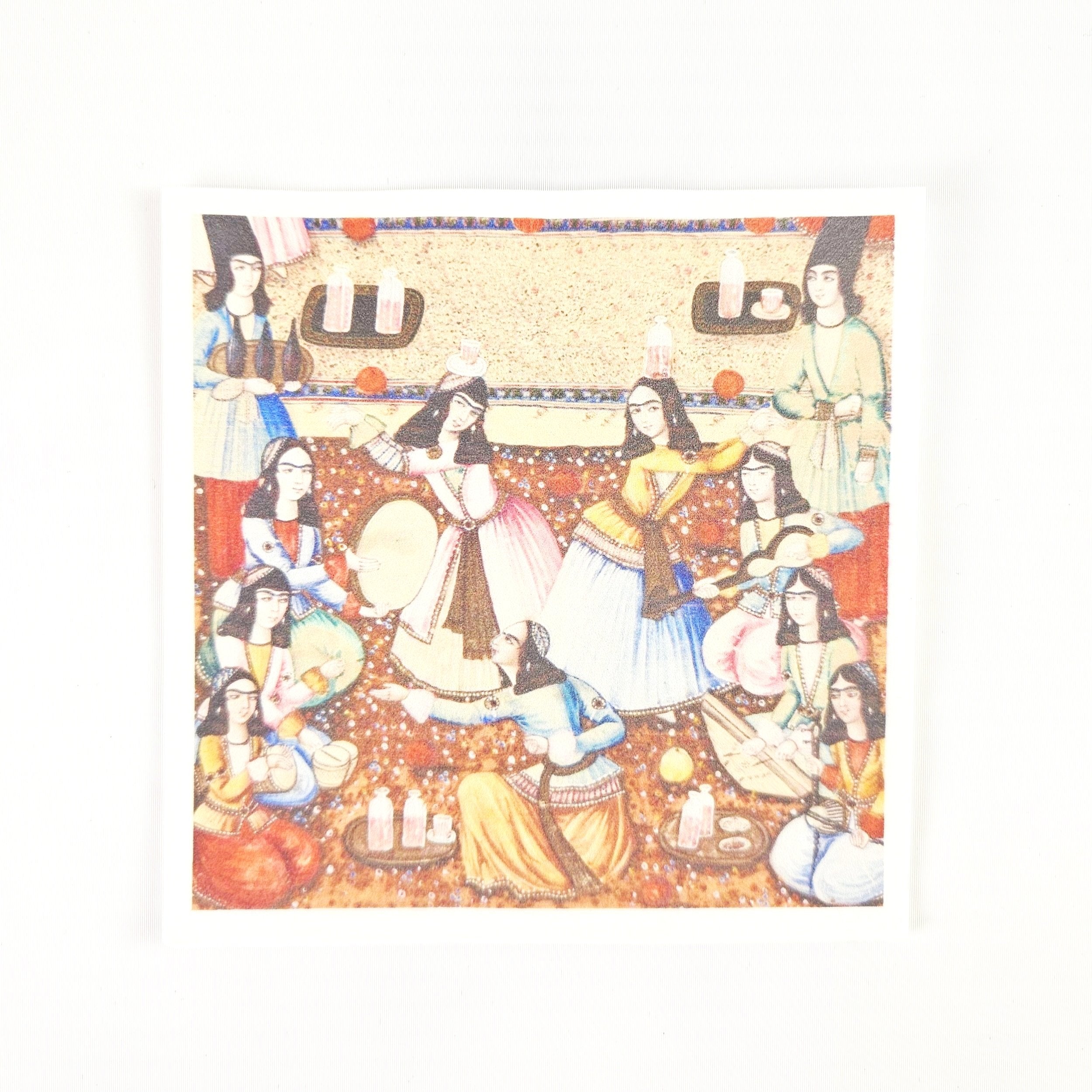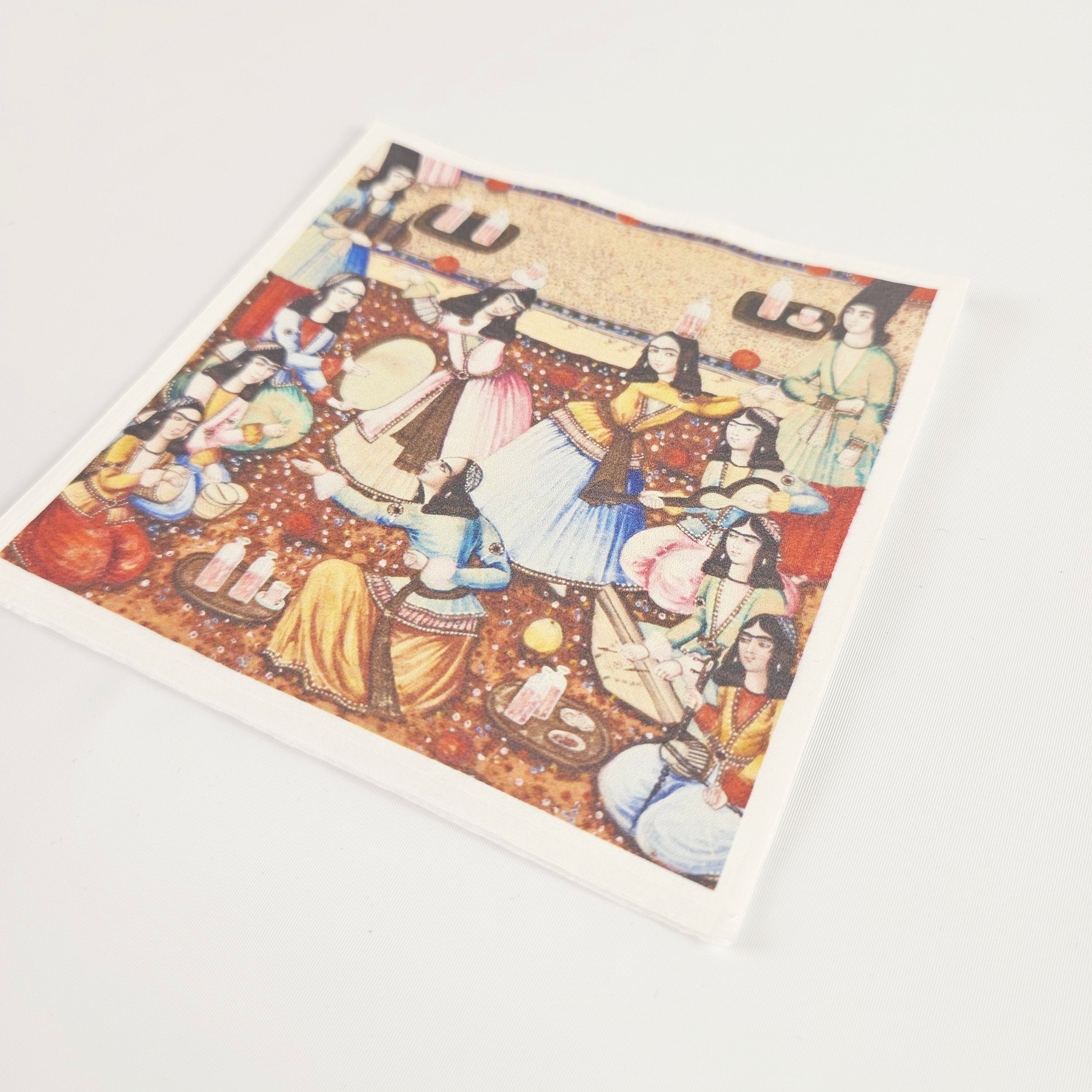 Immerse yourself in the beauty and rich culture of Persian art with this exquisite set of Persian Miniature Designs. The designs intricately depicts a scene of the Ghajar feast, capturing the essence of traditional Persian artistry. Add a touch of elegance and sophistication to your table with this pack of 20 three-layer paper napkins featuring these stunning designs. Perfect for any gathering, these napkins will surely impress your guests and elevate the ambiance of your event. Bring home a piece of Persian history and art to adorn your surroundings. Don't miss the opportunity to own these unique and culturally significant artworks.