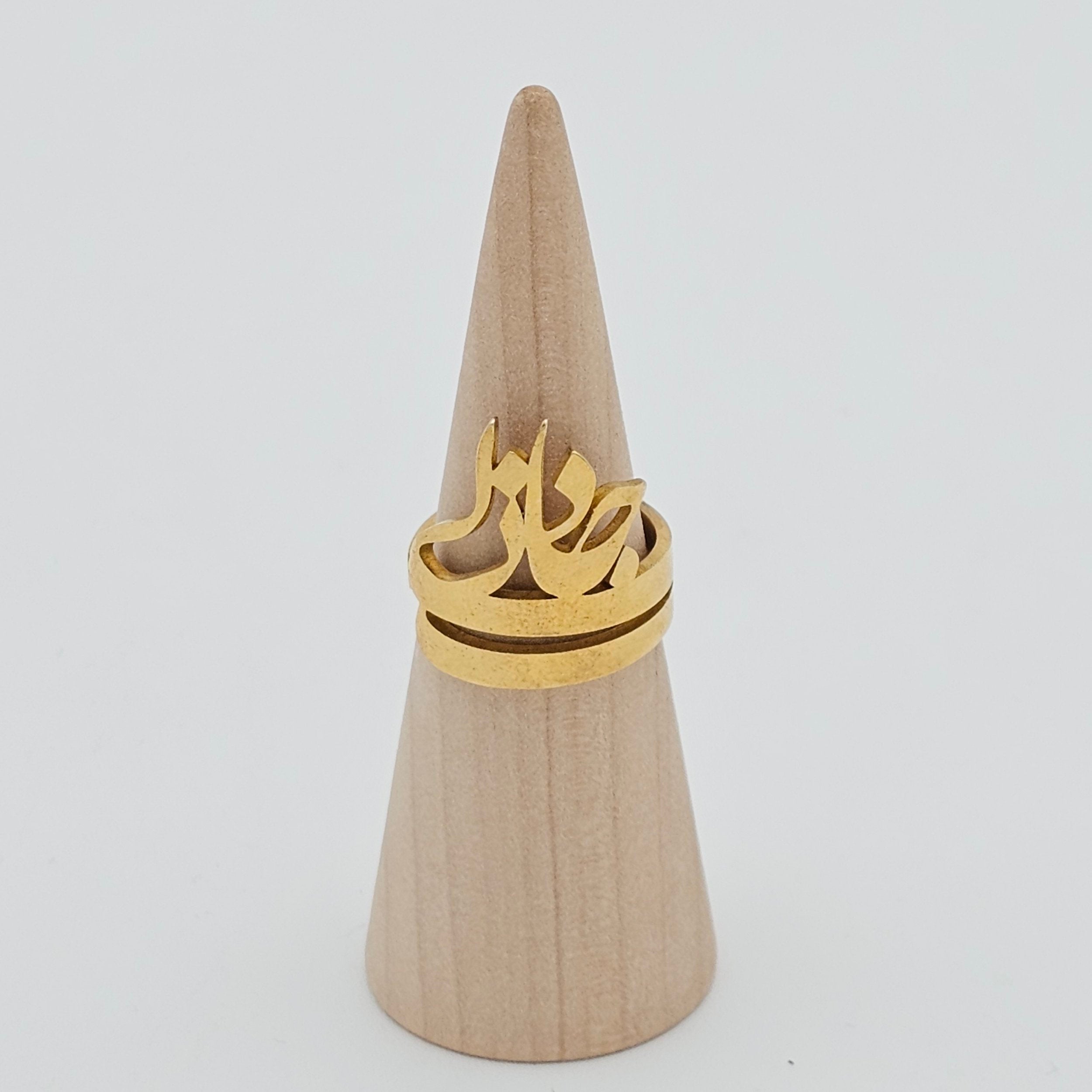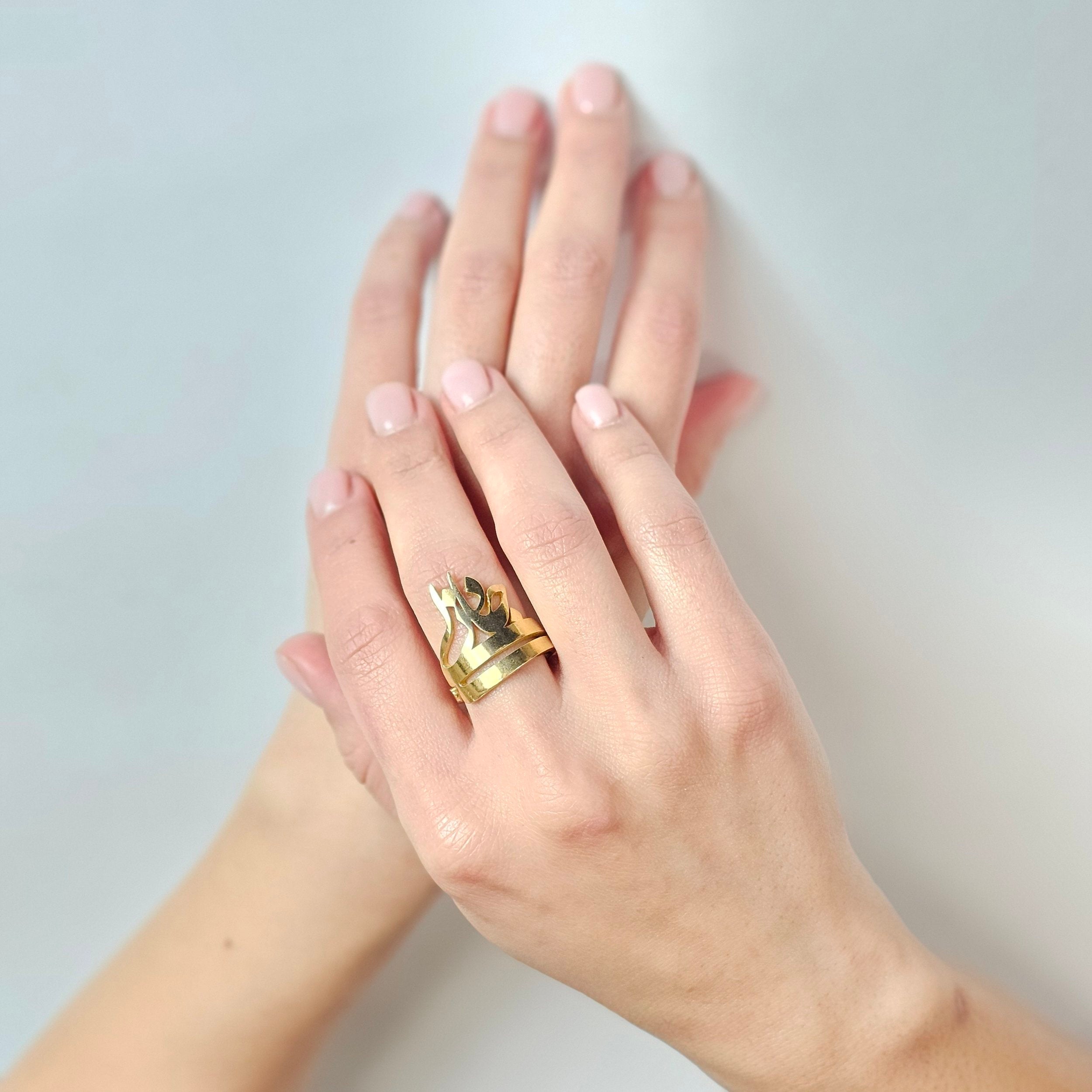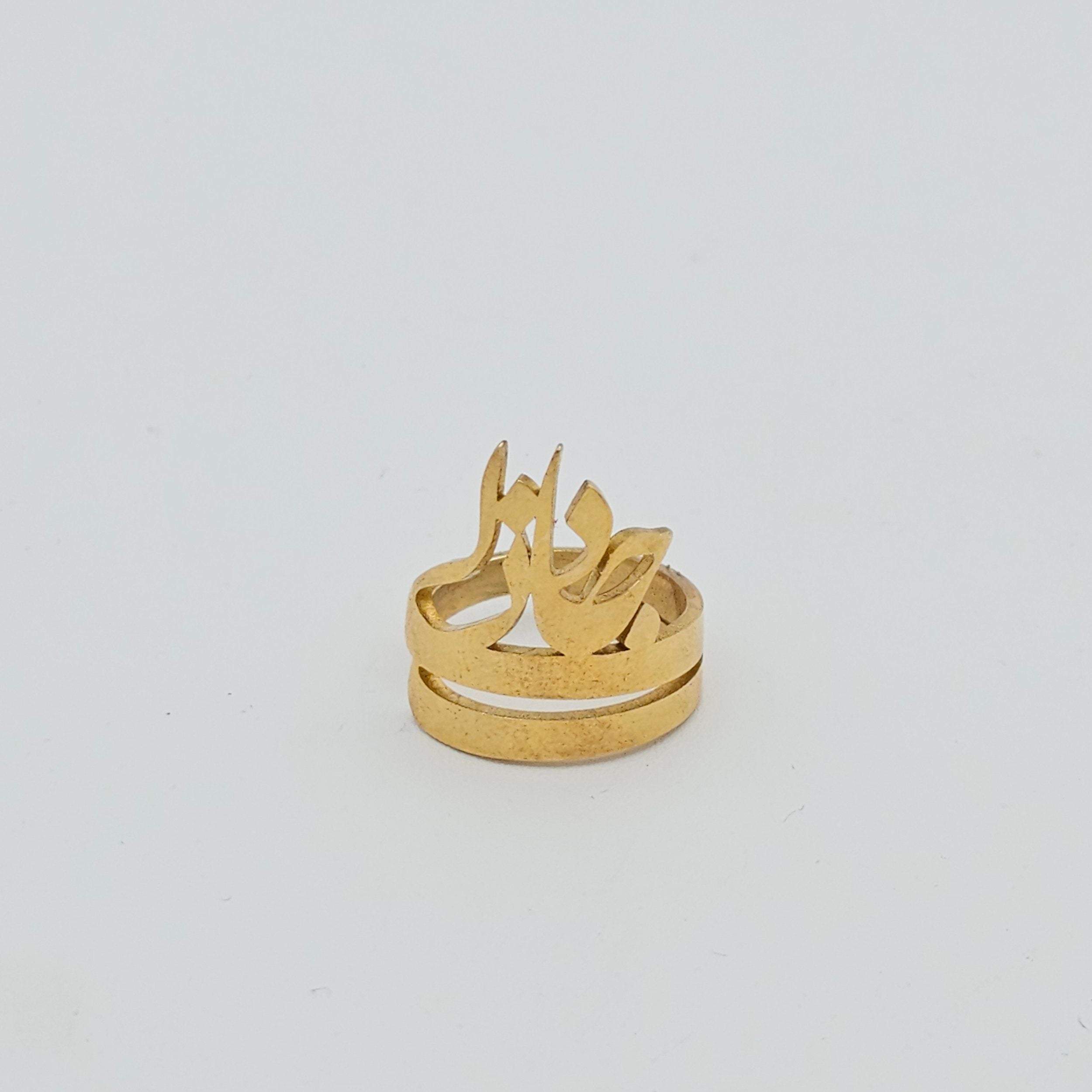 This handcrafted brass ring features recycled materials and elegant calligraphy design, measuring approximately 1” by 3/4”. Made with high-quality brass, it offers an adjustable, free-size fit for versatile wear. To maintain its finish, avoid exposure to water, harsh chemicals, and abrasive cleaners. Store the ring in a sealed plastic bag when not in use to prevent oxidation and preserve its craftsmanship.