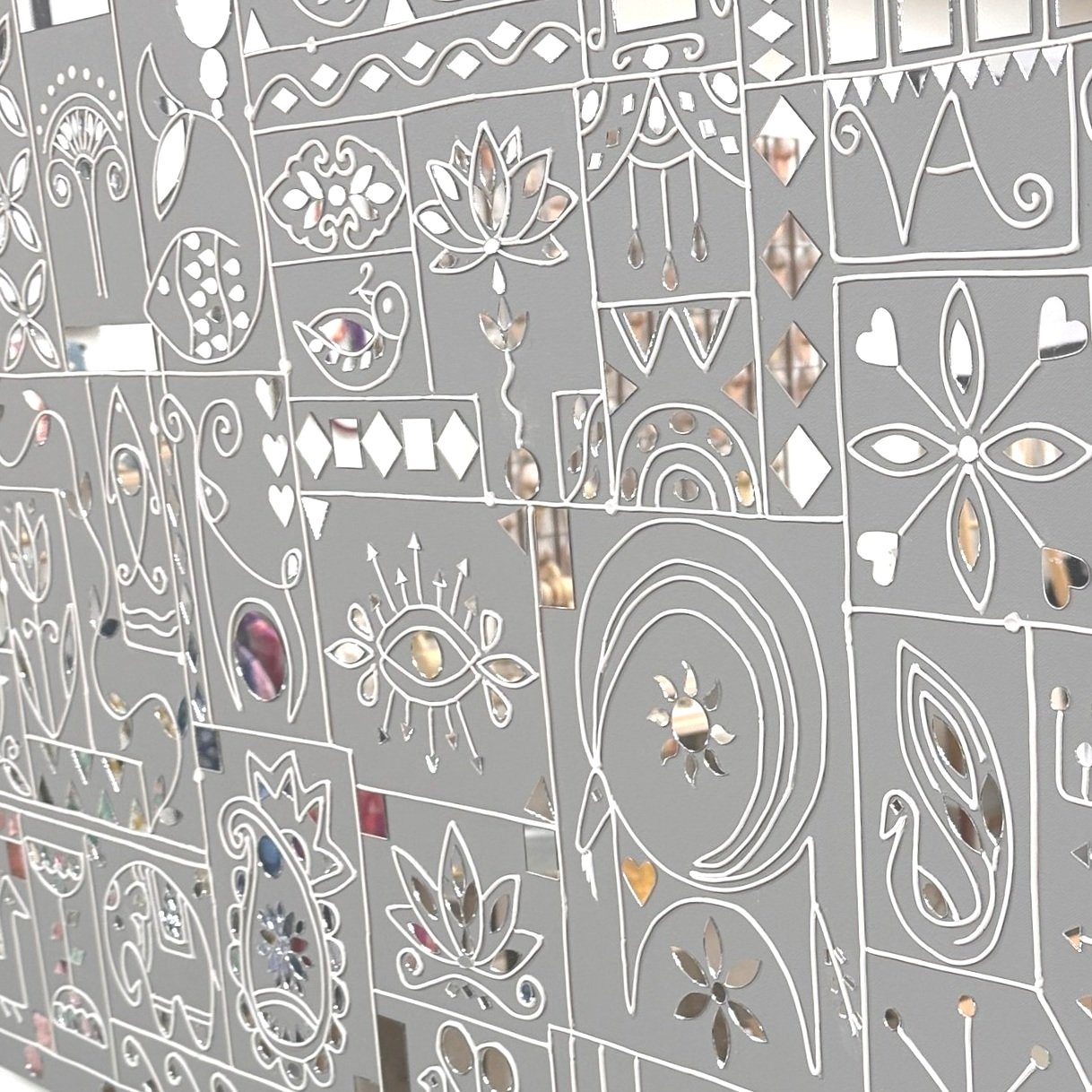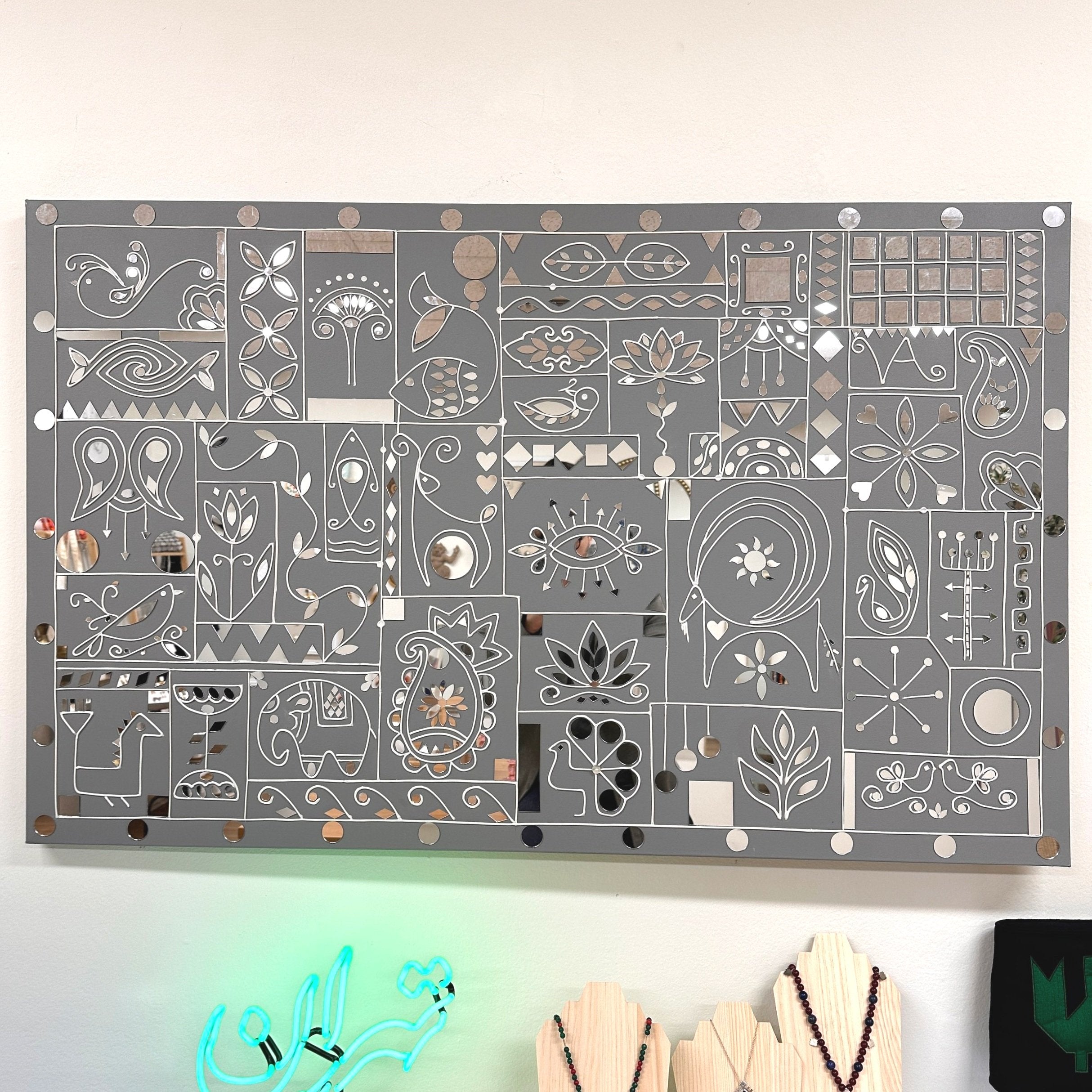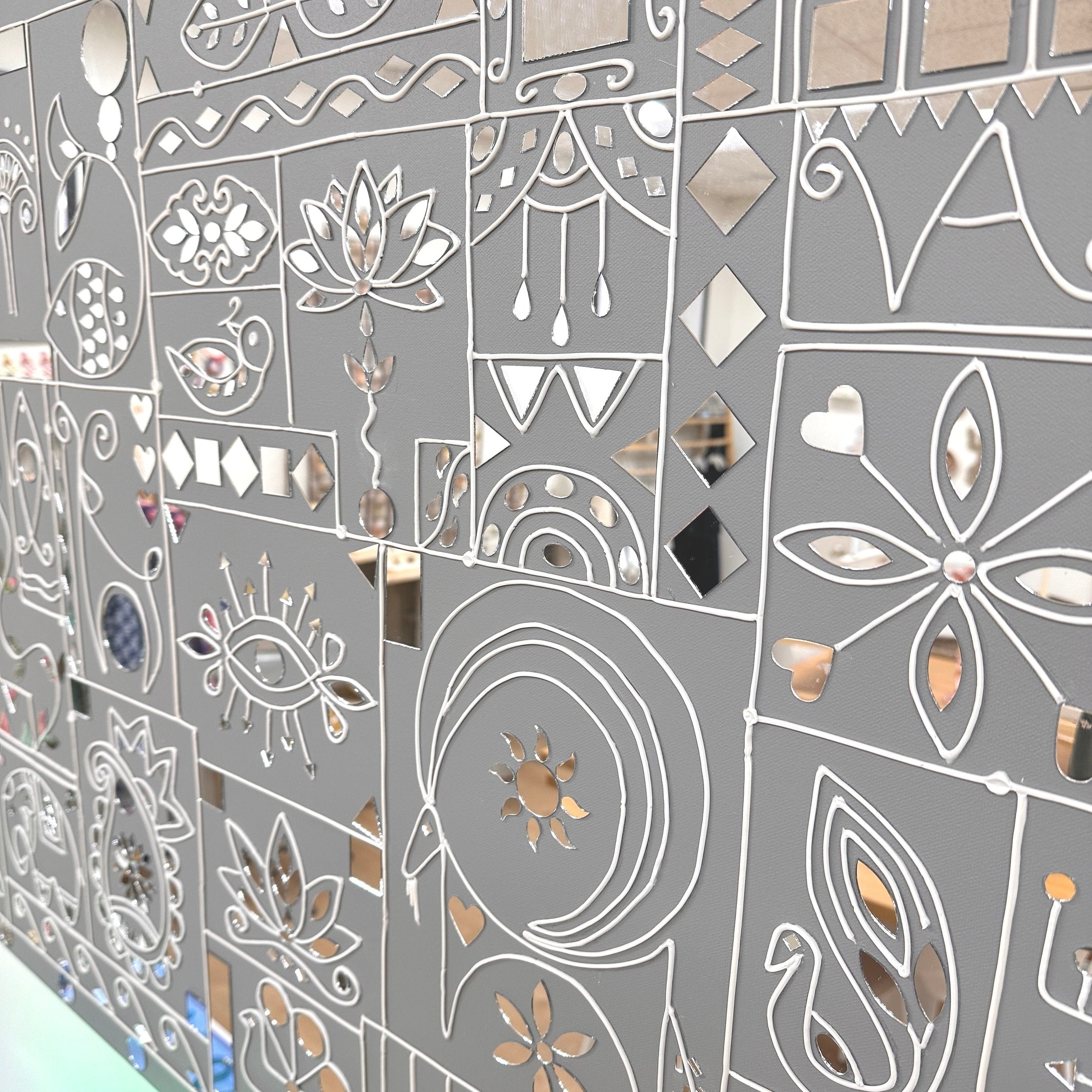 At Diyar Concept Store, our Lipan Wall Art is infused with Persian motifs, blending the elegance of Persian artistic heritage with the intricate craftsmanship of Indian Lipan work. The use of floral, arabesque, and geometric Persian designs combined with mirrors and layered textures results in a mesmerizing fusion of both cultures, making it a perfect statement piece for any interior.