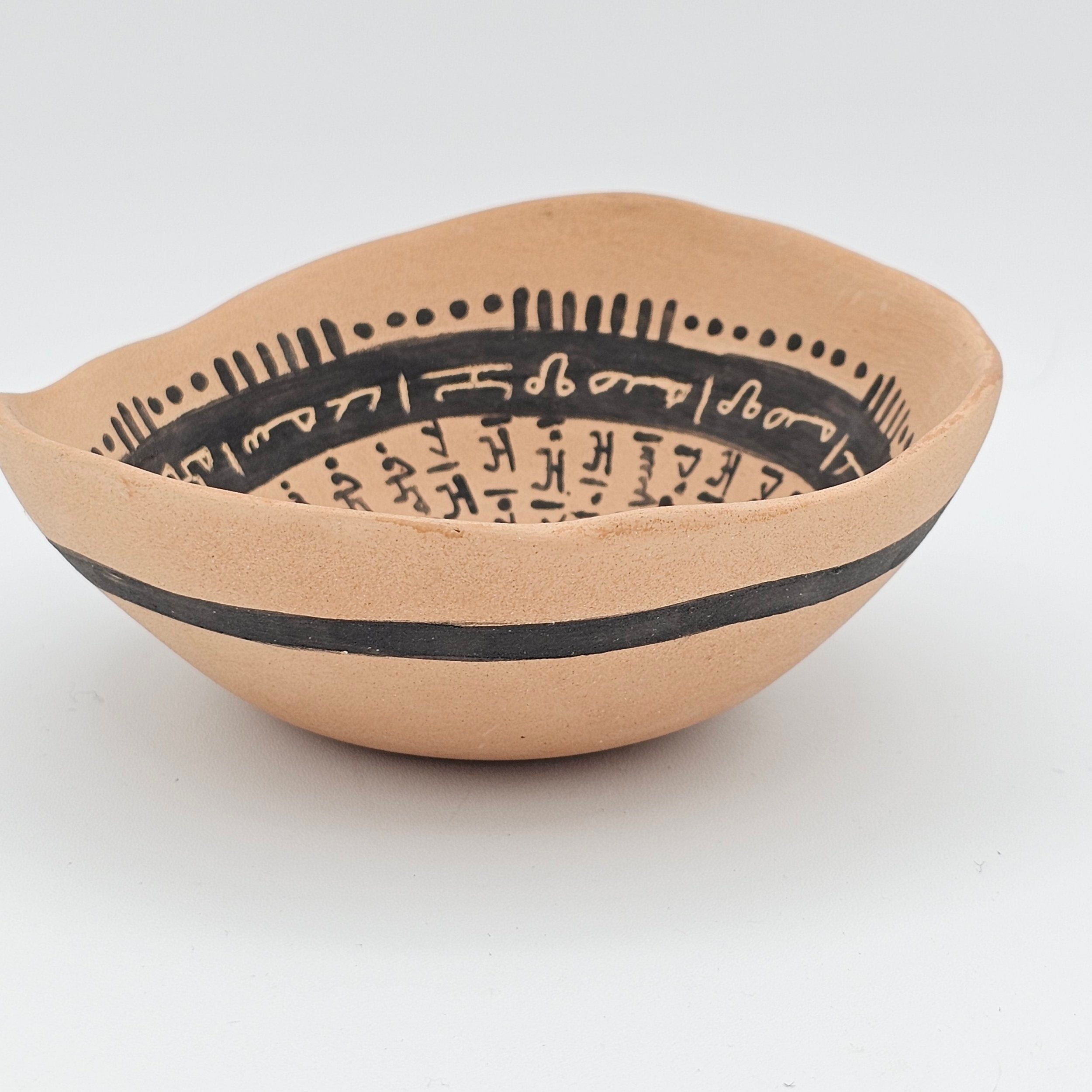 Available in Three different designsThe bowls is inspired by the rich cultural and spiritual traditions of the Mandaeans, an ancient ethno-religious group primarily residing in the southern region of Iran, particularly in Khuzestan. The Mandaeans are known for their deeply rooted spiritual practices, emphasizing purity, water rituals, and prayers for a better life and well-being. These beautifully designed bowls features inscriptions reflective of their sacred texts and beliefs, making them a meaningful piece that carries the essence of blessings, harmony, and a connection to their ancient heritage. Perfect as a decorative or spiritual item, this bowl symbolizes hope and positivity.