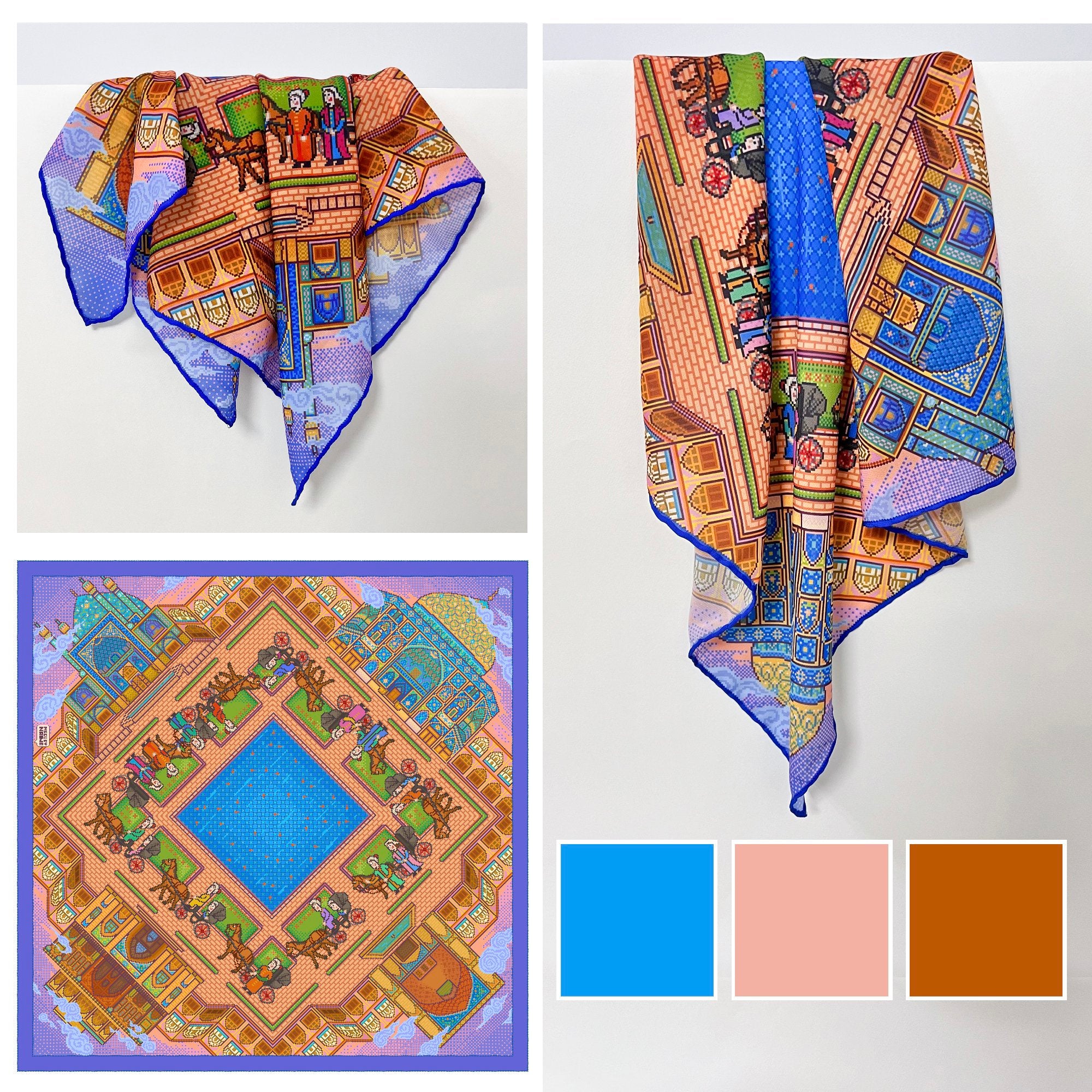 Nagh-s Jahan Pocket Square inspired by Nagh-s Jahan square in Isfahan, Which dates back to the Safavi era (1602 to 1616 AD) in this current form. in this design, four historical buildings located on the four sides of this square ( Ali Qapu, Shah Mosque, Sheikh Lotfollah Mosque, and Qeysari Gate) are depicted. Designed with pixel art technique in 450×450 px By Naime.