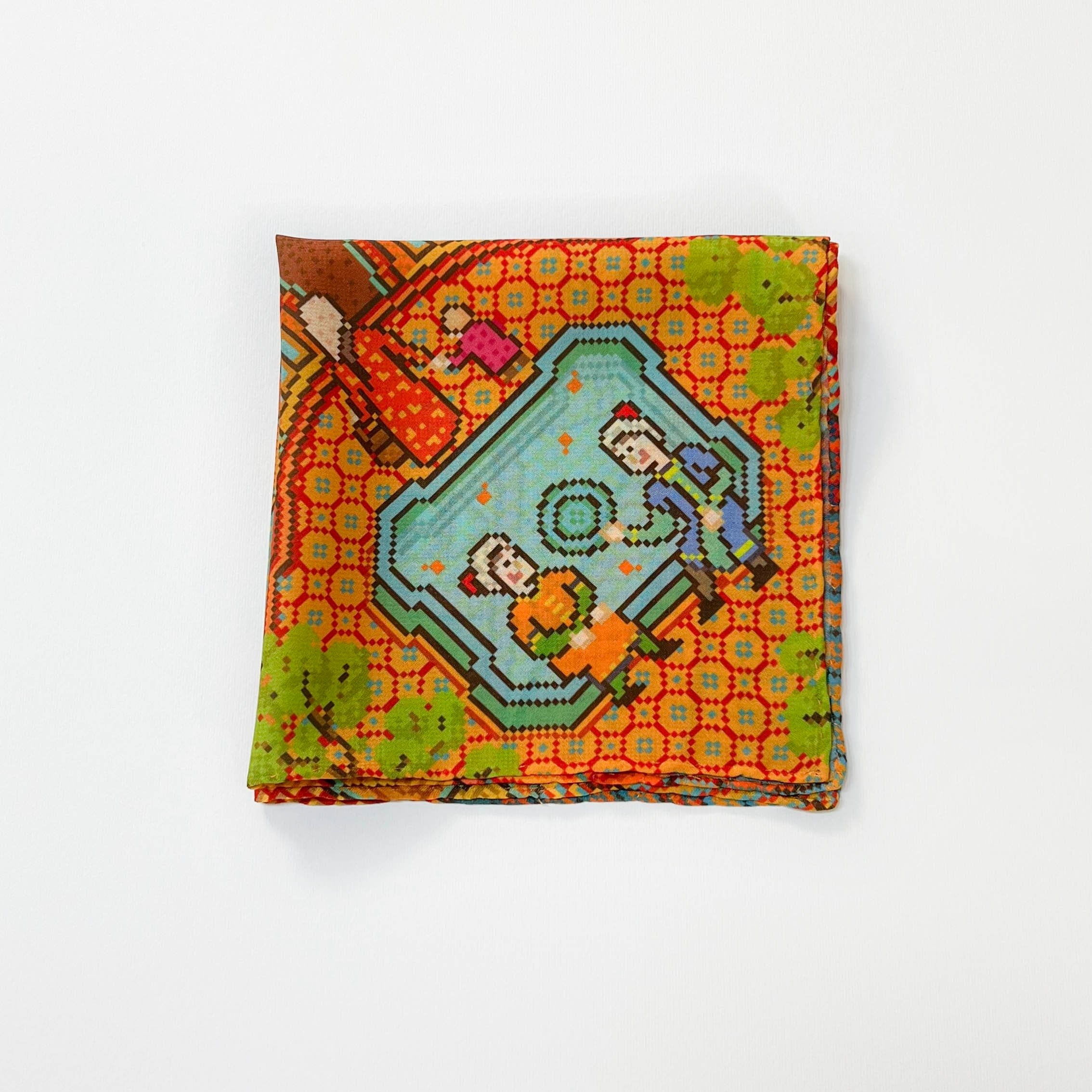 This design is inspired by the grand bazaar of Tabriz. The exact date of construction of this complex is unknown; however, record of travelers visiting this complex in the 4th century AH (1000AD) have been found. In this design, the four corners of this bazaar (Immam Jome Mosque, Mozzafarieh Timche, Amir Carvansaraie, and Amir Timche) are depicted together. Designed with pixel art technique in 220×220 px By Naime.