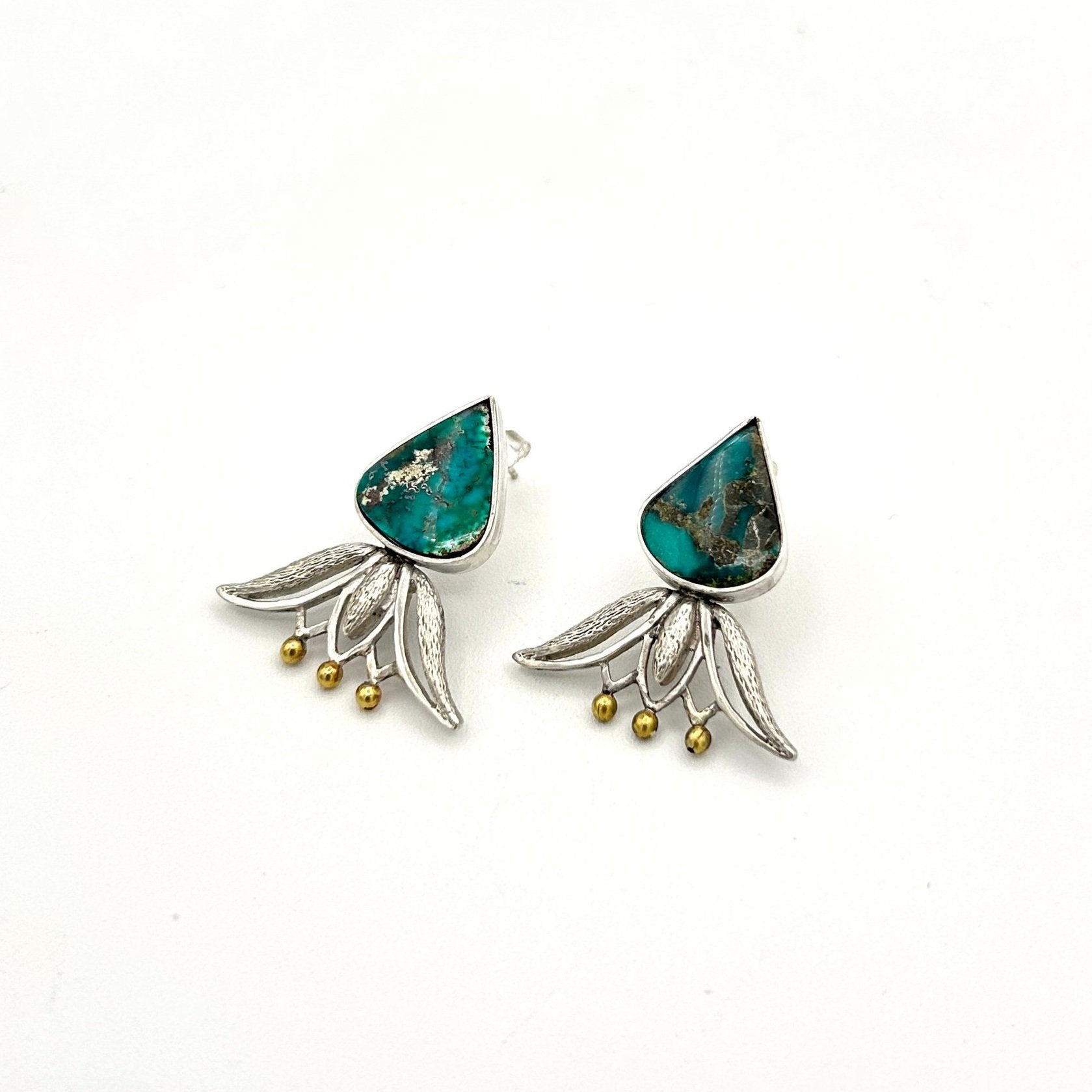Crafted from 925 sterling silver and adorned with turquoise, these Lotus Blossom Earrings feature a 1 1/4-inch drop and a 1-inch width, designed to sit comfortably on the earlobe with a secure push-back closure. To maintain their quality, avoid exposure to water, harsh chemicals, and abrasive cleaners. Store them in a plastic bag when not in use to prevent tarnishing. These handmade earrings combine elegance with durability, making them a refined addition to any jewelry collection.