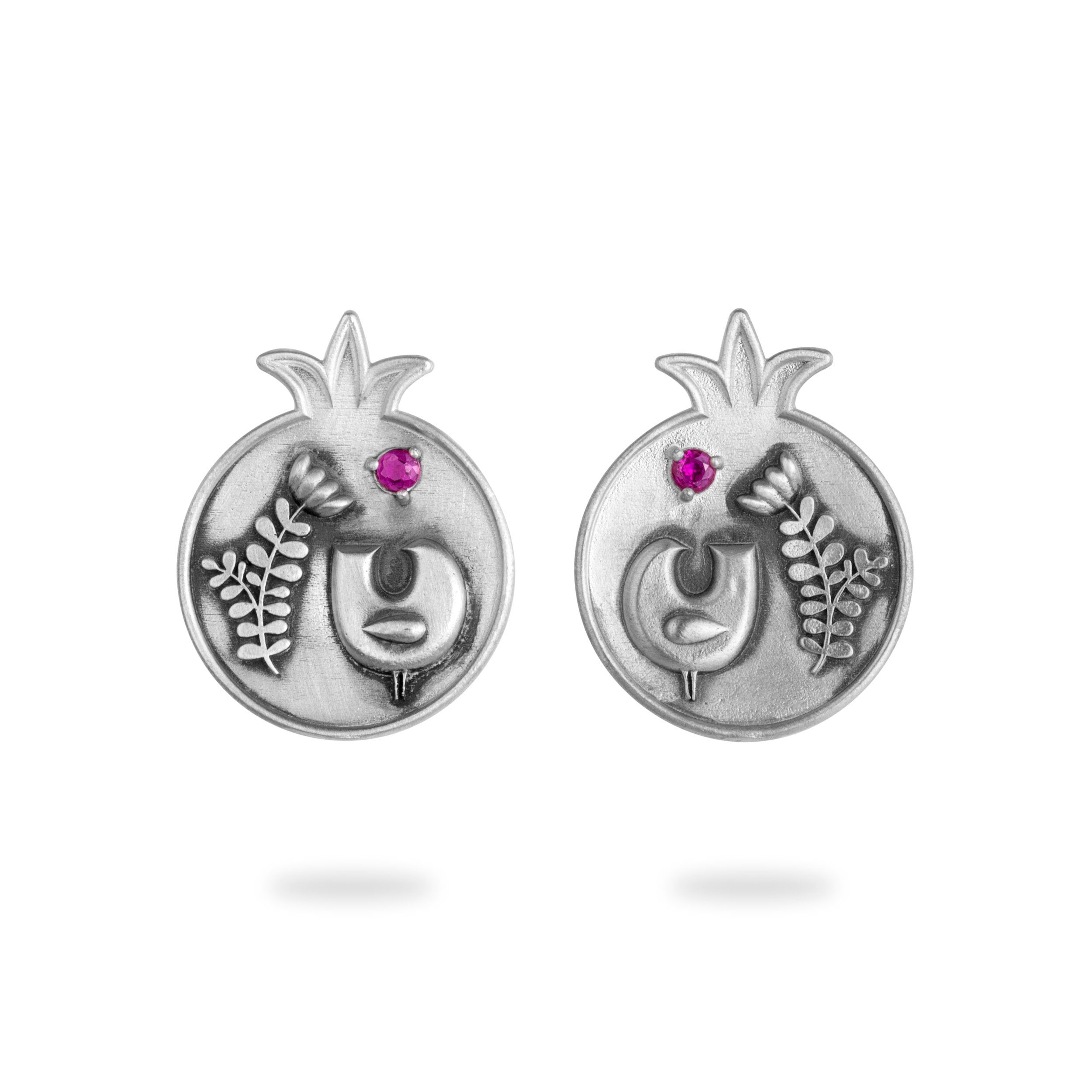 These silver stud earrings feature an intricate Art Nouveau design with pomegranate and bird motifs, accented by a red zircon stone. Crafted from 925 sterling silver, they measure 1.2 inches by 1 inch and are handmade with meticulous attention to detail. Designed for pierced earlobes, they secure with a push-back closure. To maintain their quality, avoid exposure to water and harsh chemicals, store them in a sealed bag when not worn, and clean gently without abrasives.