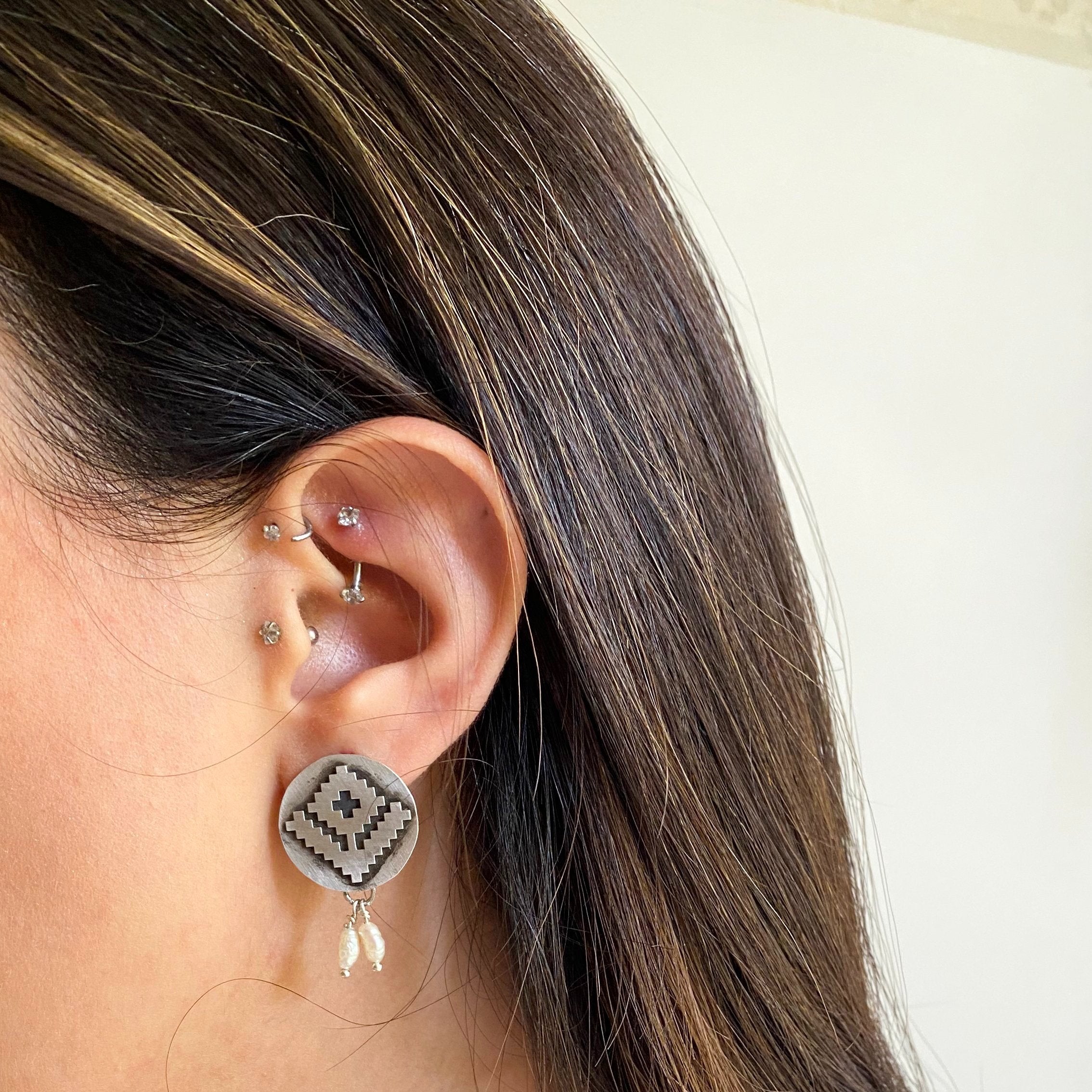 Crafted from 925 sterling silver, these Western Silver Floral Earrings feature genuine pearl drops for an elegant touch. Measuring 1 1/4 inches in length and 3/4 inches in width, they secure comfortably with a push-back closure on the earlobe. Handmade with meticulous attention to detail, these earrings combine quality materials with refined craftsmanship. To maintain their beauty, avoid exposure to water, harsh chemicals, and abrasive cleaners. Store them in a sealed plastic bag when not in use to prevent tarnishing.