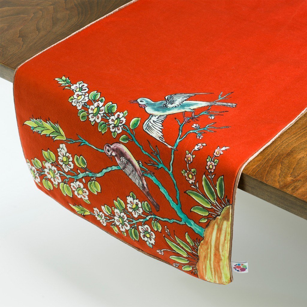 The Baharestan Runner is a rectangular velvet runner measuring 50" long and 13" wide, weighing 0.5 lb. It comes in two color options.