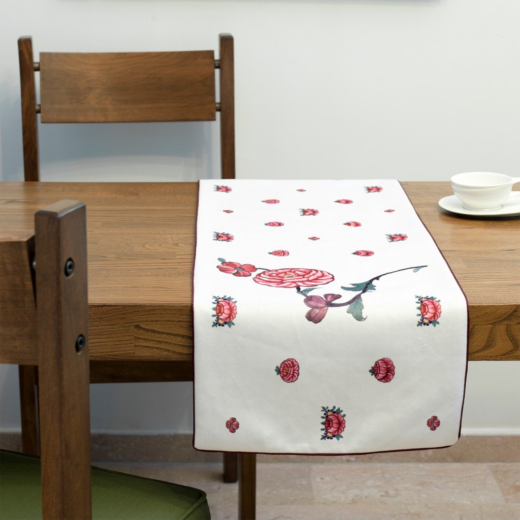 This velvet Rose Table Runner measures 53 1/4 inches long and 13 3/4 inches wide, featuring a rectangular shape and weighing 0.5 pounds.