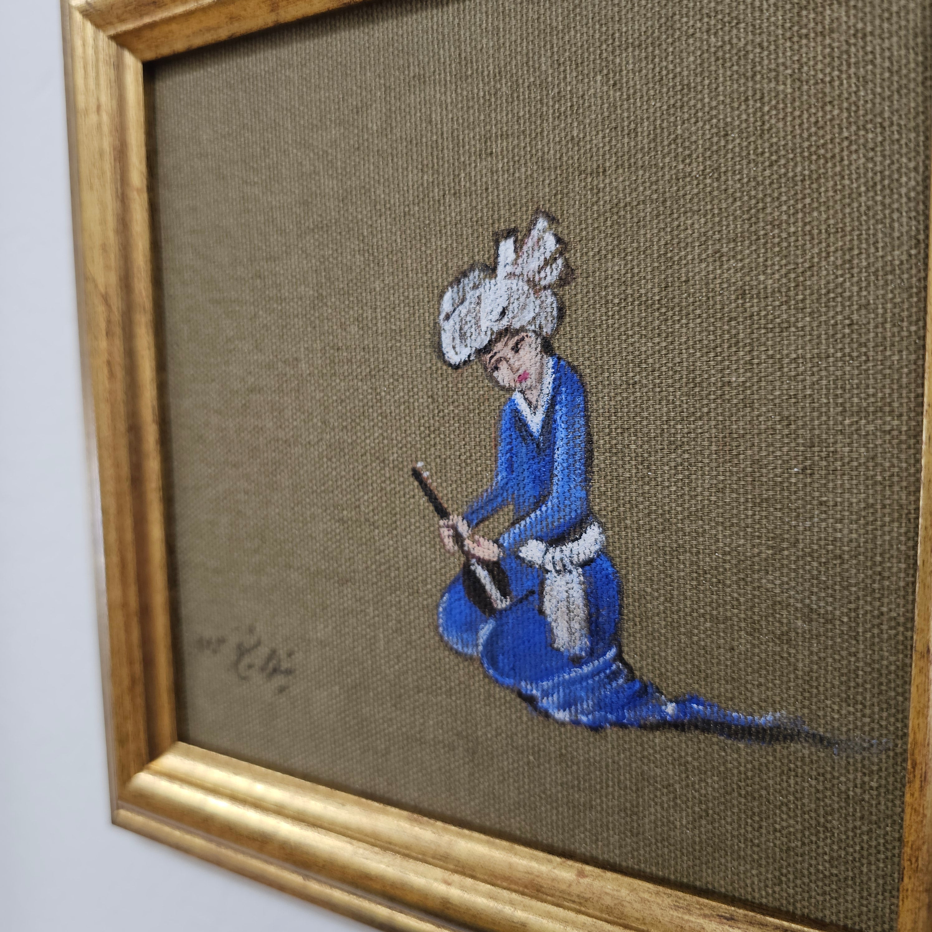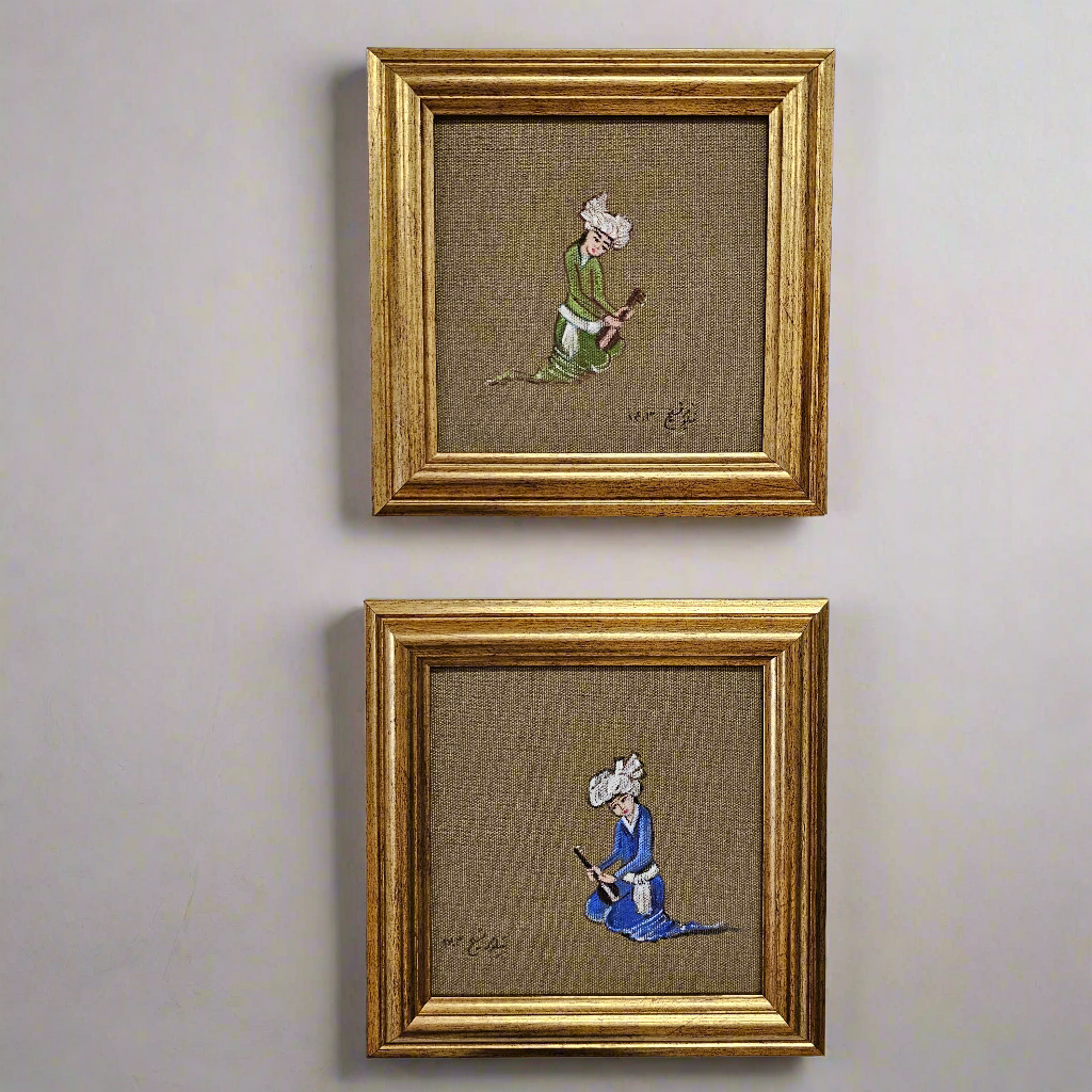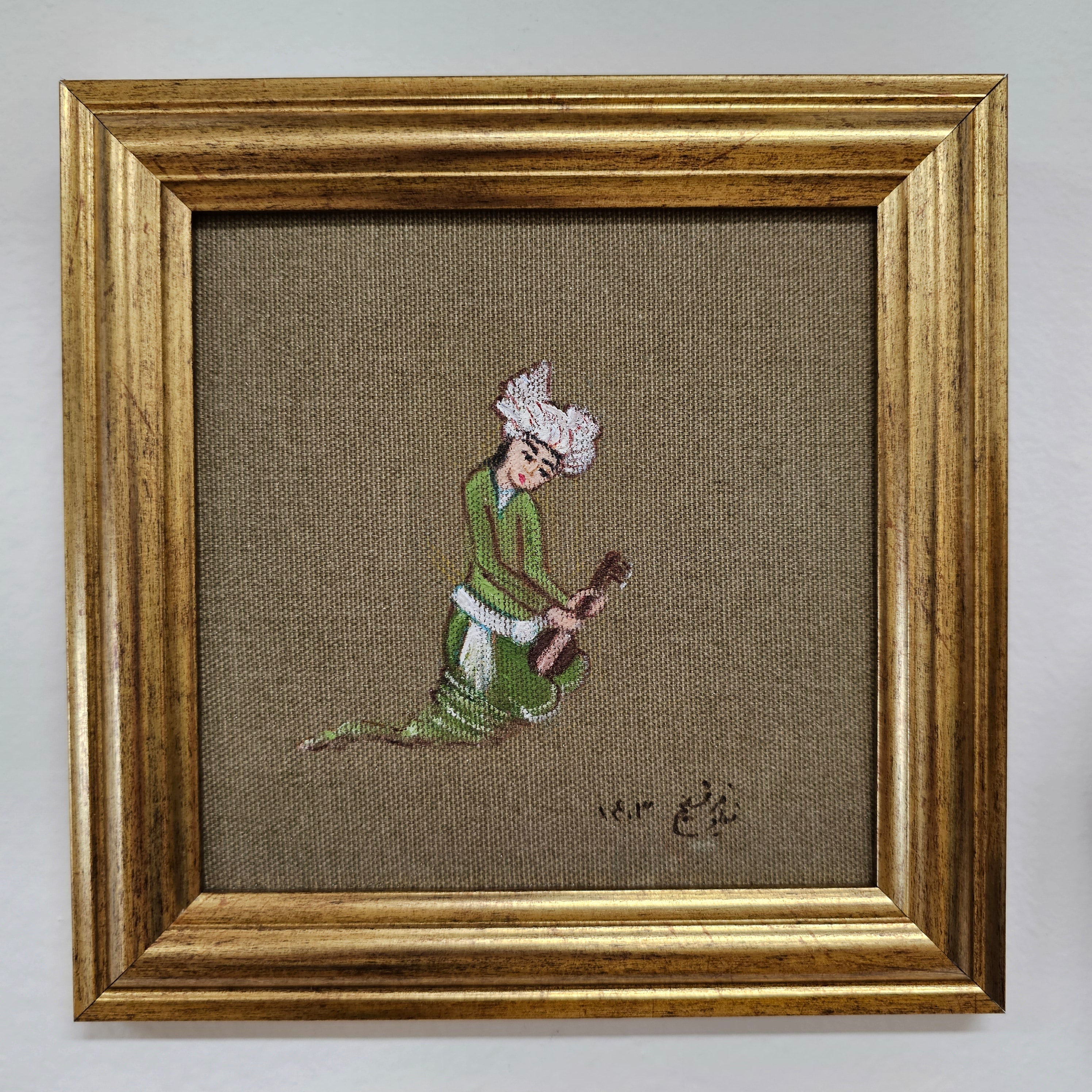 This 6" x 6" fabric painting depicts a Sufi playing the tar, capturing a moment of spiritual harmony in Persian style. Each piece is signed by Niloufar Sheikh and comes in two unique designs.